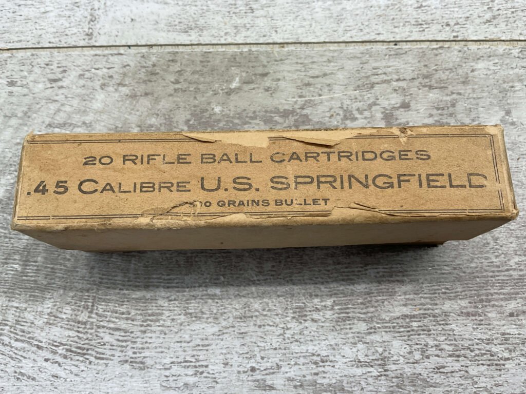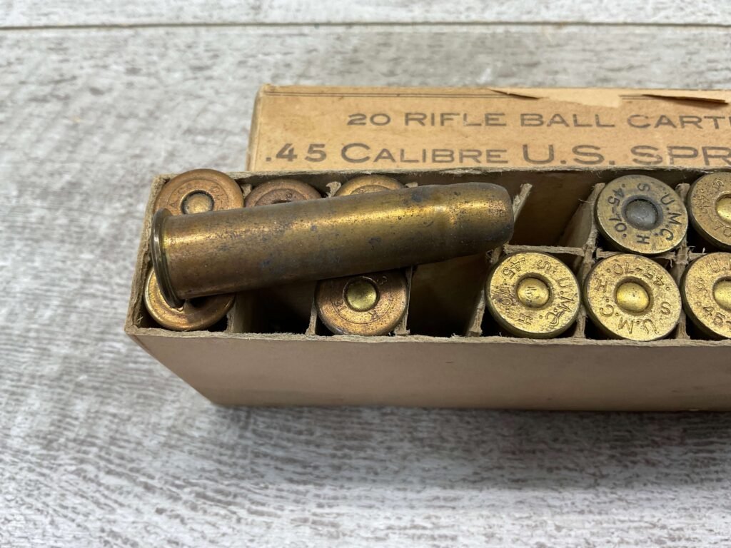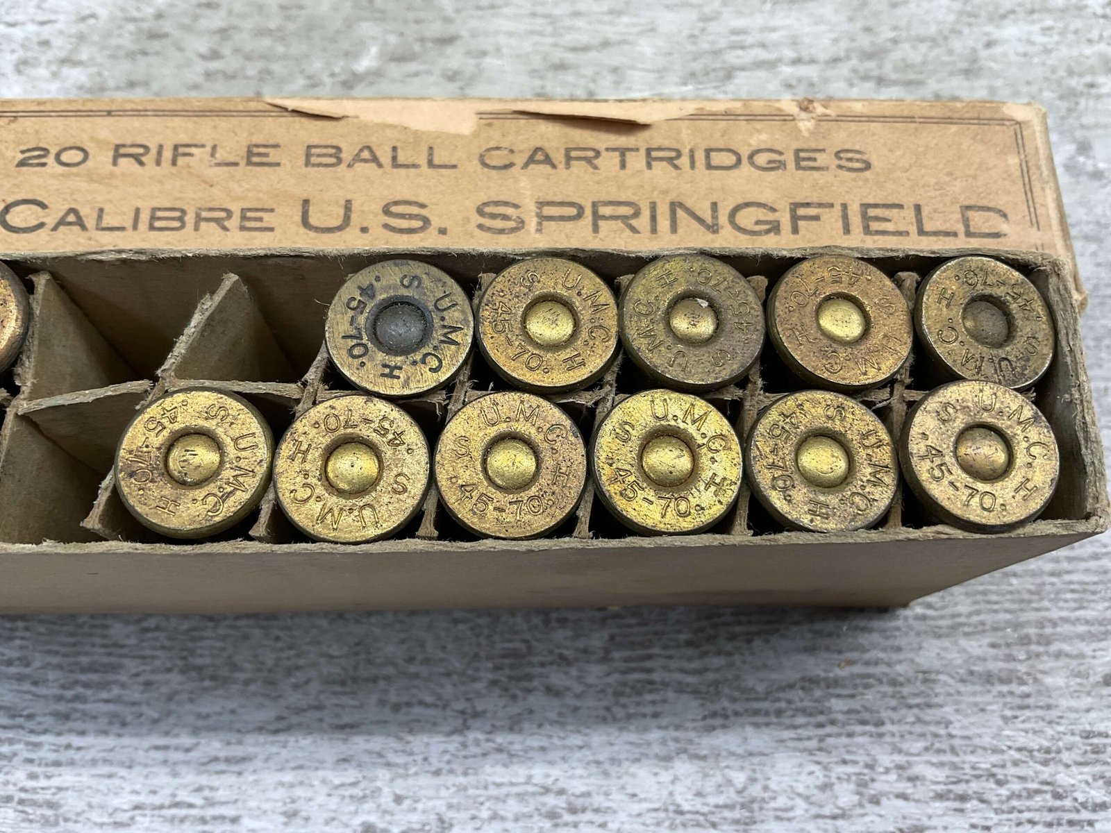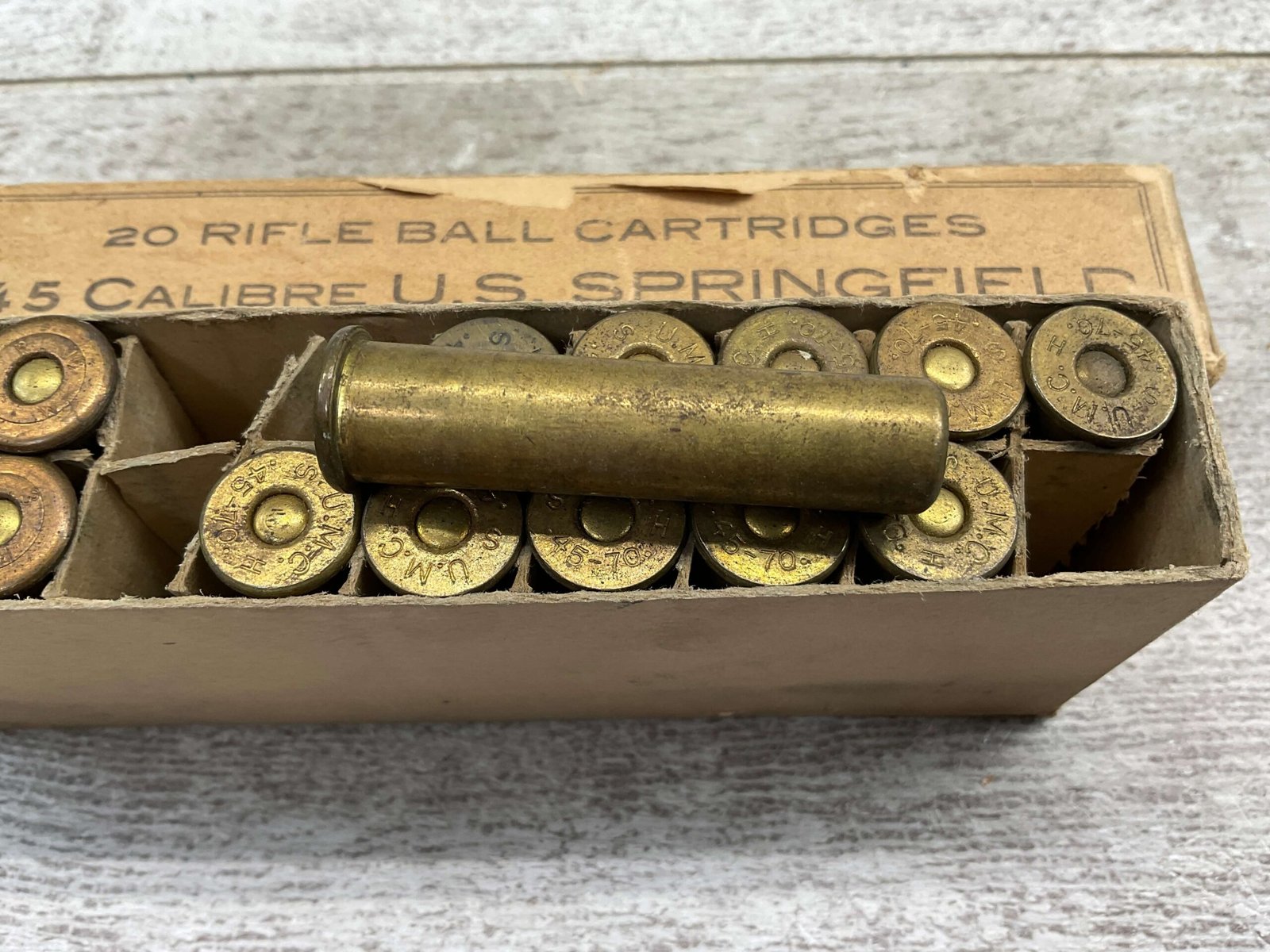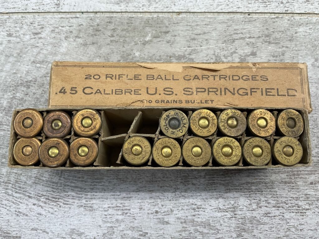 U.S. SPRINGFIELD .45-70 MIXED AMMO, CONTAINS QTY 11 U.M.C. HEADSTAMP, AND QTY 6 WINCHESTER HEADSTAMP. BOX IS IN VERY GOOD CONDITION.
