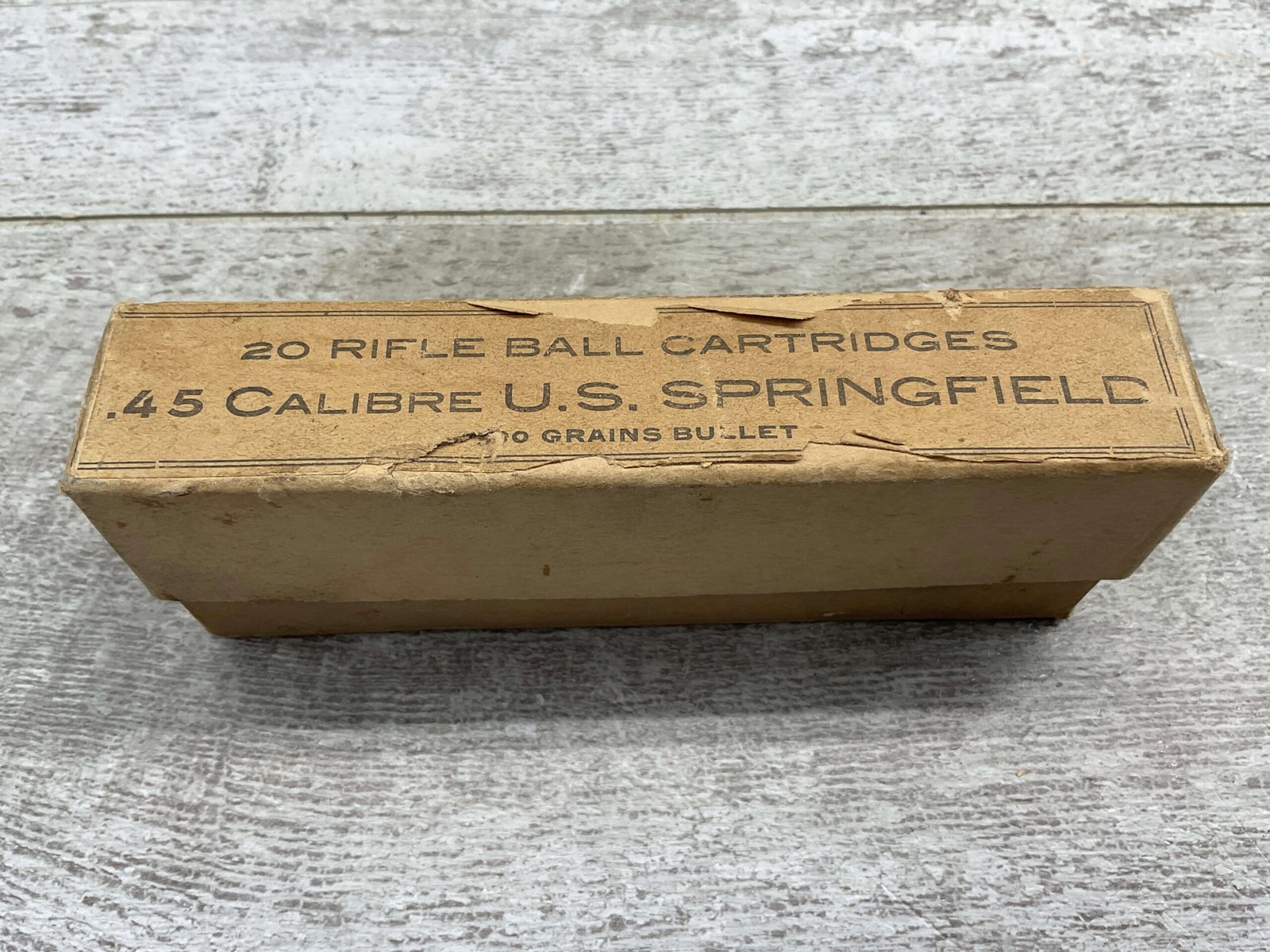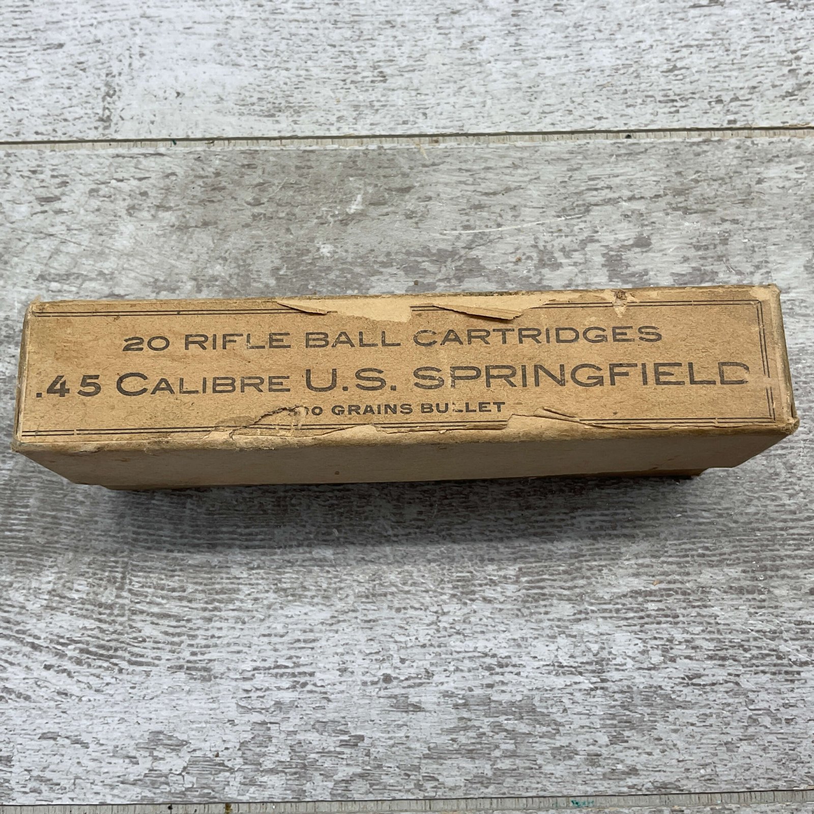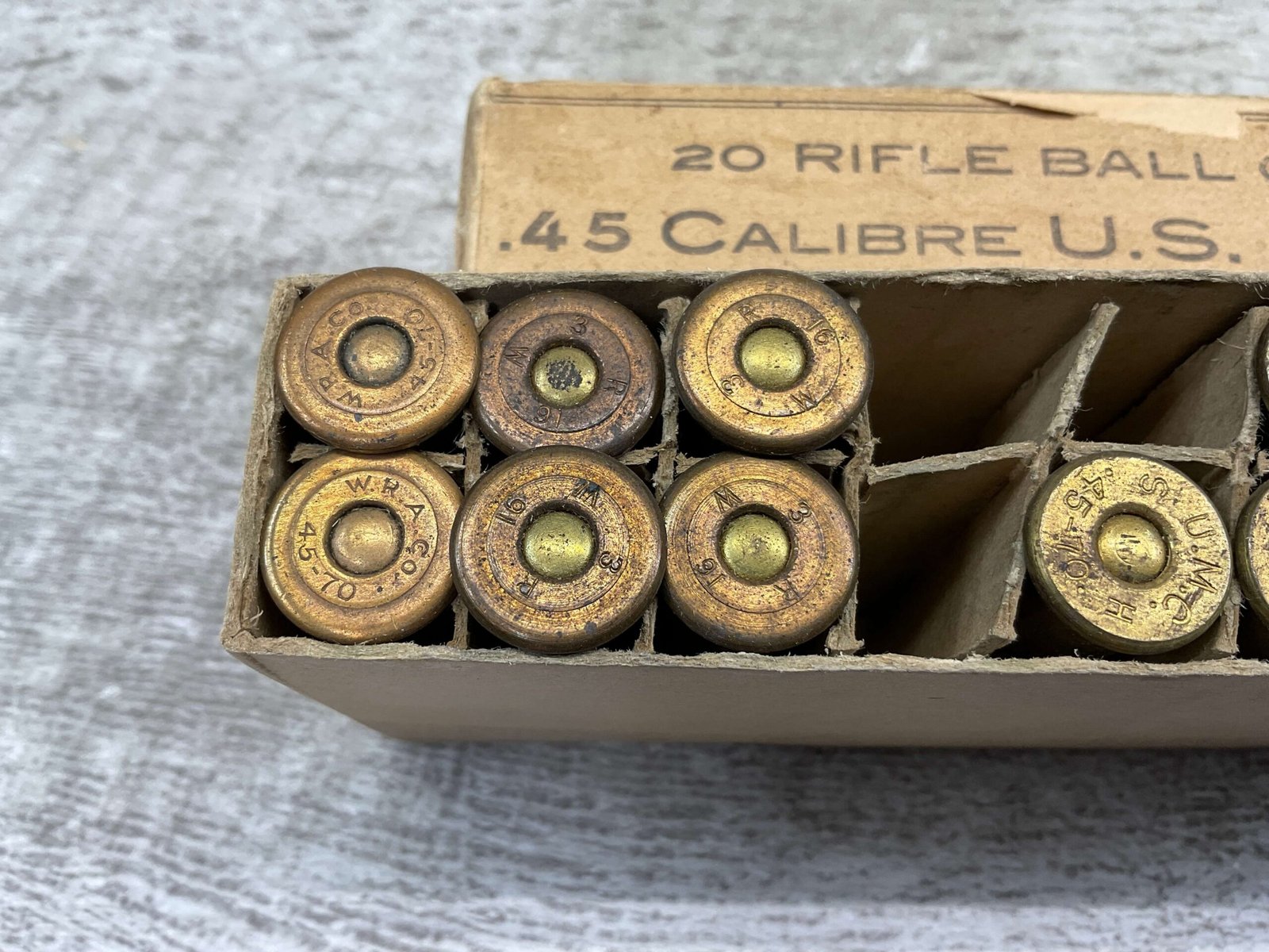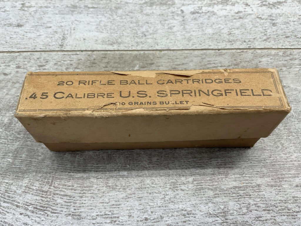 U.S. SPRINGFIELD .45-70 MIXED AMMO, CONTAINS QTY 11 U.M.C. HEADSTAMP, AND QTY 6 WINCHESTER HEADSTAMP. BOX IS IN VERY GOOD CONDITION.