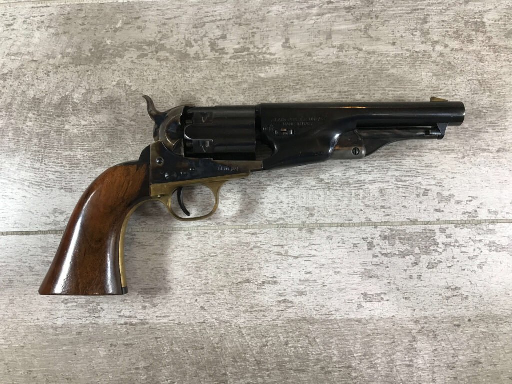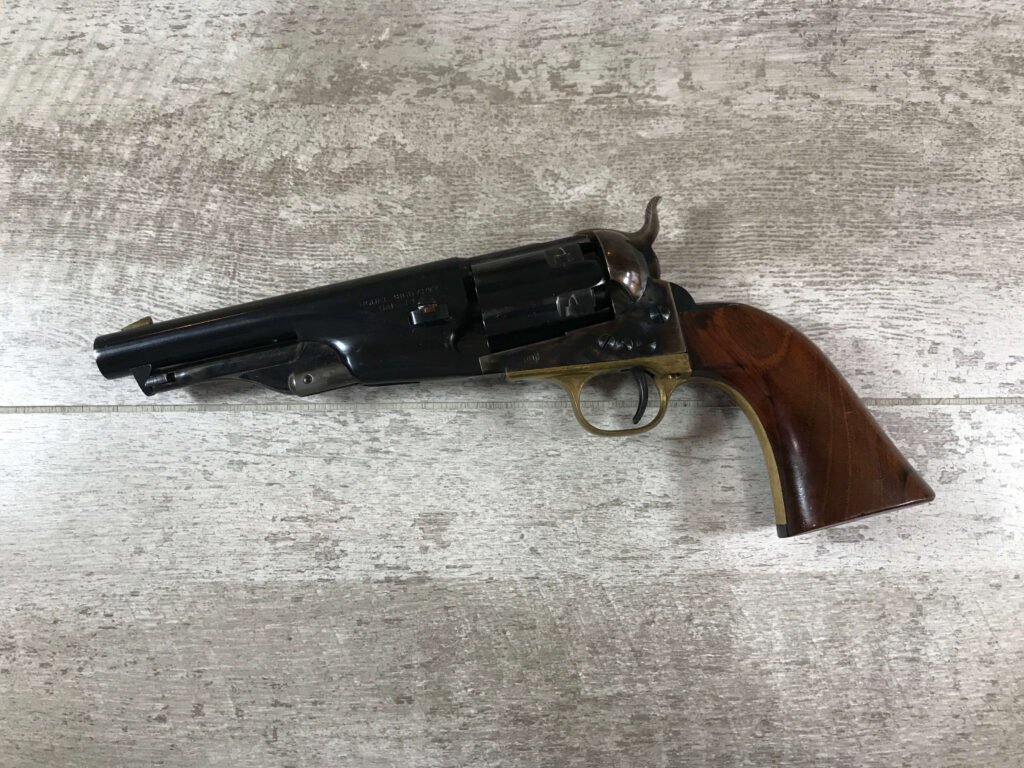 UBERTI 1860 ARMY FLUTED CYLINDER .44 BLACK POWDER REVOLVER #66493, COLOR CASE-HARDENED STEEL FRAME, BLUED STEEL 5 1/2″ BARREL, WALNUT GRIPS, BRASS TRIGGER GUARD, NEVER FIRED, 99+%
