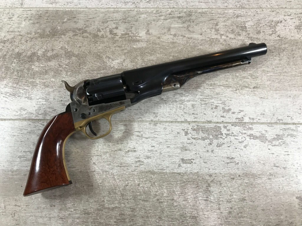 UBERTI 1860 ARMY FLUTED CYLINDER .44 BLACK POWDER REVOLVER #A43843, COLOR CASE-HARDENED STEEL FRAME, BLUED STEEL 8″ BARREL, WALNUT GRIPS, BRASS TRIGGER GUARD, NEVER FIRED, 99+%