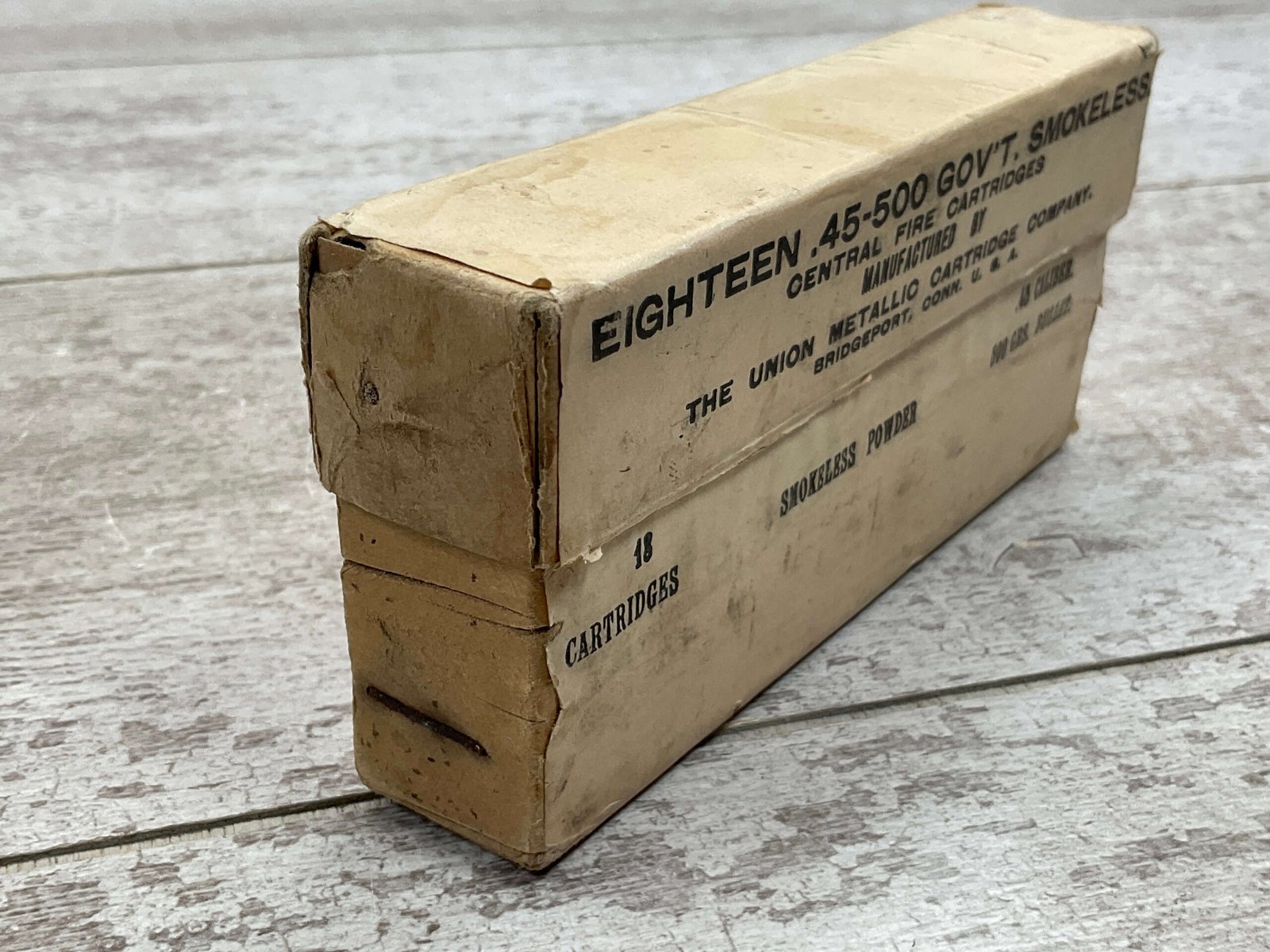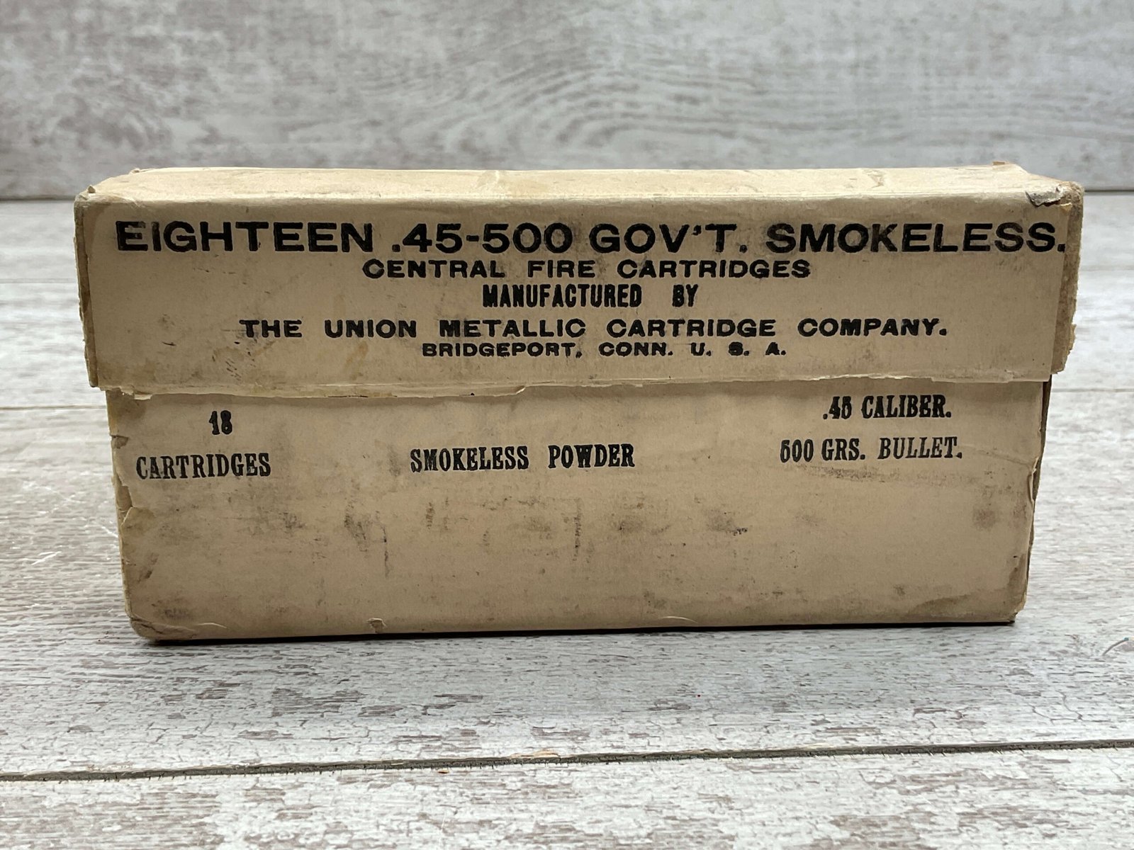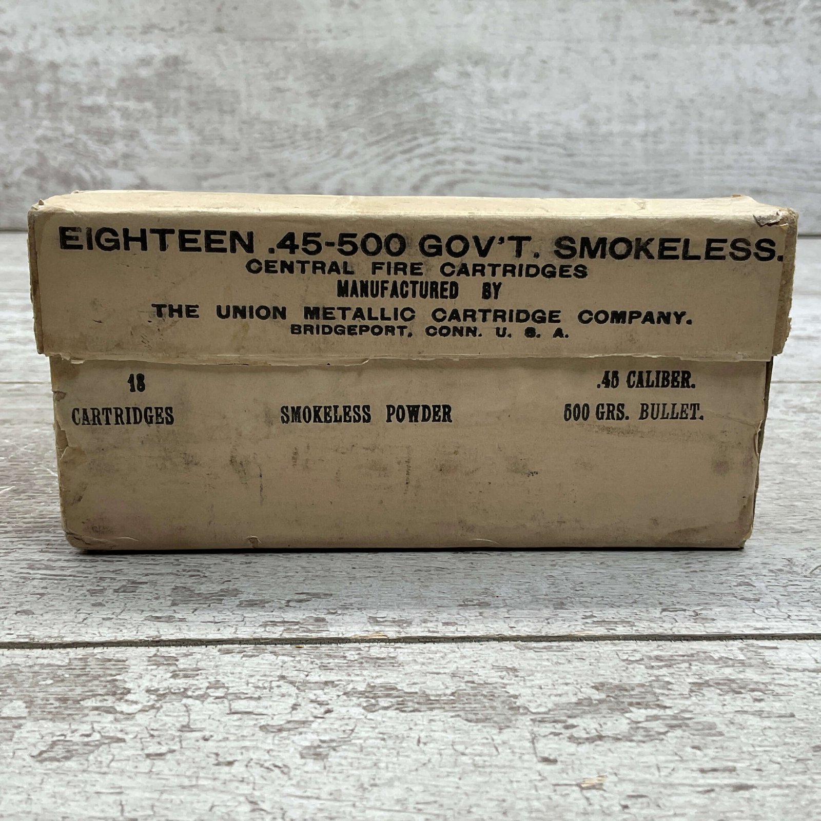 UMC .45-500 GOVERNMENT SMOKELESS, EMPTY BOX, VINTAGE, GOOD OVERALL CONDITION, DISPLAYS WELL.