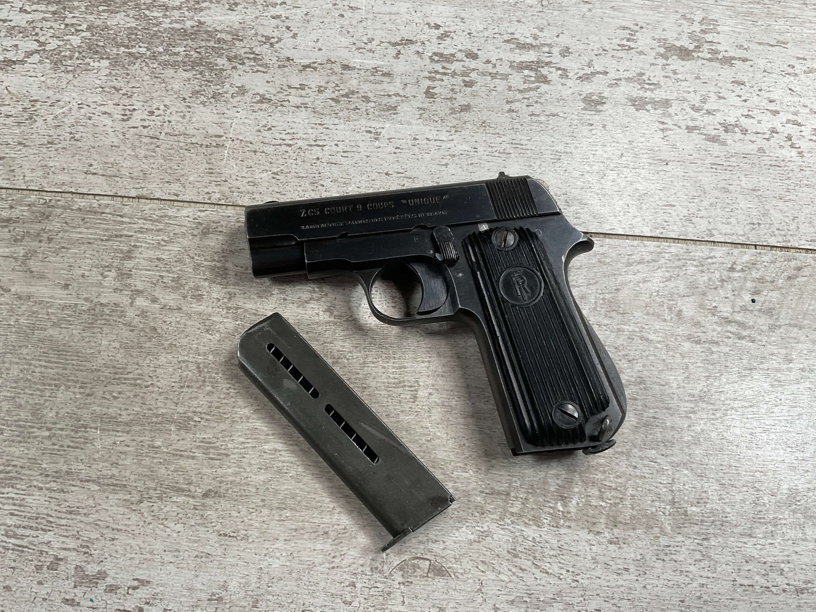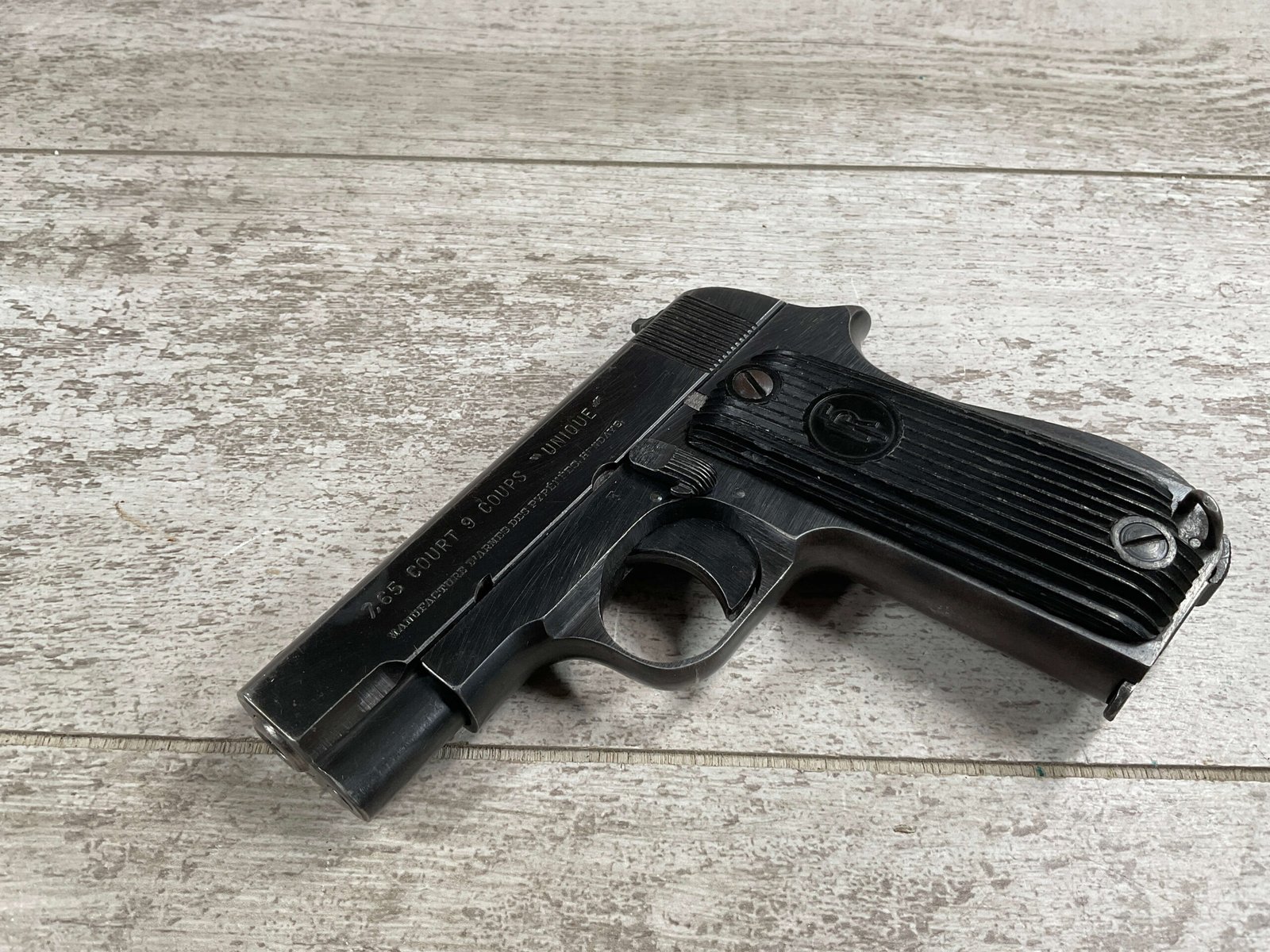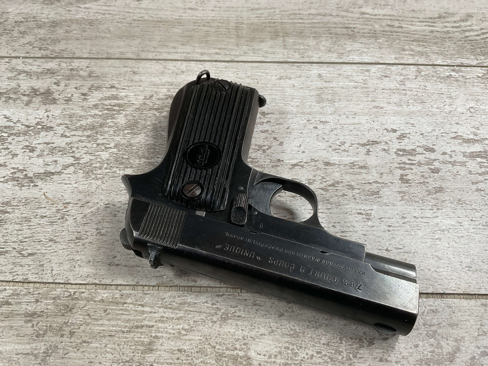 UNIQUE MODEL 17 7.65MM MATCHING PISTOL RIG #103112 , 7.65MM, 95+% ORIGINAL POST WAR MILITARY BLUE W/HIGH EDGE & SLIGHT HOLSTER WEAR, 3 1/4″ BARREL, EXC BRIGHT BORE & RIFLING (9.5/10), EXC VERTICALLY GROOVED PLASTIC GRIPS MARKED “7.65MM/9 SCHUSS”, THE LEFT SIDE OF THE SLIDE MARKED “7.65 COURT 9 COUPS “UNIQUE”/MANUFACTURE D’ARMES DES PYRENEES HENDAYE”, SERIAL NUMBER ON RIGHT SIDE OF FRAME, ONE NON MATCHING MAGAZINE, MADE UNDER GERMAN OCCUPATION, FRENCH MILITARY ISSUE, 95+% OVERALL