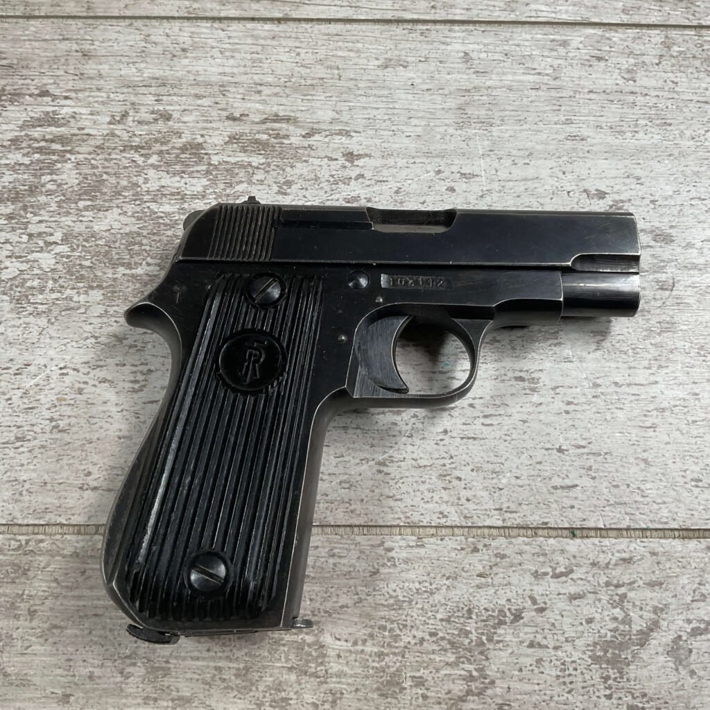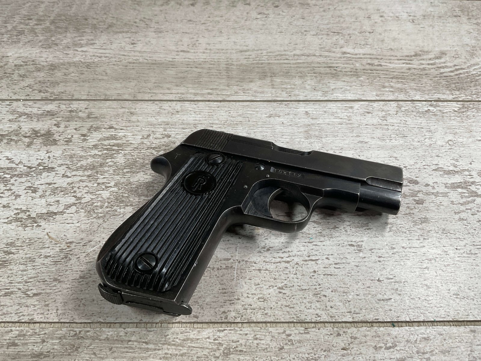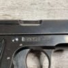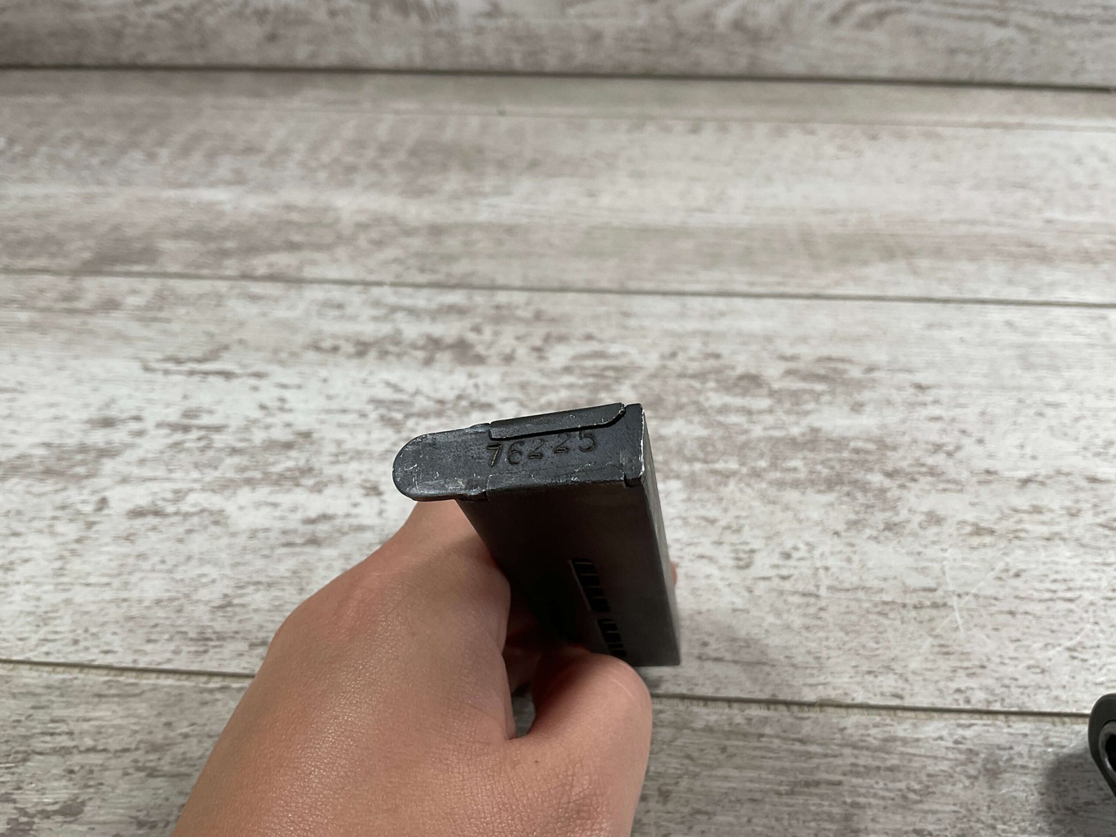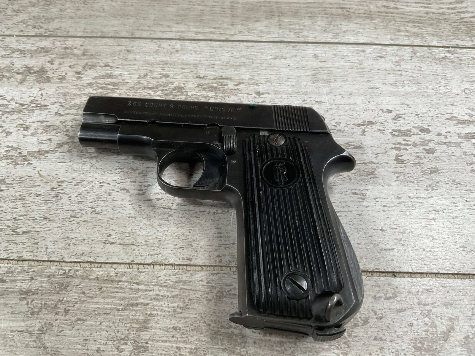 UNIQUE MODEL 17 7.65MM MATCHING PISTOL RIG #103112 , 7.65MM, 95+% ORIGINAL POST WAR MILITARY BLUE W/HIGH EDGE & SLIGHT HOLSTER WEAR, 3 1/4″ BARREL, EXC BRIGHT BORE & RIFLING (9.5/10), EXC VERTICALLY GROOVED PLASTIC GRIPS MARKED “7.65MM/9 SCHUSS”, THE LEFT SIDE OF THE SLIDE MARKED “7.65 COURT 9 COUPS “UNIQUE”/MANUFACTURE D’ARMES DES PYRENEES HENDAYE”, SERIAL NUMBER ON RIGHT SIDE OF FRAME, ONE NON MATCHING MAGAZINE, MADE UNDER GERMAN OCCUPATION, FRENCH MILITARY ISSUE, 95+% OVERALL
