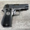 UNIQUE MODEL RR51 MOROCCAN POLICE 7.65MM MATCHING SEMI AUTO PISTOL, #110852, 90+% ORIGINAL POST WAR MILITARY BLUE W/HIGH EDGE & SLIGHT HOLSTER WEAR, 3 1/4″ BARREL, VG BRIGHT BORE & RIFLING (8/10), EXC VERTICALLY GROOVED PLASTIC GRIPS W/ LIGHT WEAR, LEFT SIDE OF SLIDE MARKED “7.65 COURT 9 COUPS “UNIQUE”/MANUFACTURE D’ARMES DES PYRENEES HENDAYE”, SERIAL NUMBER ON RIGHT SIDE OF FRAME, “T” MARK ON THE RIGHT SIDE LEFT OF GRIP (“PALM TREE” INDICATING DELIVERED TO MOROCCAN POLICE), ONE (UNMARKED) 9 ROUND MAGAZINE, MADE UNDER GERMAN OCCUPATION, 90+% OVERALL
