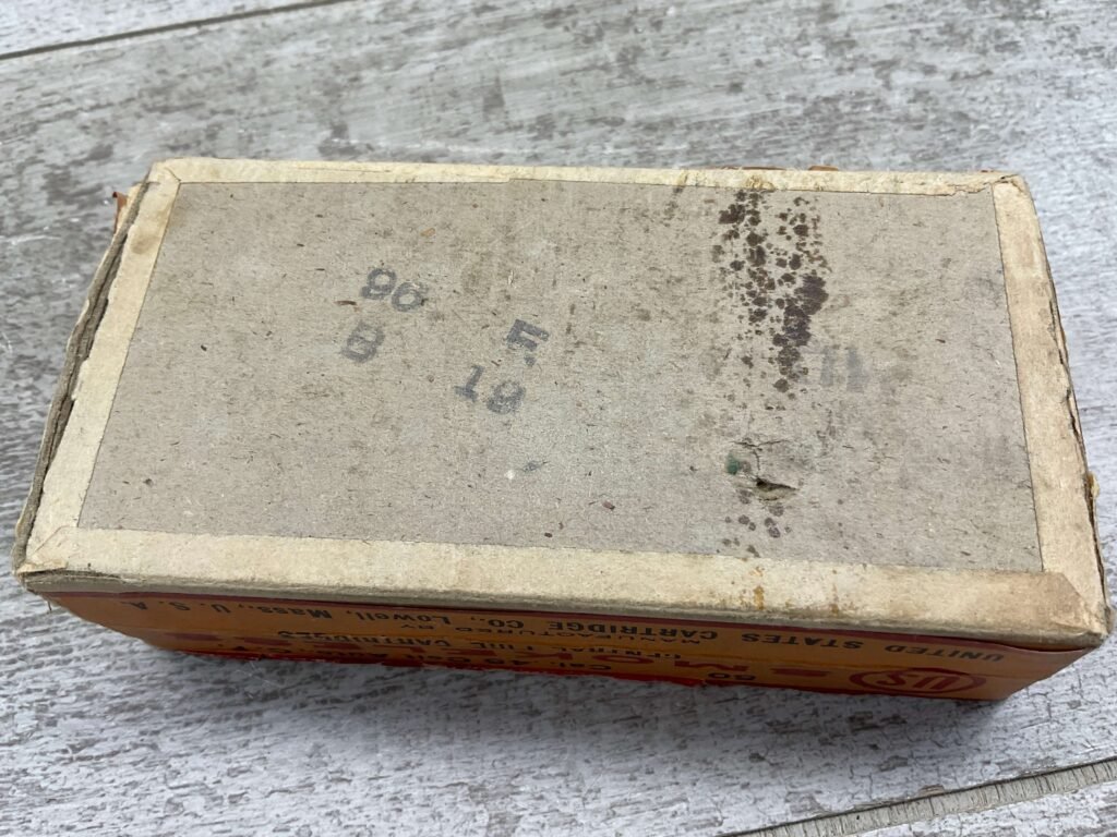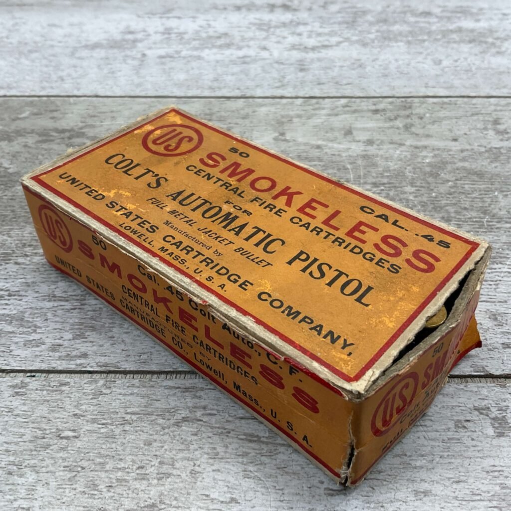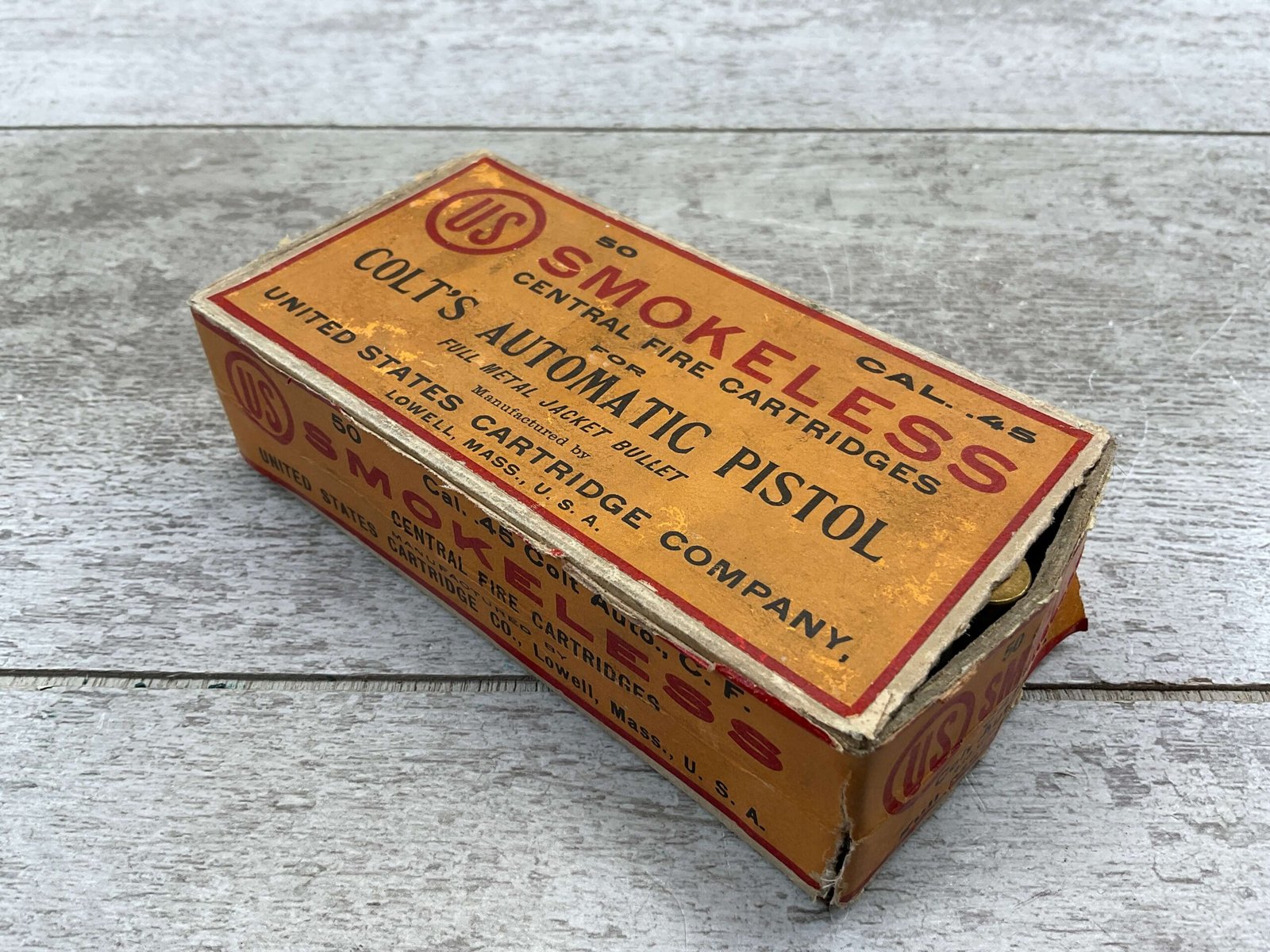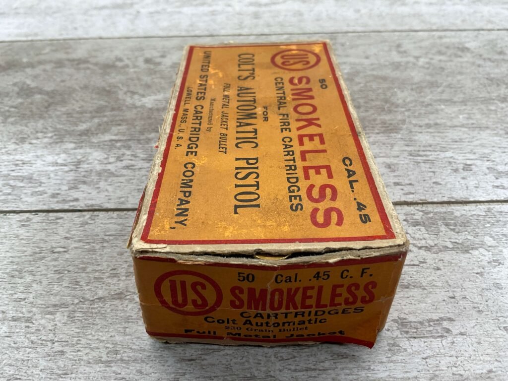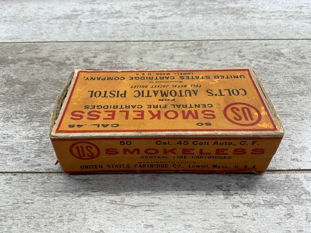 UNITED STATES CARTRIDGE CO .45CAL FMJ AMMO, QTY 50, NEVER FIRED, NEW IN BOX, RARE, BOX IS IN GOOD COND W/MINOR WEAR & TEARS