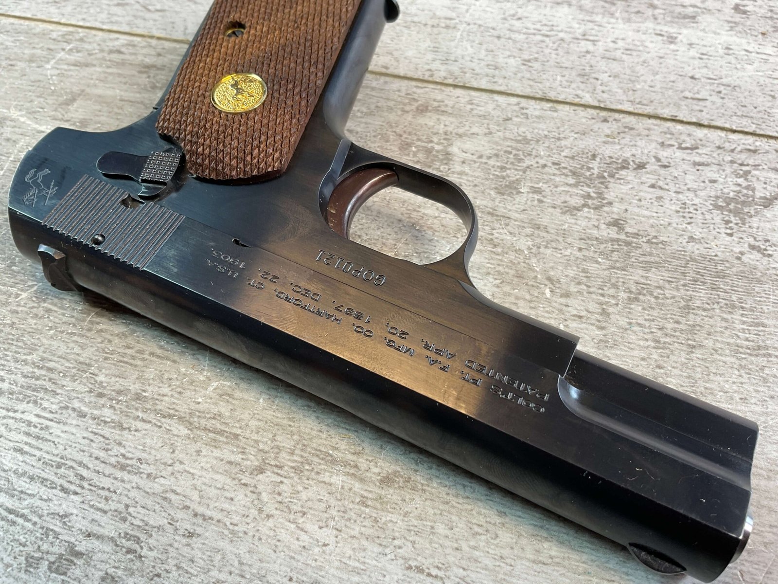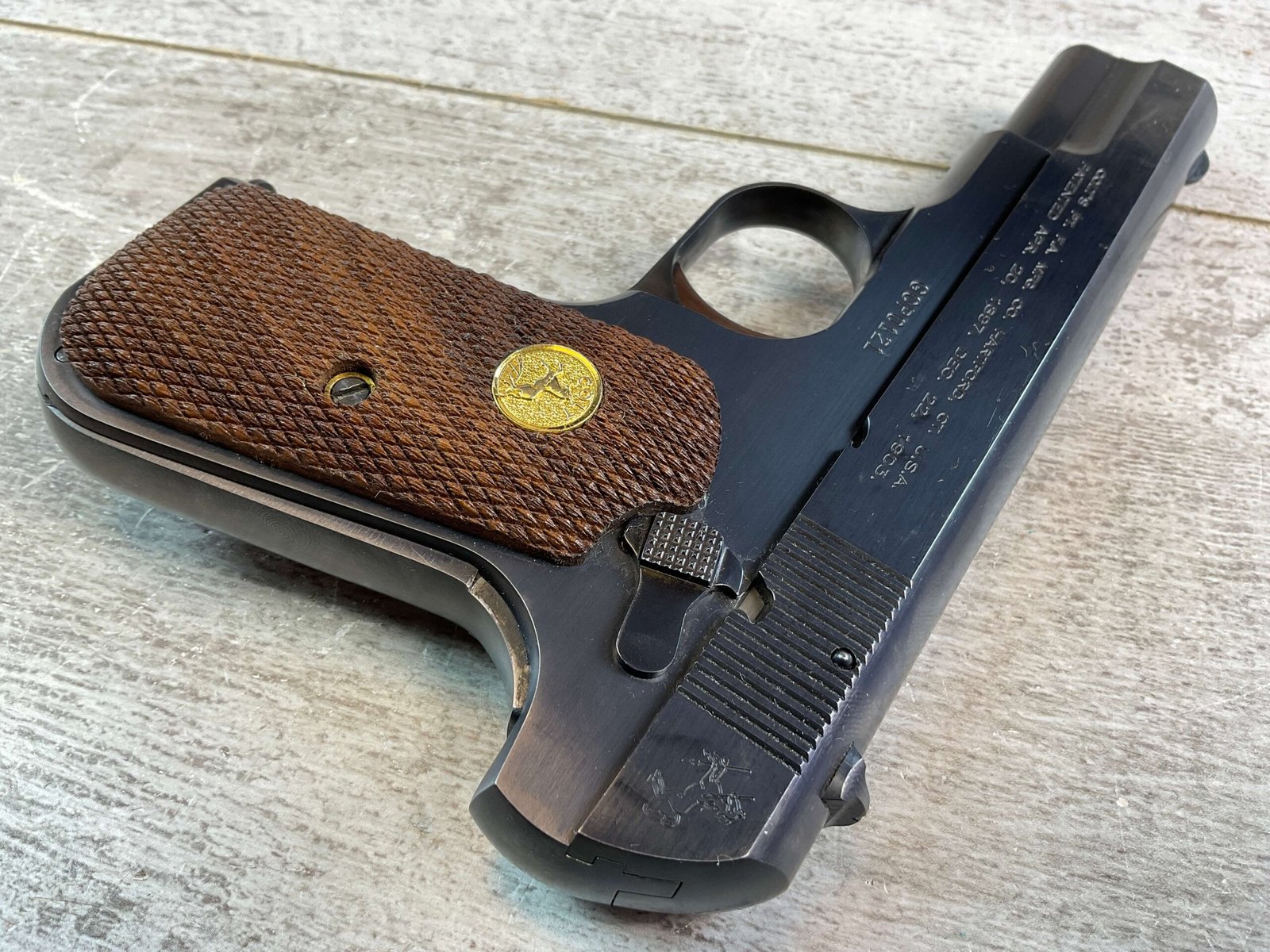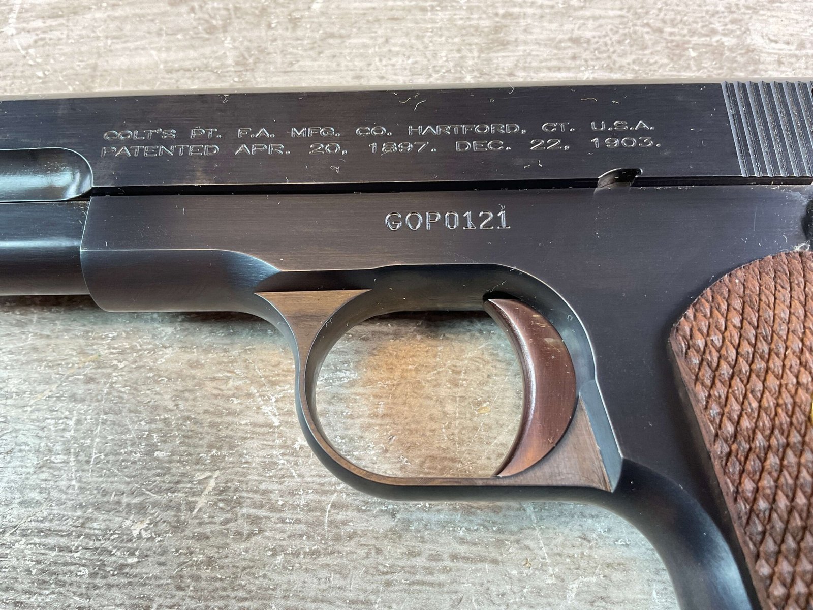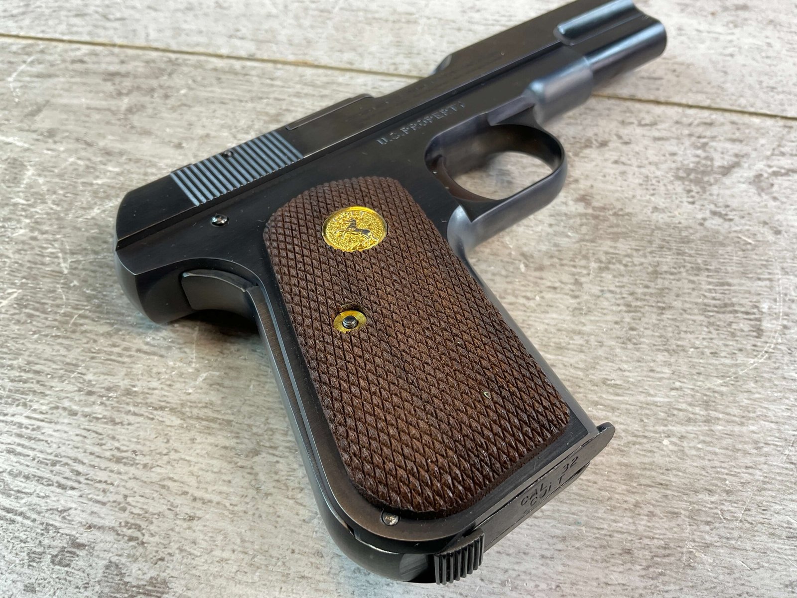 US ARMAMENT MFG, COLT 1903 POCKET HAMMERLESS .32ACP SEMI AUTO PISTOL #GOPO121, MODEL M SINGLE ACTION BLOWBACK, BLUED 3 3/4″ BBL, RIGHT SIDE STAMPED “COLT AUTOMATIC CALIBRE 32 RIMLESS SMOKELESS US PROPERTY”, WOOD GRIPS, (5) 8 RND MAGAZINES, NEW OLD STOCK, 99+%
