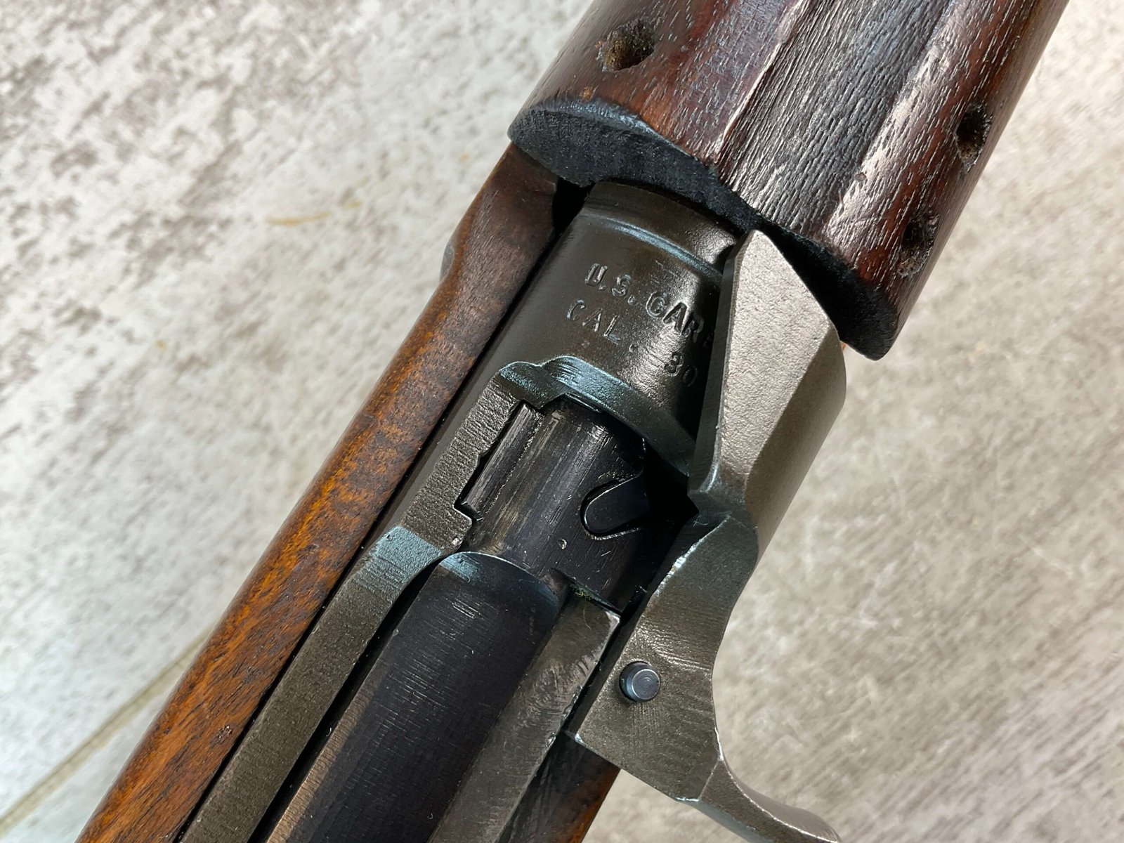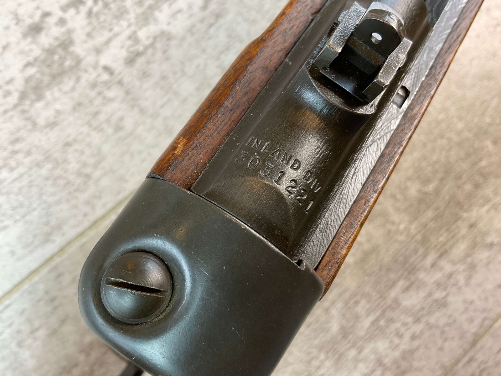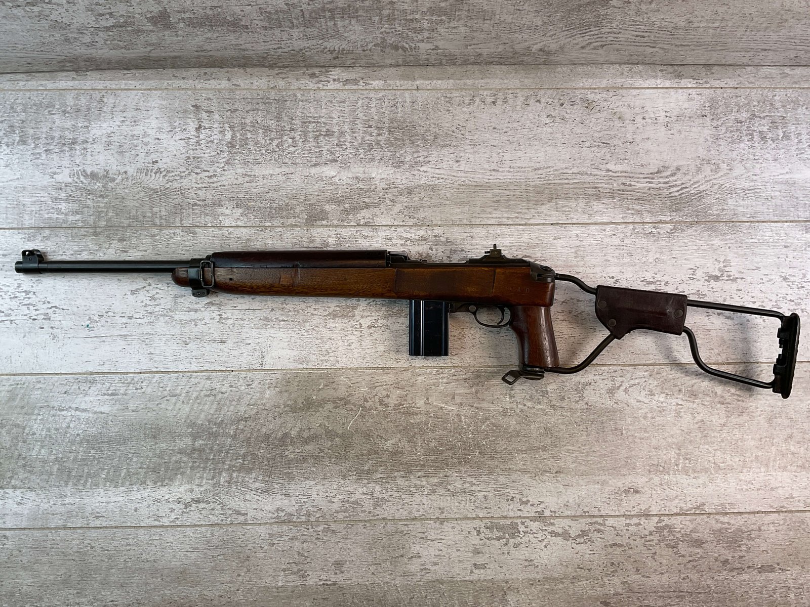 US CARBINE INLAND .30 CARBINE M1A1 PARATROOPER CARBINE SEMI AUTO RIFLE, JAMES EARL JONES COLLECTION, ARSENAL REWORKED #5031221, 18″ BARREL MARKED “INLAND MFG DIV / GENERAL MOTORS / 2/44”, EXC MIRROR BORE & RIFLING, “OI” STAMP ON INSIDE OF BARREL CHANNEL, “B257614* CAST W/SUNBURST IN A CIRCLE IN THE BUTT PLATE, EXC ORIGINAL PARKERIZATION, P ON GRIP, MEDIUM CROSS CANNONS ON RIGHT SIDE OF GRIP (2ND RODUCTION RUN), “AAO (AUGUSTA ARSENAL ORDNANCE)” STAMPED ON LEDT SIDE OF STOCK, 4 RIVET SHALLOW GROOVE HANDGUARD MARKED “OI”, REAR FLIP SIGHT, “OI” MARKED FLAT BOLT, HAND GRIP MARKED “RI / 3”, TYPE II BARREL BAND, TYPE I REAR SIGHT MARKED “S” ON LEFT SIDE & “N-A” ON RIGHT (NPM), TYPE I-A FRONT SIGHT W/”N” STAMP, “PI” MARKED SLIDE, INLAND RECEIVER, “RI” MARKED TRIGGER & SEAR, “IN” MARKED HAMMER, CONDITION AS SHOWN IN PICTURES, FROM THE JAMES EARL JONES “FAVORITES” COLLECTION W/ CERTIFICATE OF AUTHENTICITY.