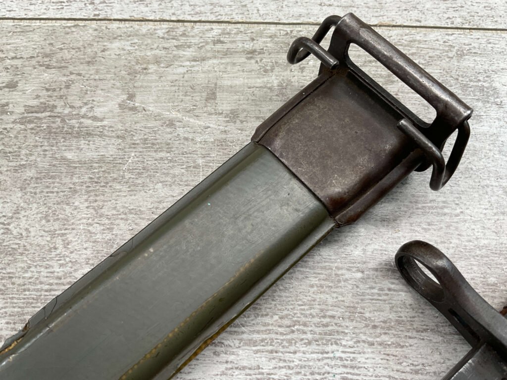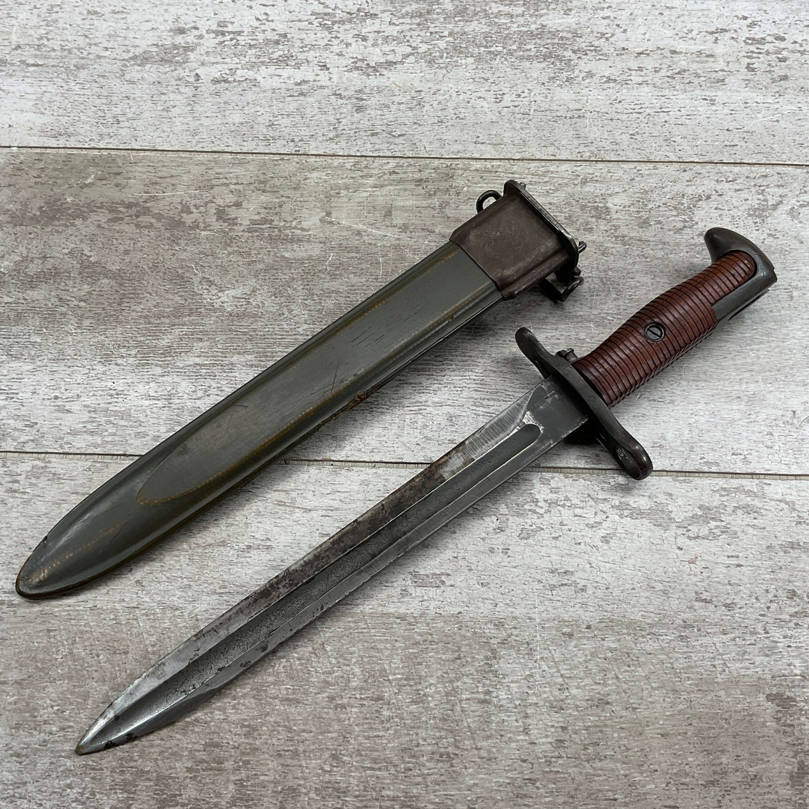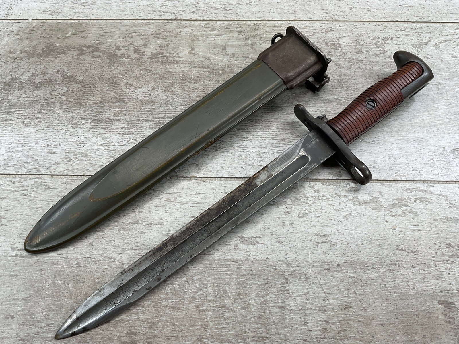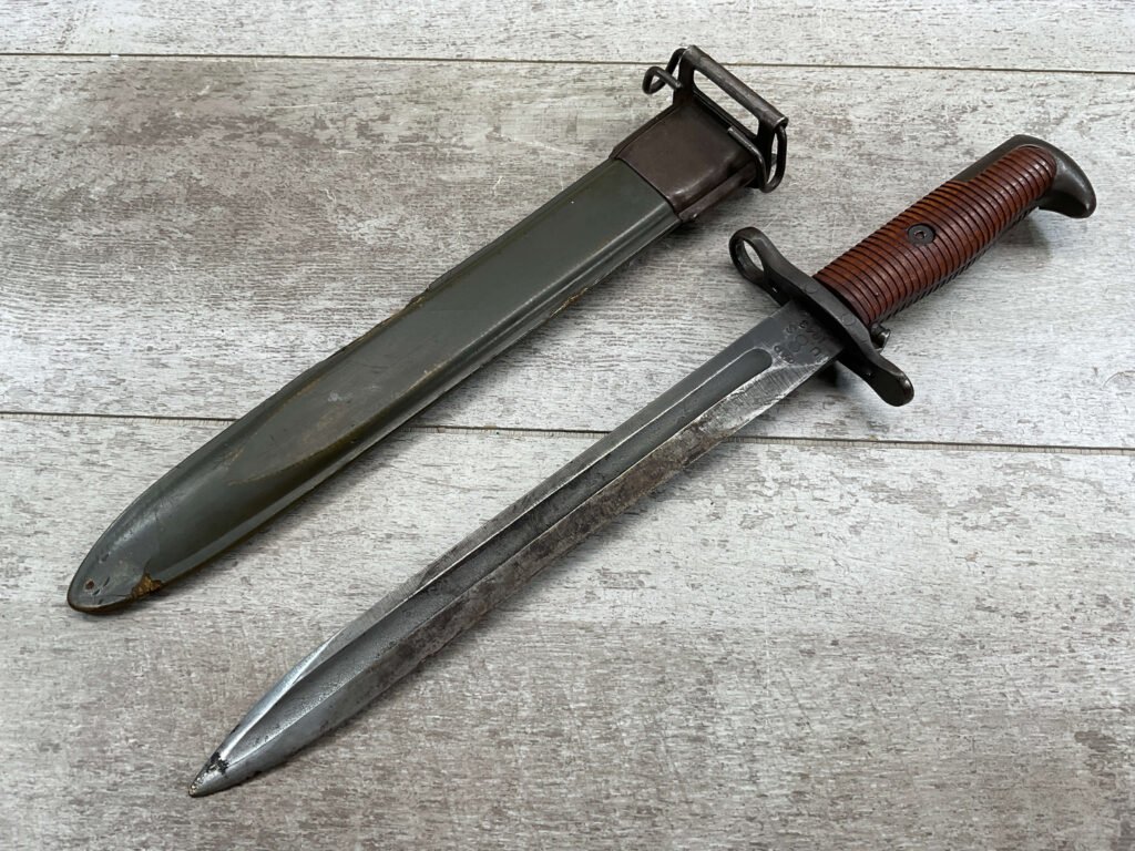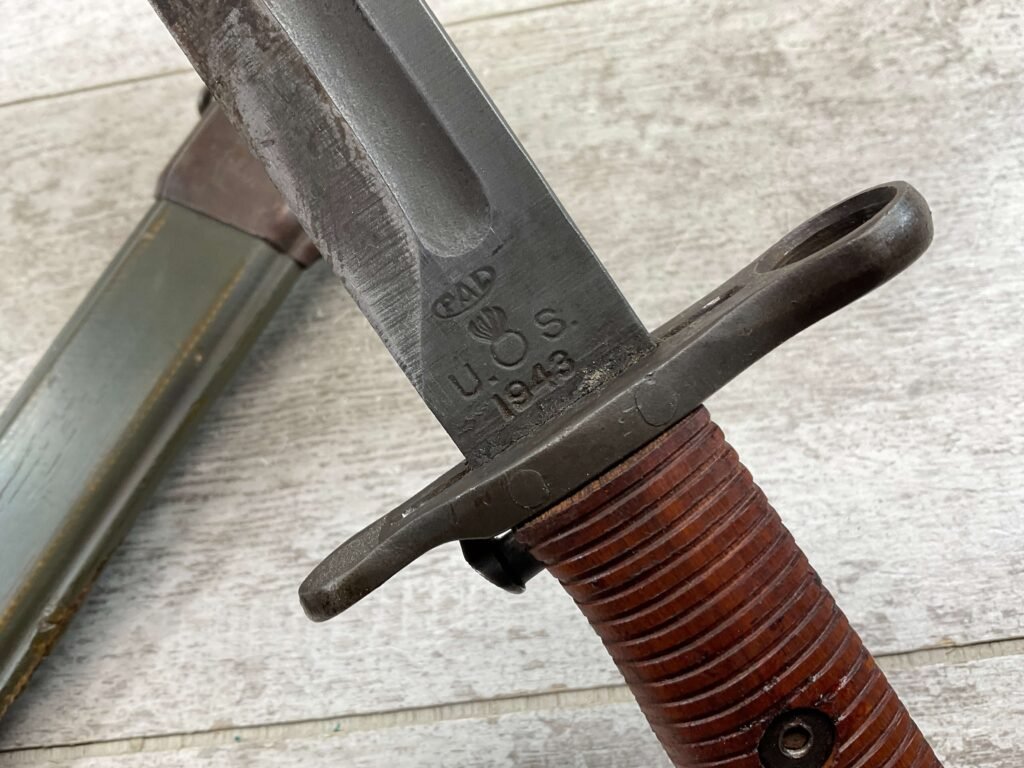 US PAL M1 GARAND BAYONET W/SCABBARD 10″ WWII (M1905E1), “PAL US FLAMING BOMB OVER 1943″, ORIGINALLY A 16″ AS THE BLOOD GROOVE EXTENDS TO THE TIP (NOW A 9 3/4″ BLADE), HANDLE AND SCABBARD ARE IN EXC CONDITION, GUARD IS TIGHT, ORIGINAL FINISH, SPEAR POINT, 9 3/4″N BLADE, 14 5/8” OVERALL, MADE BY PAL BLADE AND TOOL, M7 SCABBARD W/US FLAMING BOMB, EXC OVERALL