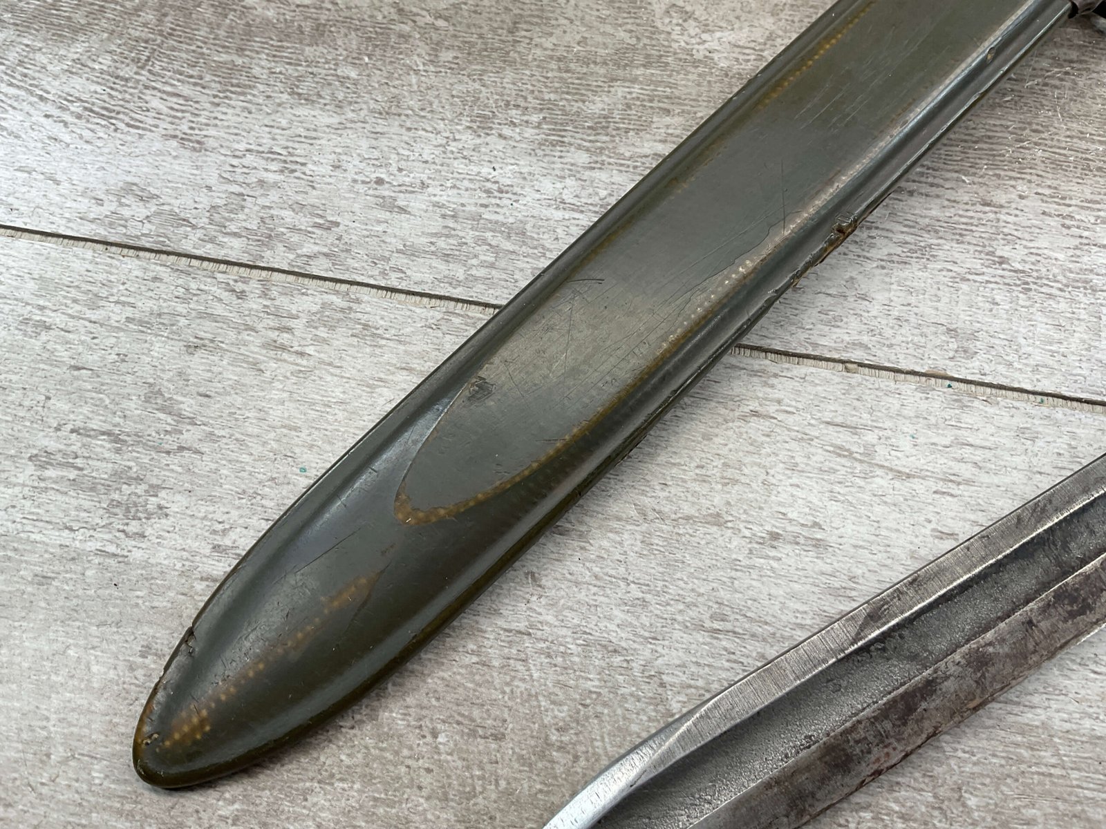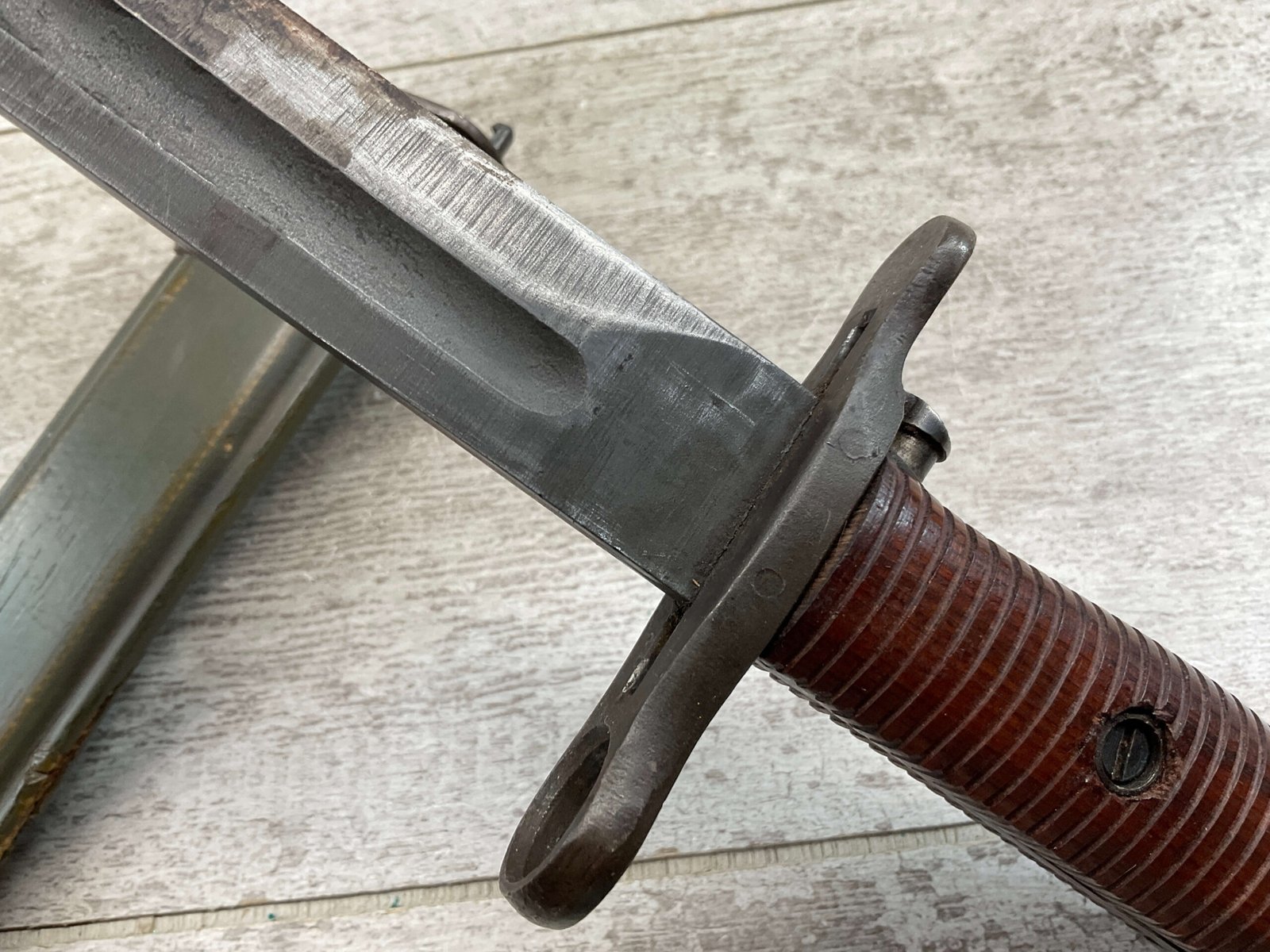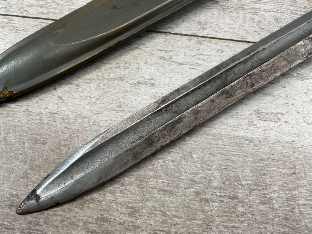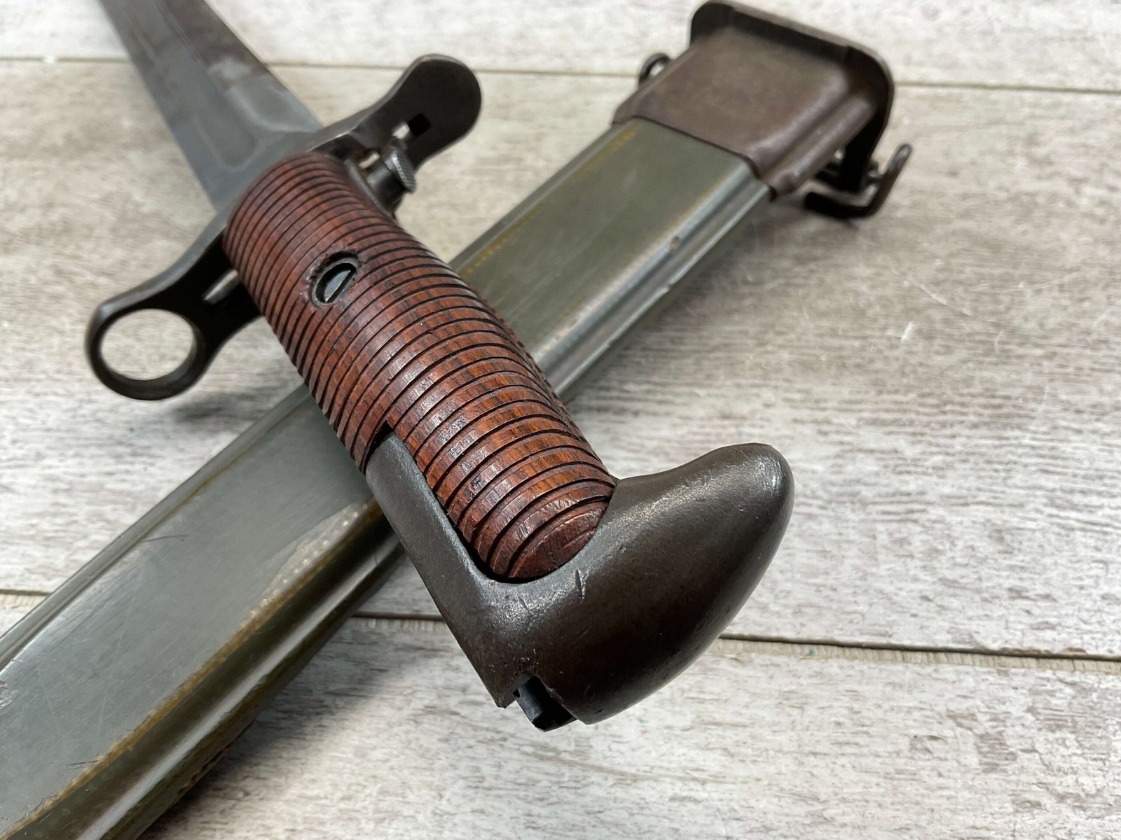 US PAL M1 GARAND BAYONET W/SCABBARD 10″ WWII (M1905E1), “PAL US FLAMING BOMB OVER 1943″, ORIGINALLY A 16″ AS THE BLOOD GROOVE EXTENDS TO THE TIP (NOW A 9 3/4″ BLADE), HANDLE AND SCABBARD ARE IN EXC CONDITION, GUARD IS TIGHT, ORIGINAL FINISH, SPEAR POINT, 9 3/4″N BLADE, 14 5/8” OVERALL, MADE BY PAL BLADE AND TOOL, M7 SCABBARD W/US FLAMING BOMB, EXC OVERALL