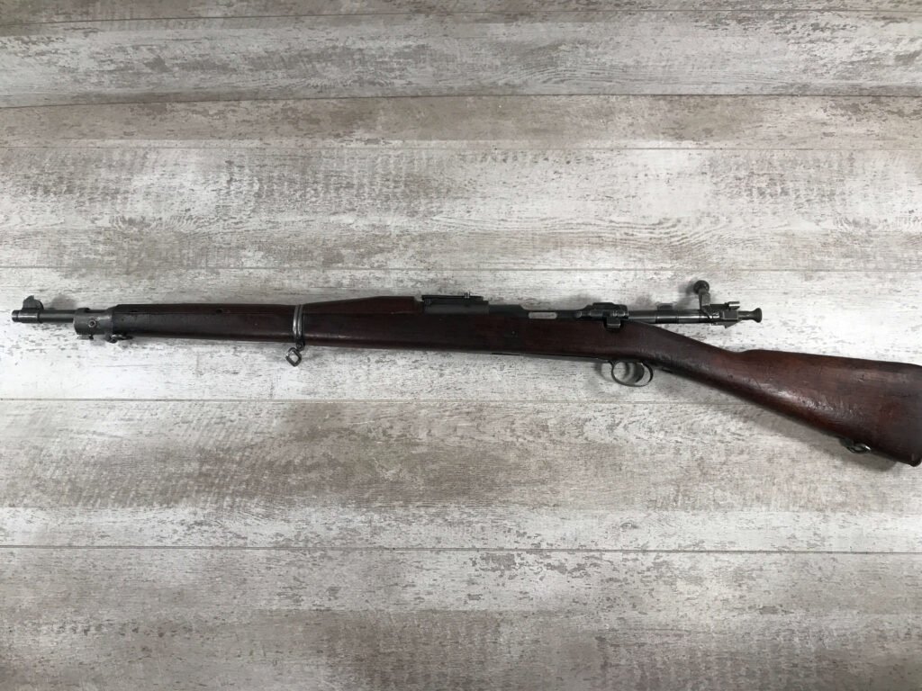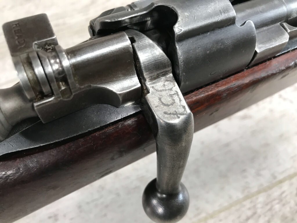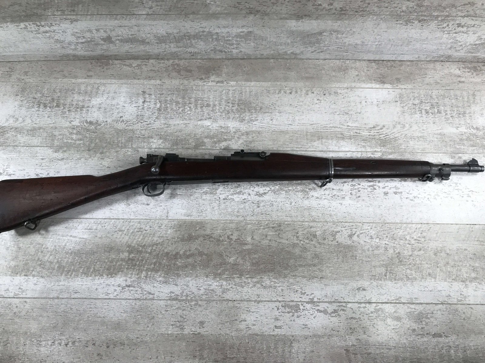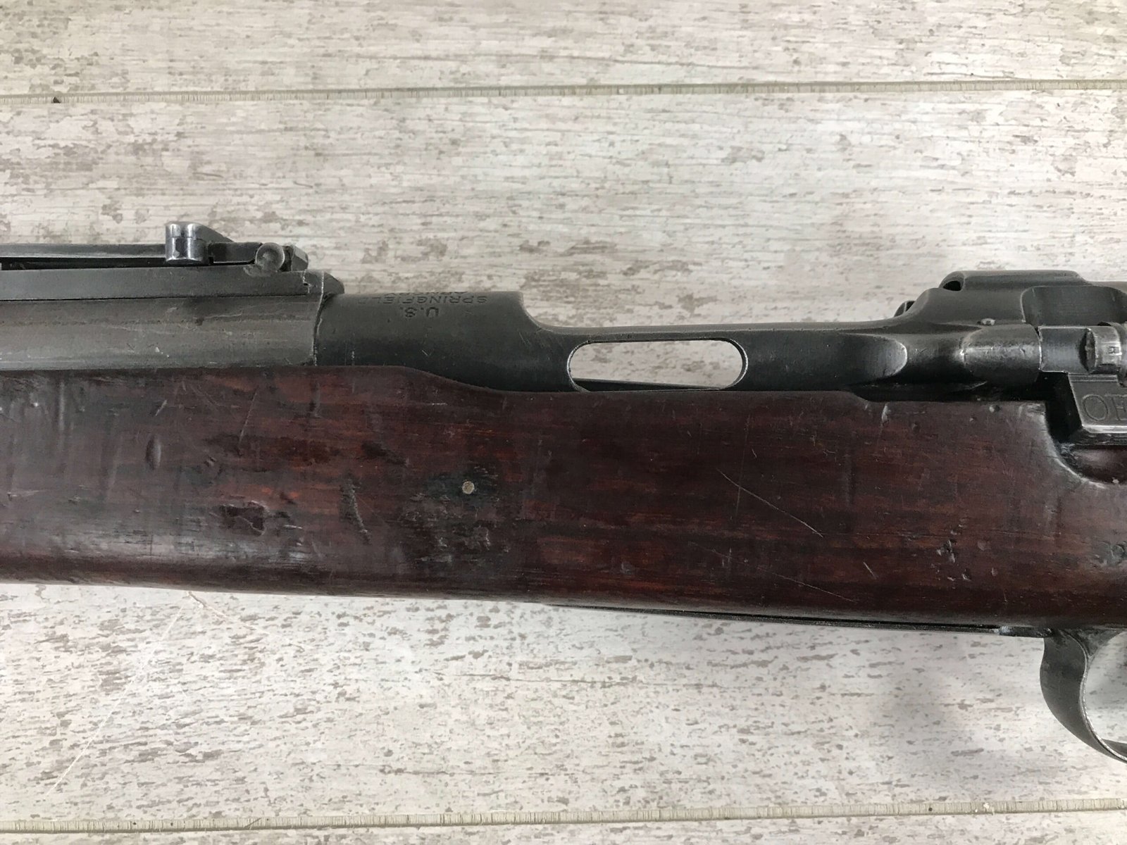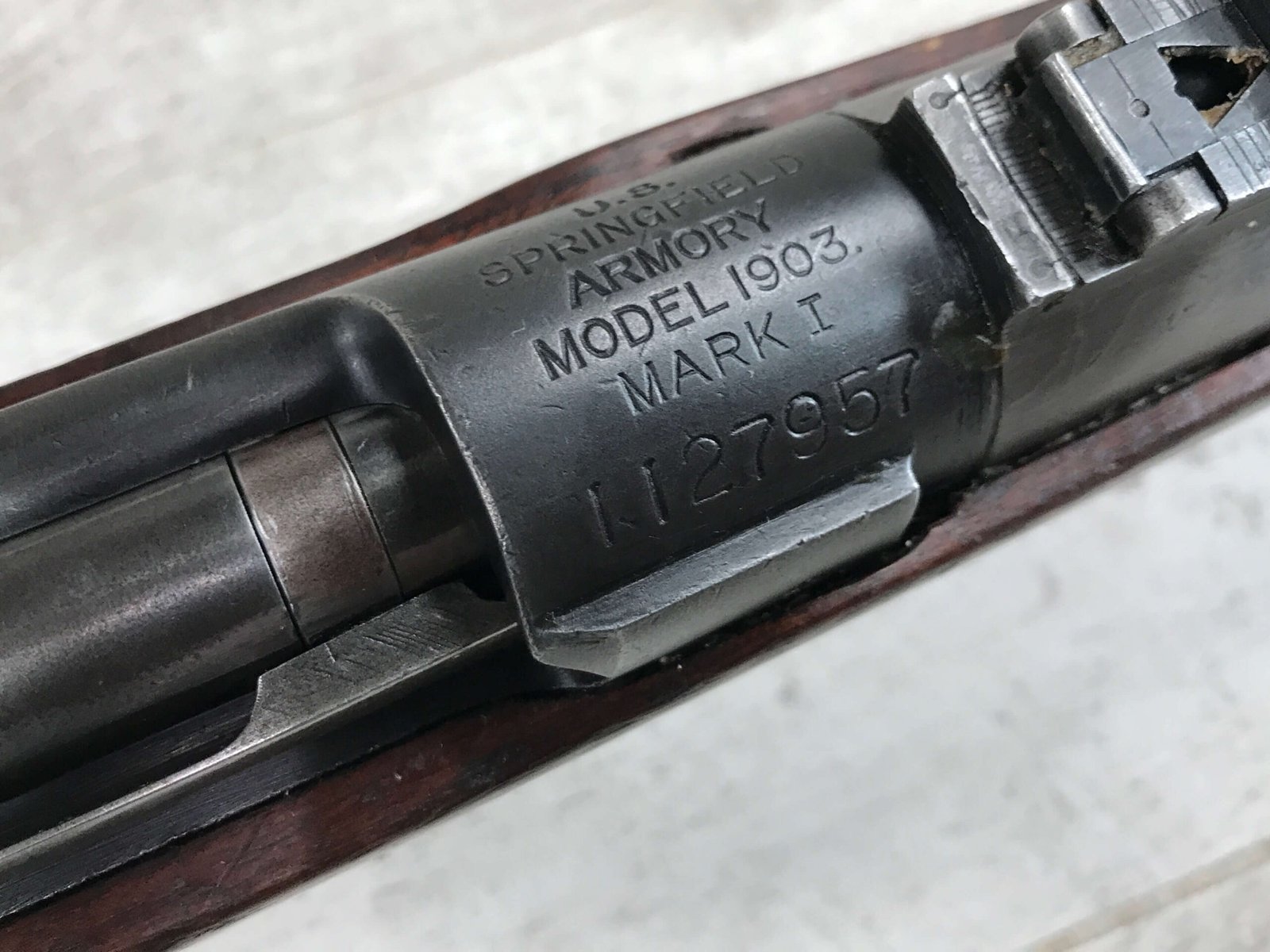 US SPRINGFIELD 1903 MARK I W/PEDERSON DEVICE CUTOUT BOLT ACTION RIFLE, #1127957, 30-06, PEDERSON MACHINED SLOT, 270 YRD REAR SIGHT, BLADE FRONT SIGHT, SA/FLAMING BOMB/6-42 BBL (REBARREL), VG ORIGINAL BLUE, GOOD WOOD W/NICKS AND DENTS, CIRCLE P BEHIND TRIGGER, EXC BRIGHT BORE W/VG RIFLING, 85+% OVERALL