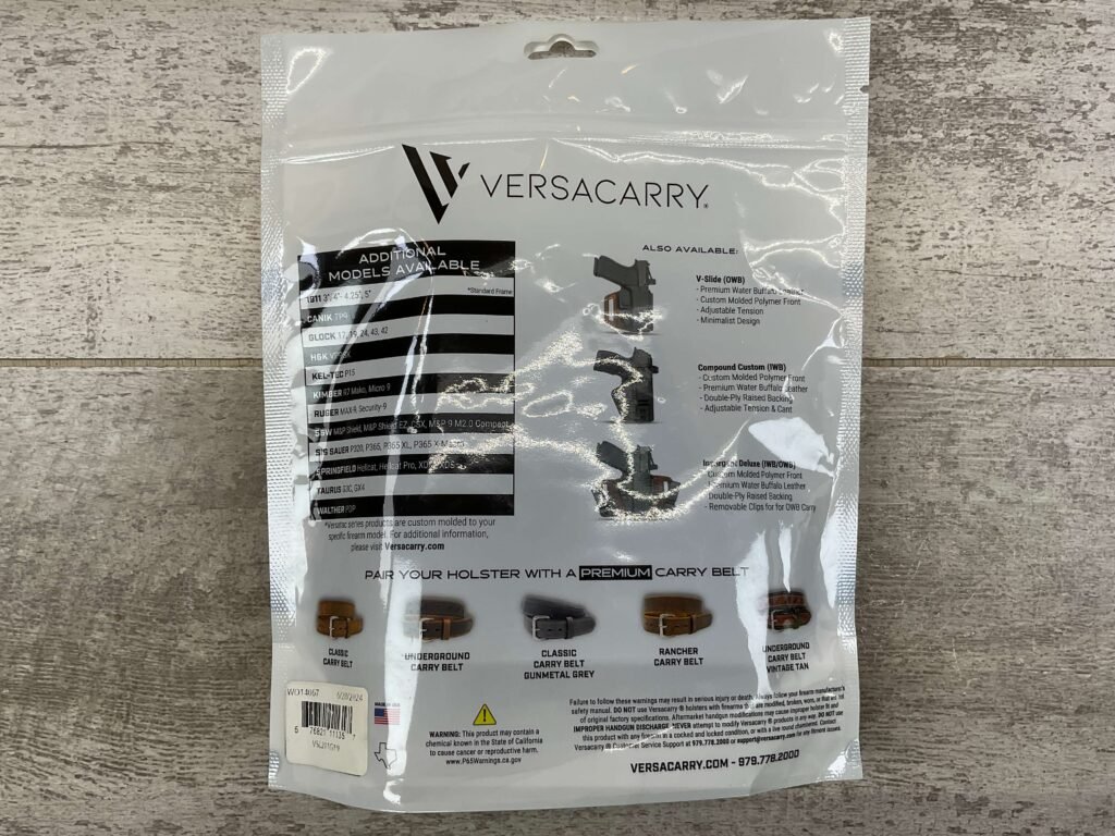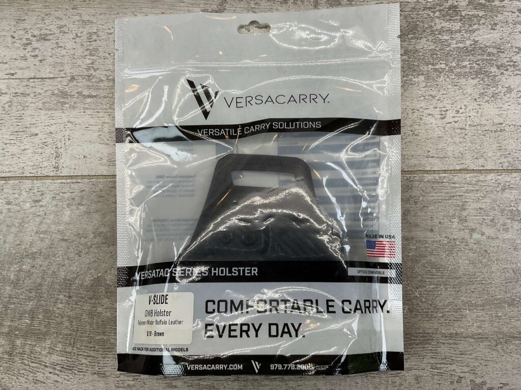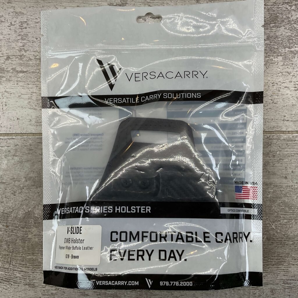 VERSACARRY V-SLIDE (OWB) GLOCK 19 HOLSTER, BROWN, NEW IN PACKAGING! MADE IN THE USA.