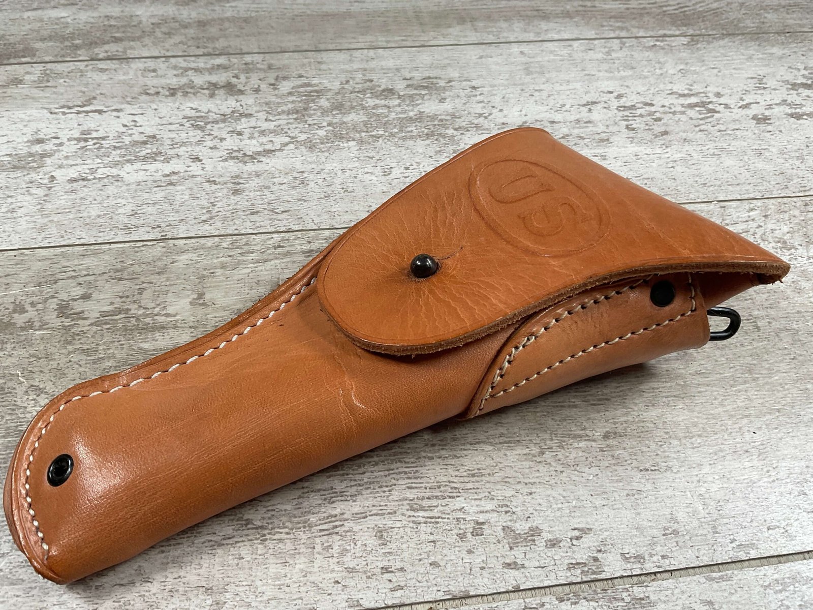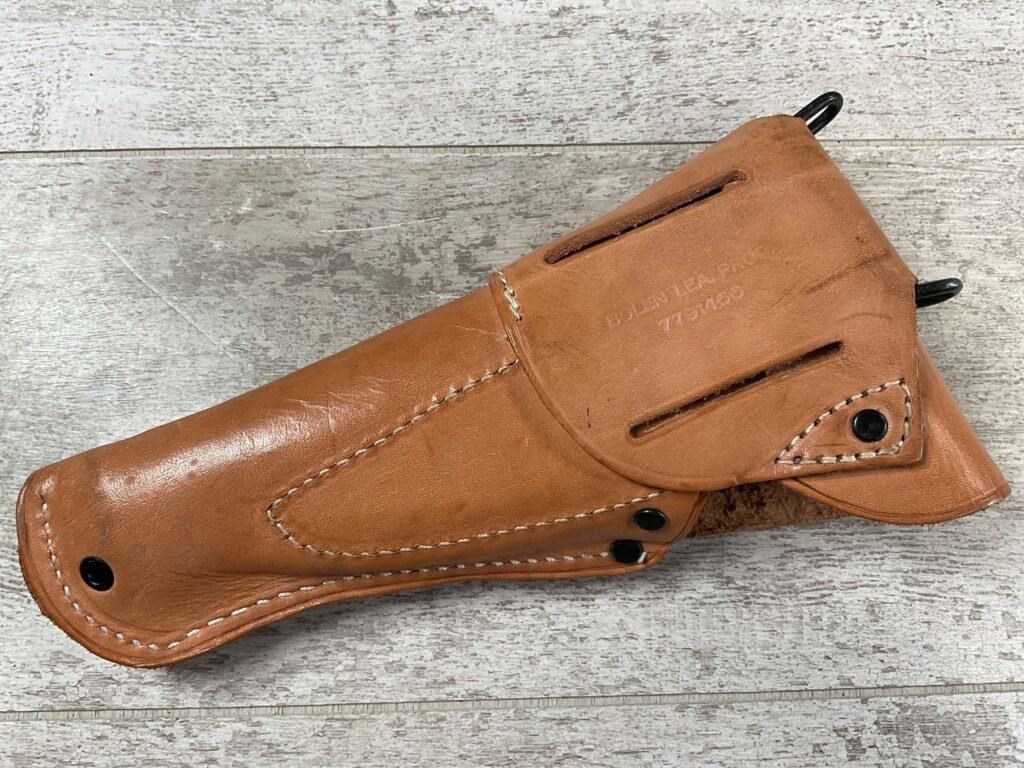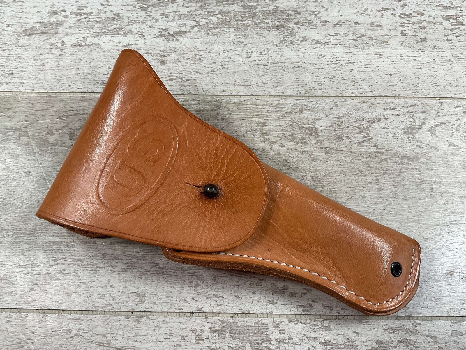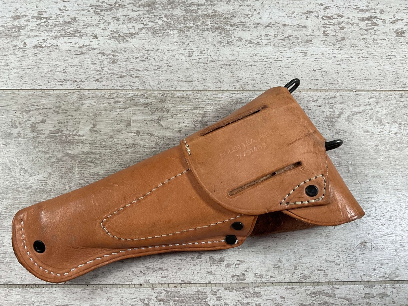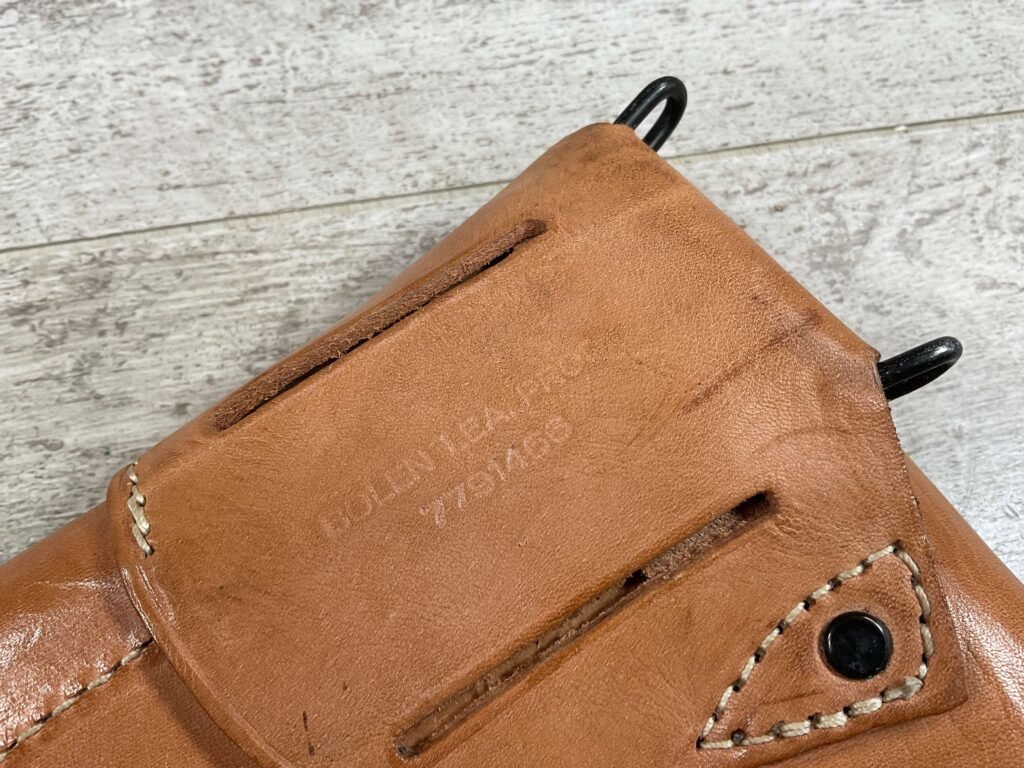 VIETNAM ERA US COLT 1911 TAN HOLSTER, “US” EMBOSSED ON THE FRONT FLAP, “BOLEN LEA PROD / 7791466” STAMPED ON BELT LOOP, SUPPLIER OF HOLSTERS DURING THE VIETNAM WAR AND SUPPLIED TO THE US MILITARY, EXC MINTY OVERALL CONDITION