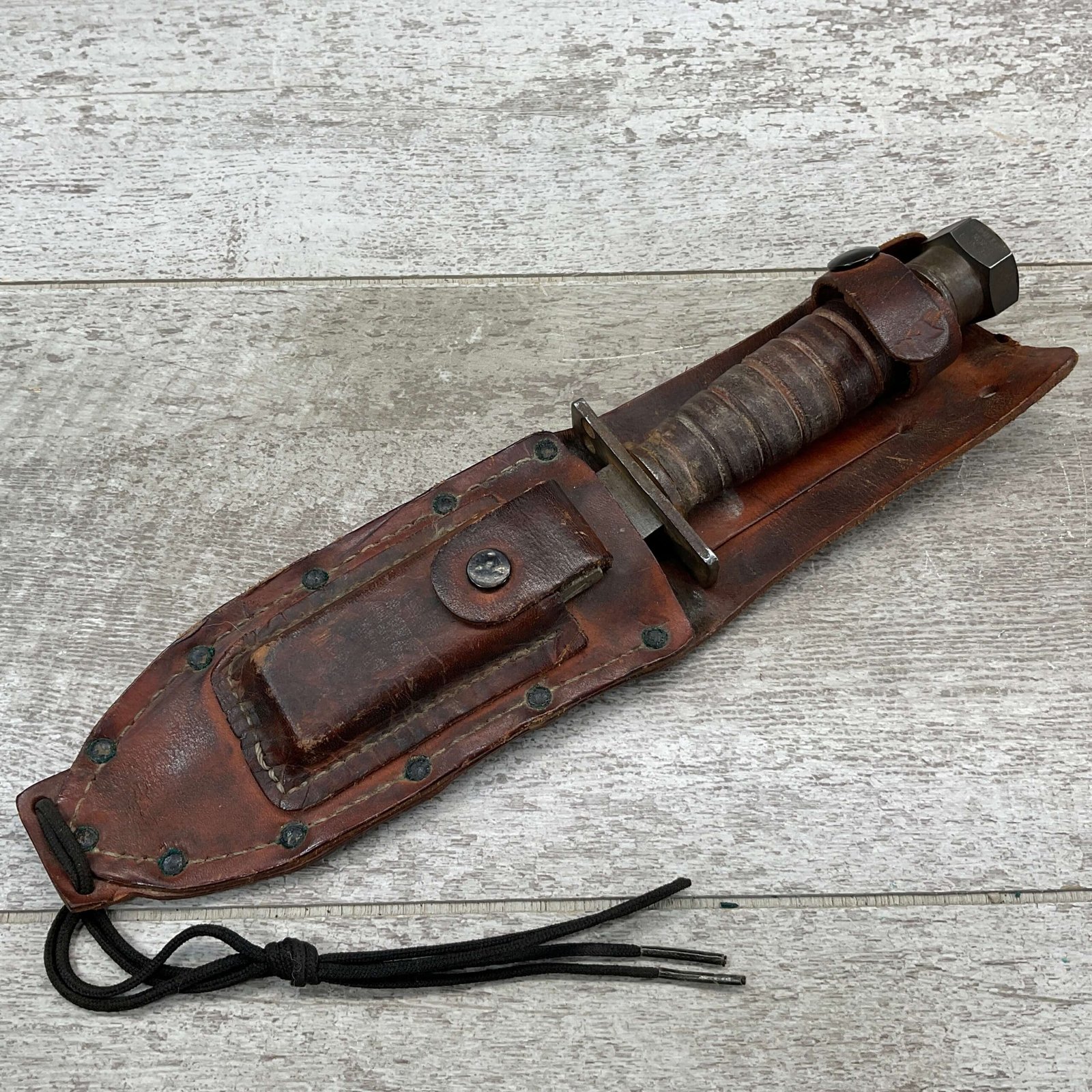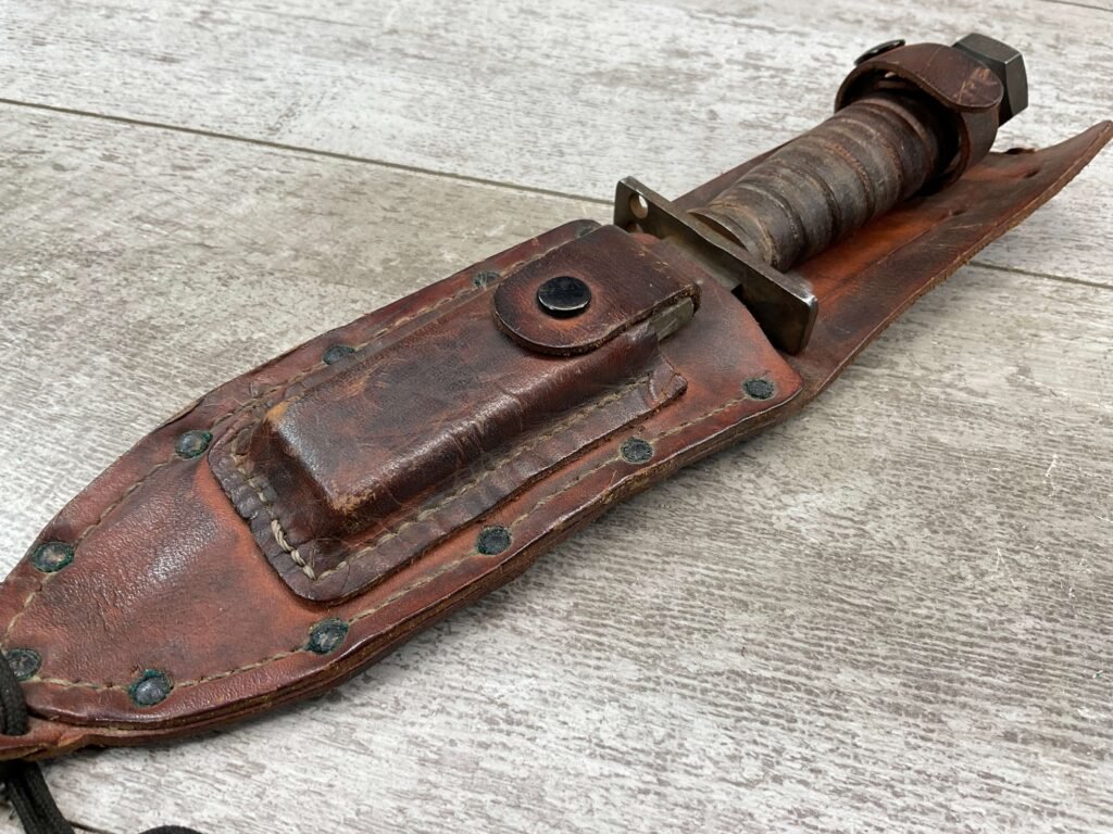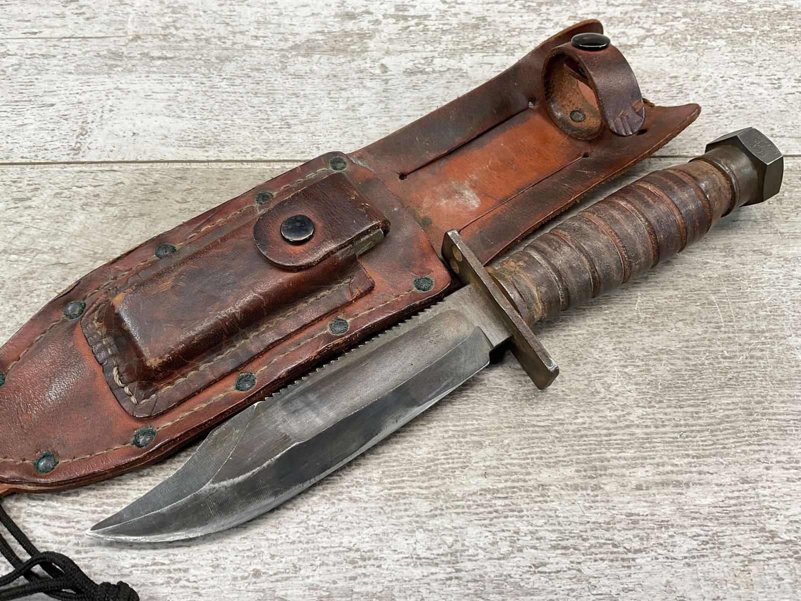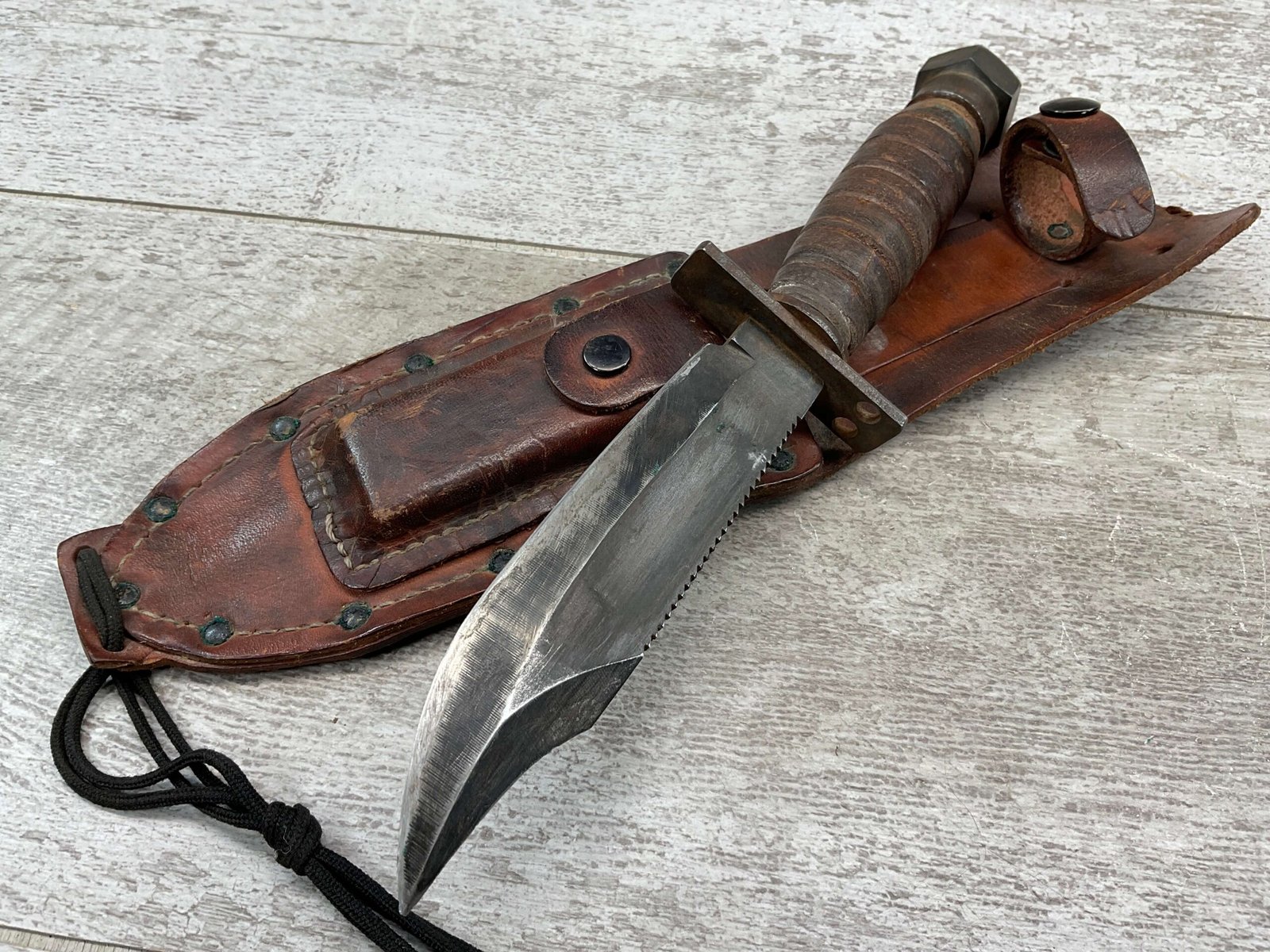 VINTAGE CAMILLUS 8-1979 US AIR FORCE PILOT SURVIVAL KNIFE, ORIGINAL LEATHER SHEATH AND SHARPENING STONE, 5″ BLDE TAPPERED TO POINT, SERRATED SPINE, STACKED LEATHER HANDLE, KNIFE IS IN VG-G USED CONDITION.