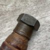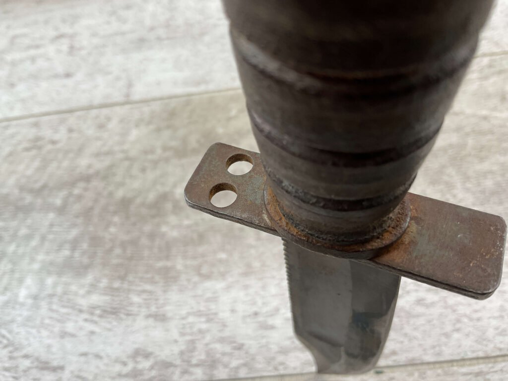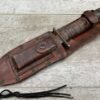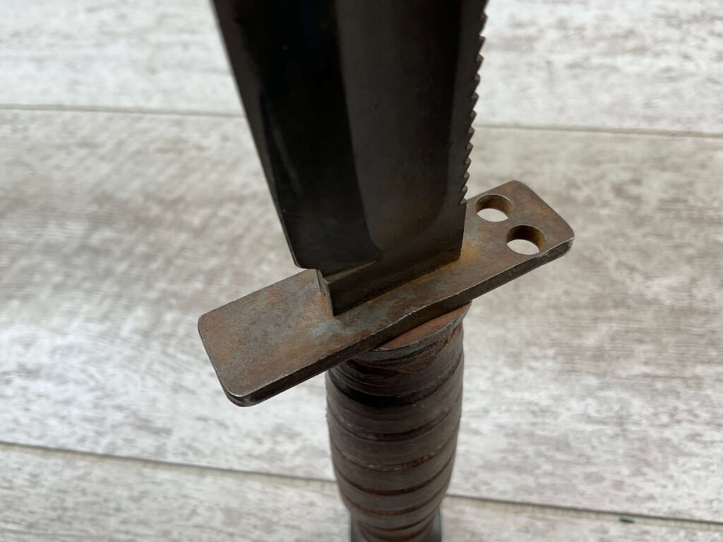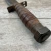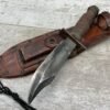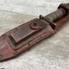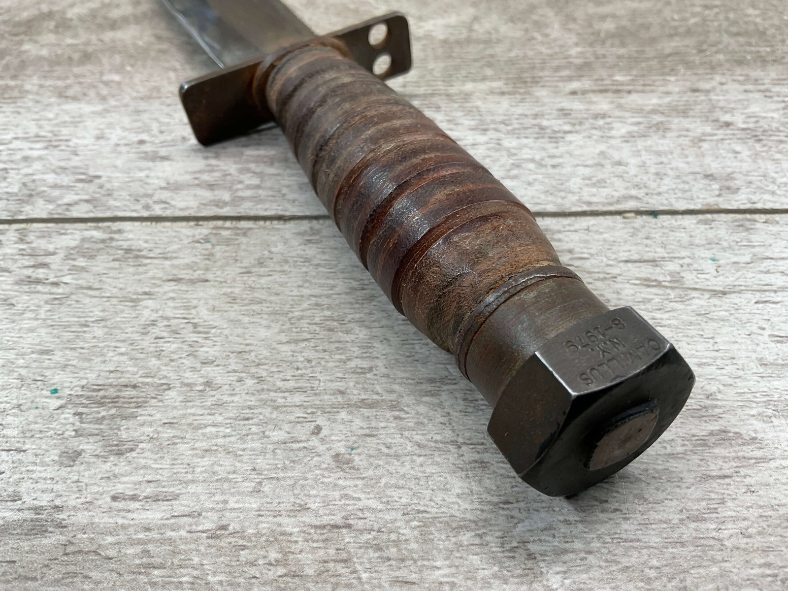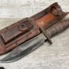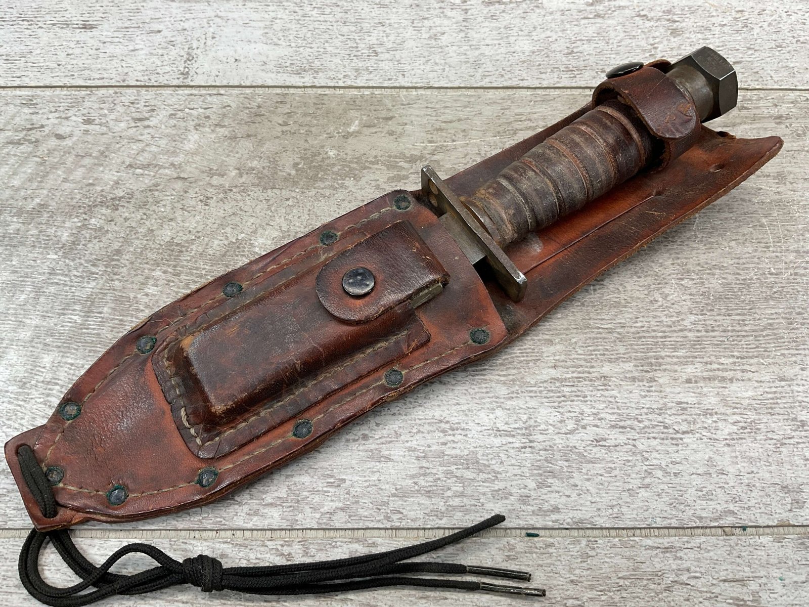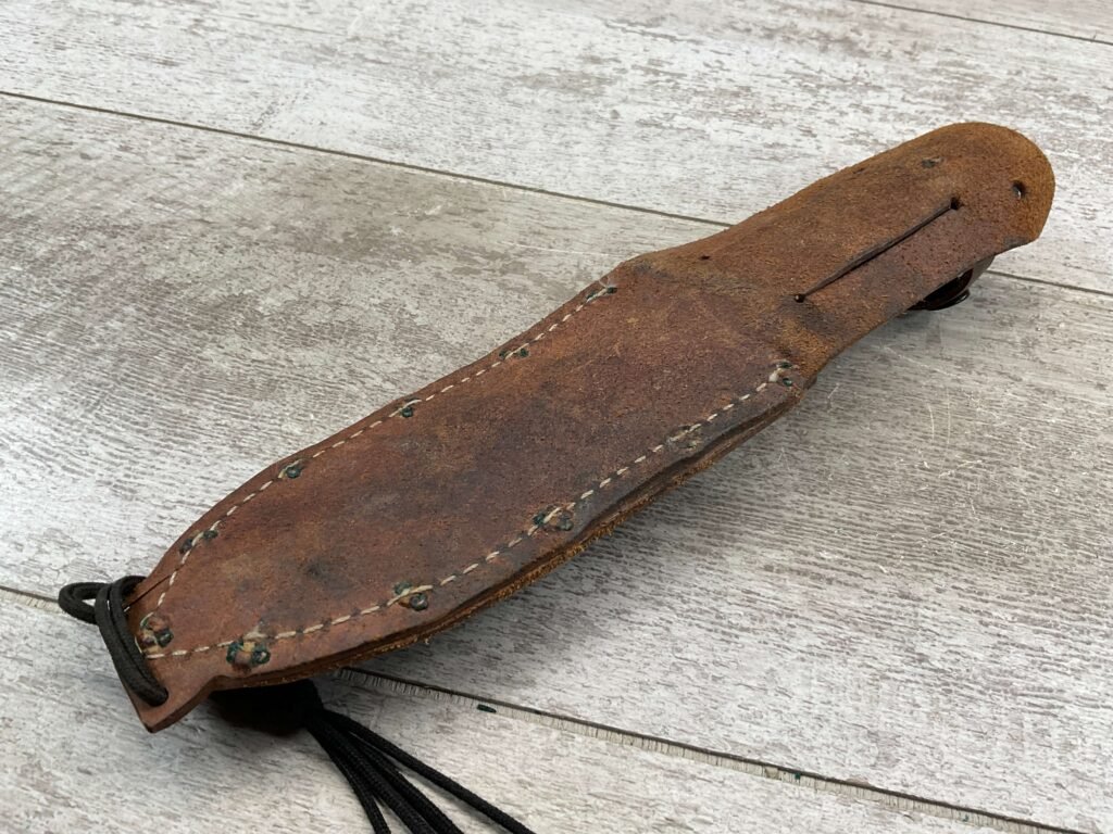 VINTAGE CAMILLUS 8-1979 US AIR FORCE PILOT SURVIVAL KNIFE, ORIGINAL LEATHER SHEATH AND SHARPENING STONE, 5″ BLDE TAPPERED TO POINT, SERRATED SPINE, STACKED LEATHER HANDLE, KNIFE IS IN VG-G USED CONDITION.