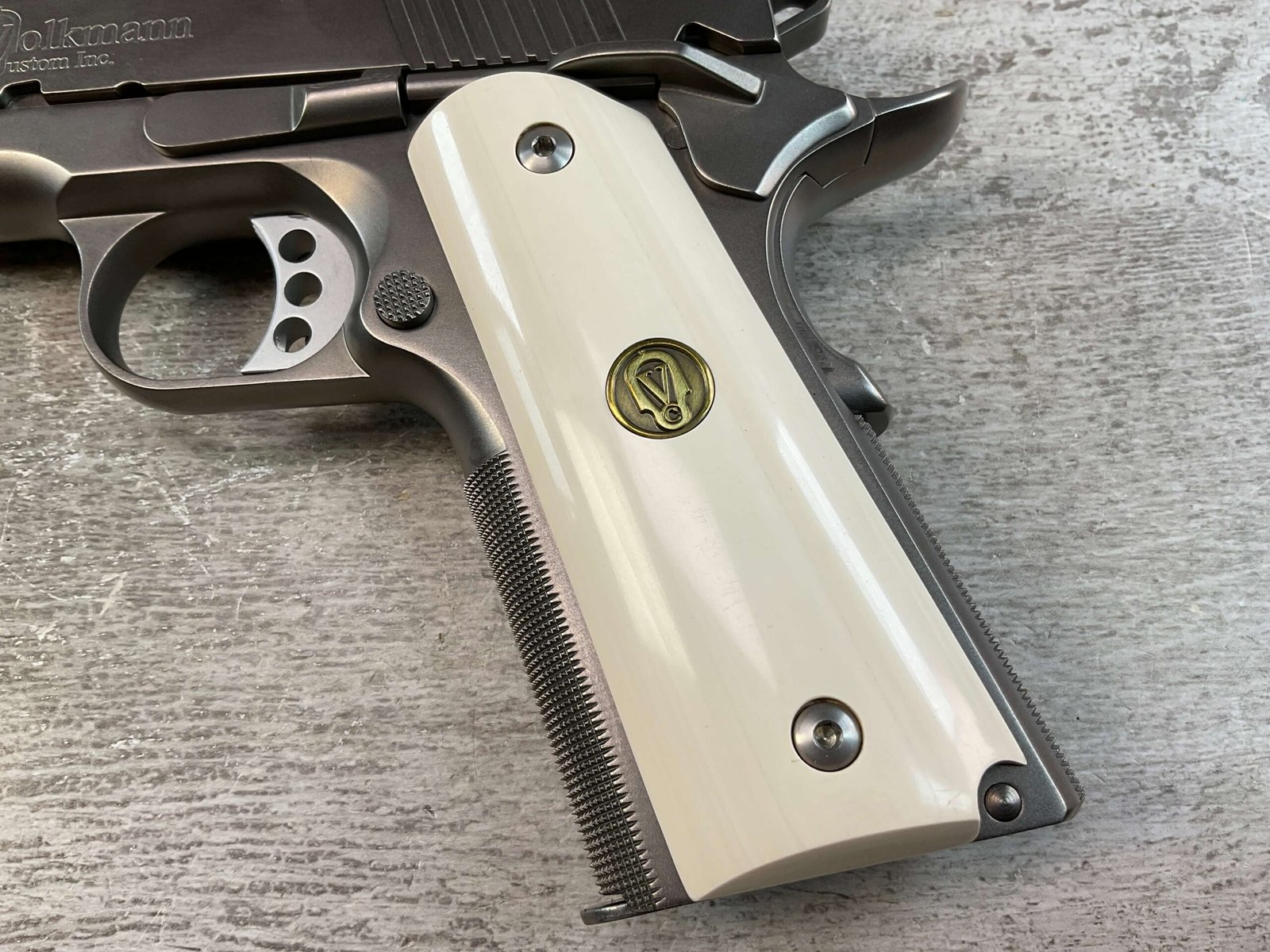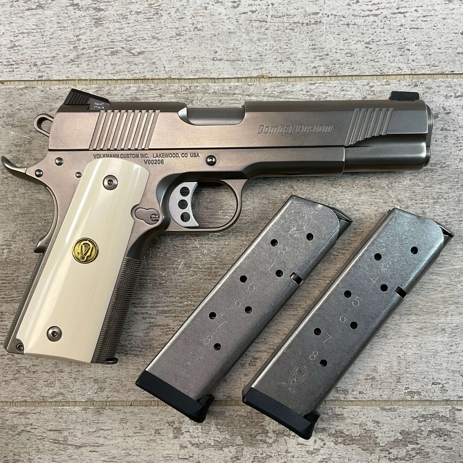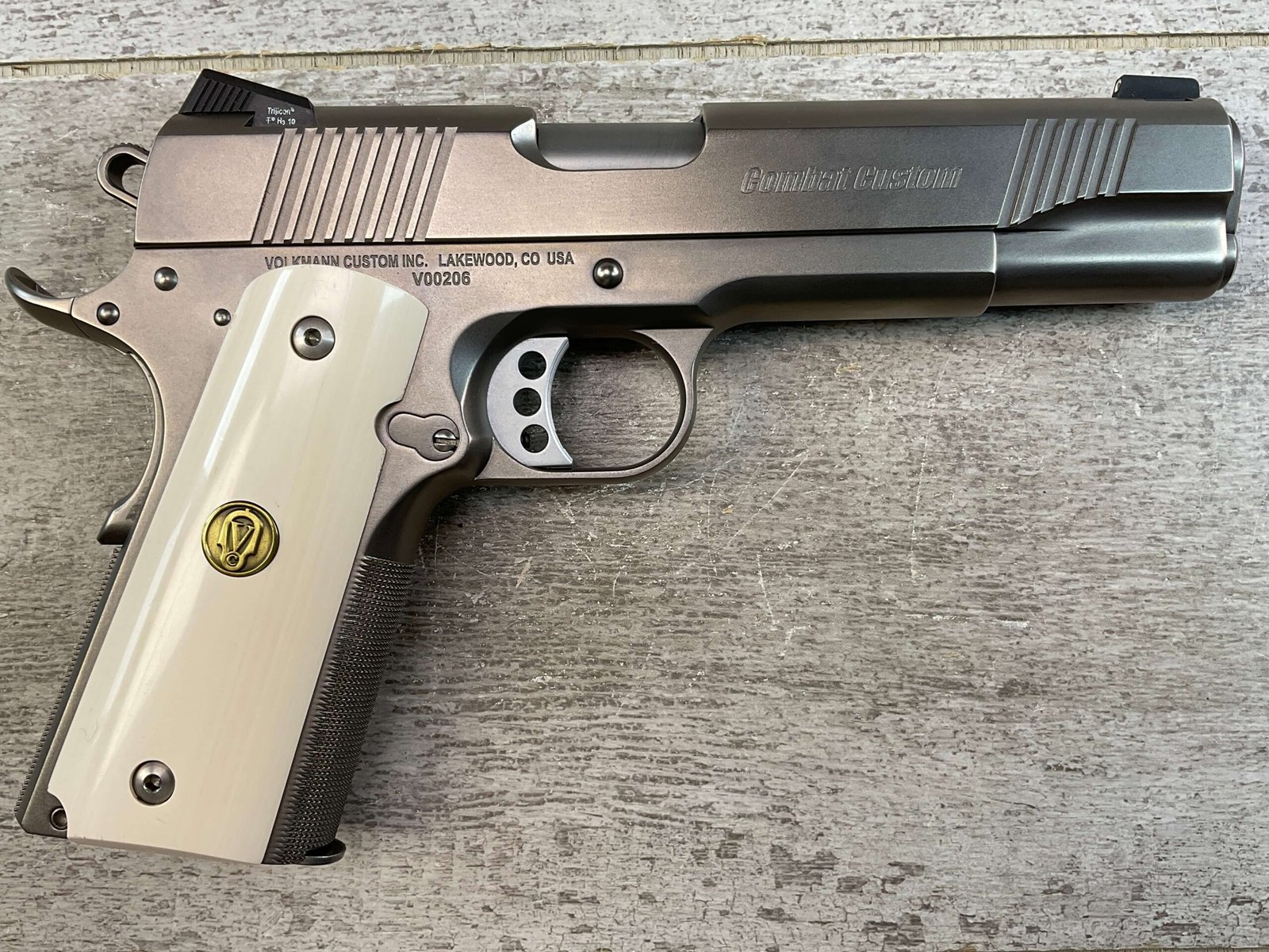 VOLKMANN CUSTOM INC COMBAT CUSTOM .45 ACP CUSTOM SEMI AUTO PISTOL, JAMES EARL JONES COLLECTION #V00206, 5″ VOLKMANN BARREL, EXC MIRROR BORE & RIFLING, EXC STAINLESS FINISH ON SLIDE & FRAME, EXC MAMMOTH IVORY GRIPS, 3 MAGAZINES, TRIJICON SIGHTS, TUNED & POLISHED, CRISP 3 HOLE 3.5-4.5LB TRIGGER, CONDITION AS SHOWN IN PICTURES, FROM THE JAMES EARL JONES “FAVORITES” COLLECTION W/ CERTIFICATE OF AUTHENTICITY.