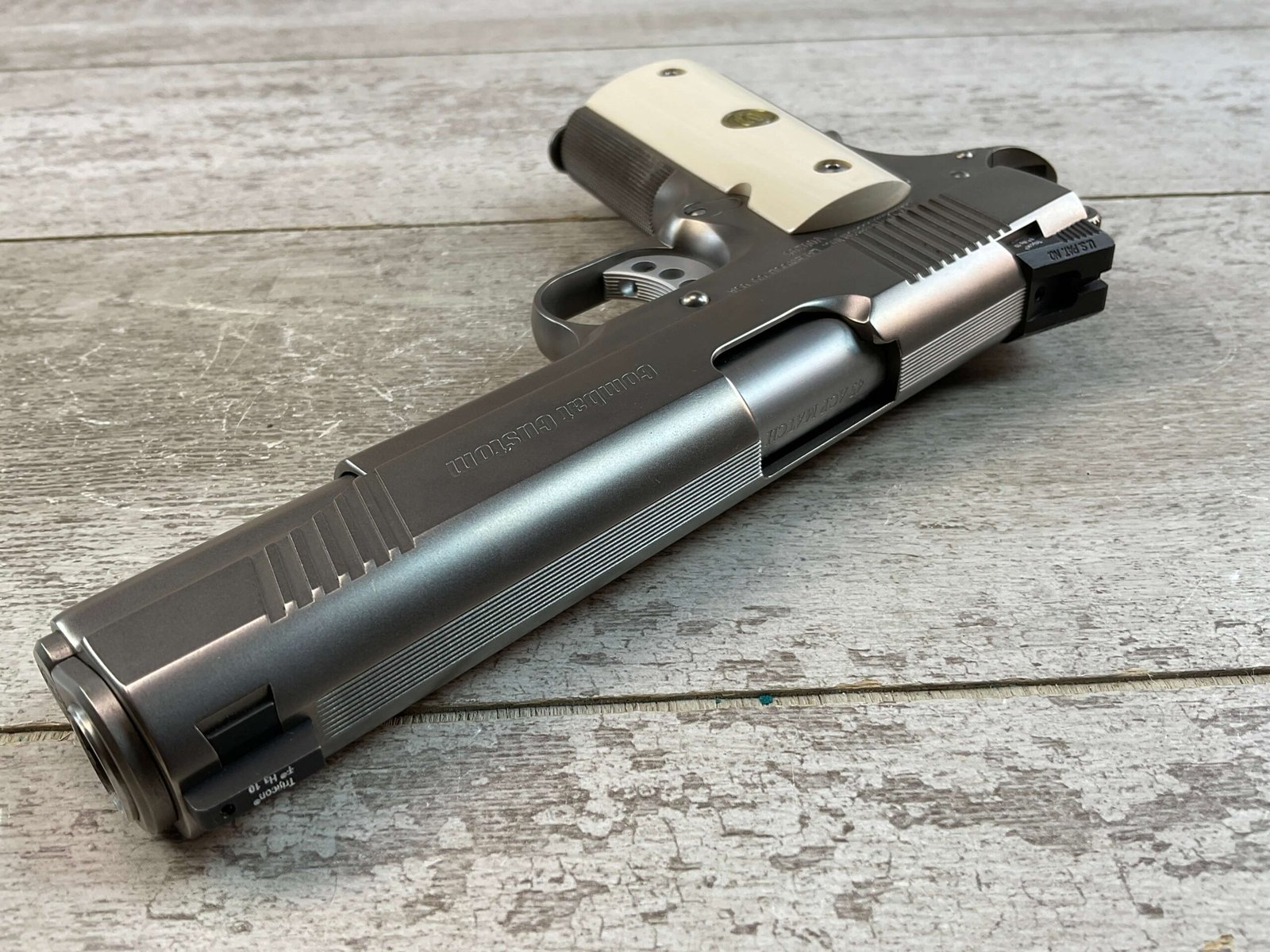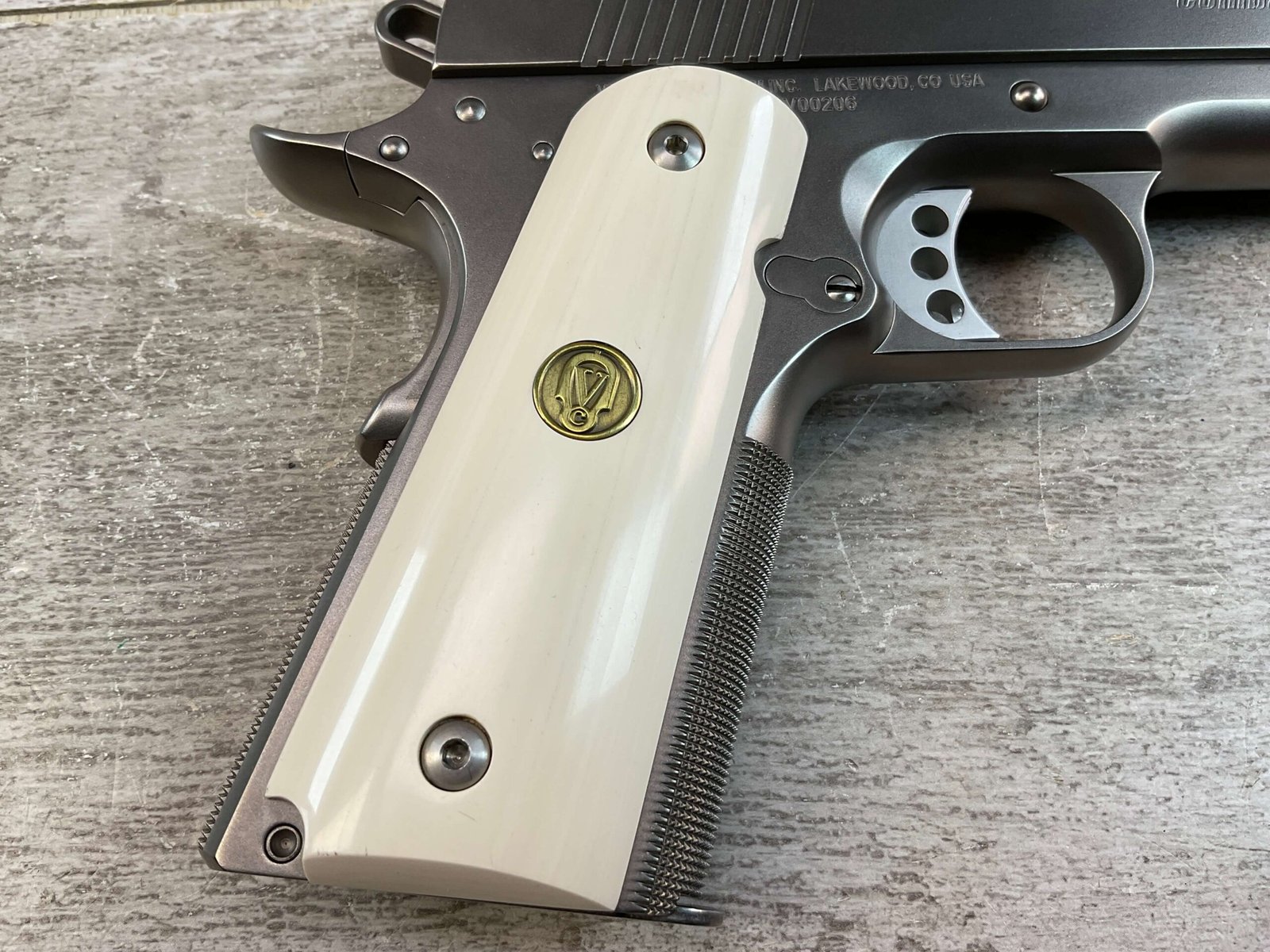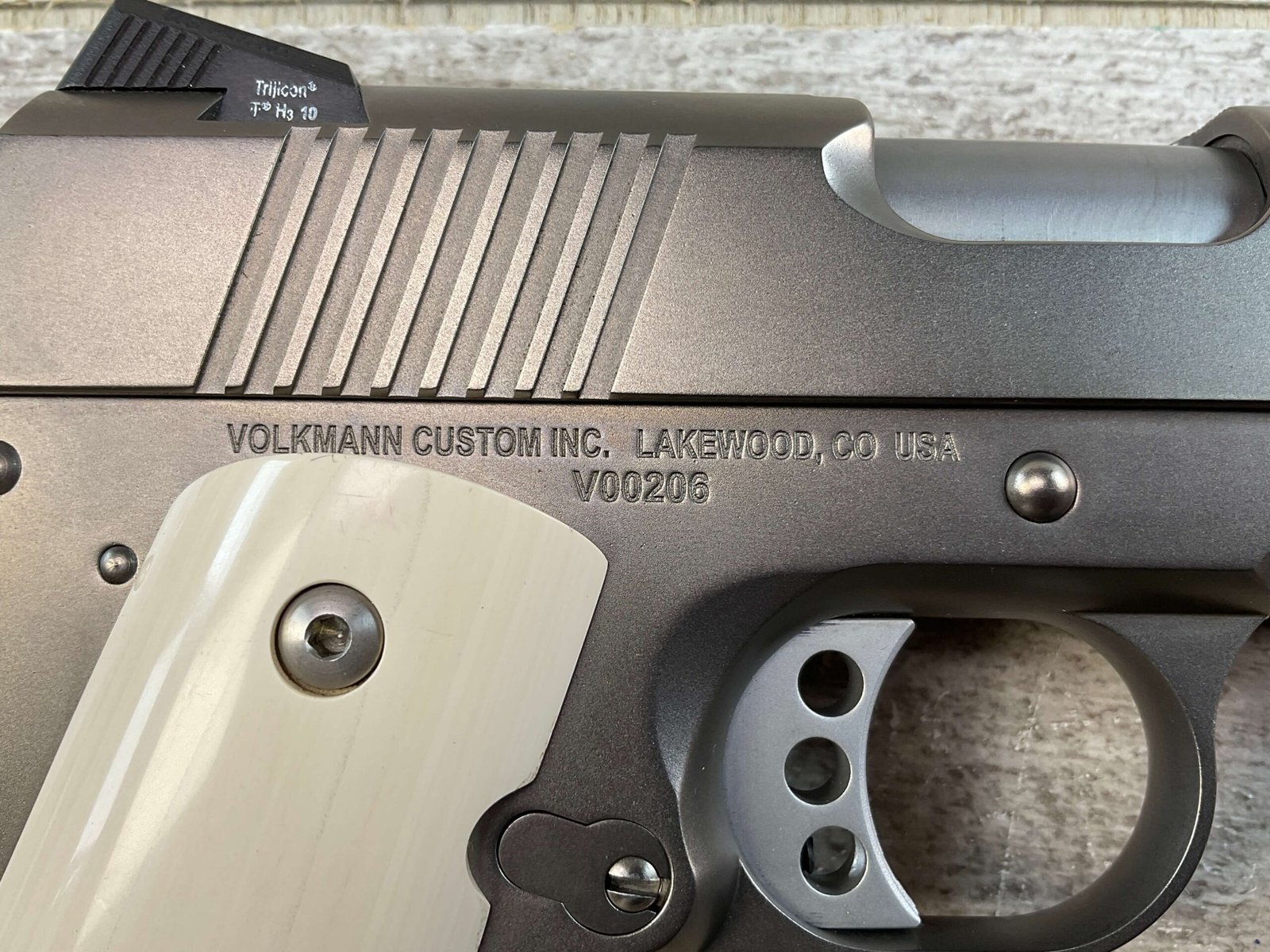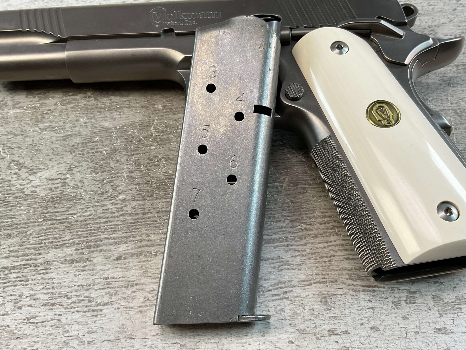 VOLKMANN CUSTOM INC COMBAT CUSTOM .45 ACP CUSTOM SEMI AUTO PISTOL, JAMES EARL JONES COLLECTION #V00206, 5″ VOLKMANN BARREL, EXC MIRROR BORE & RIFLING, EXC STAINLESS FINISH ON SLIDE & FRAME, EXC MAMMOTH IVORY GRIPS, 3 MAGAZINES, TRIJICON SIGHTS, TUNED & POLISHED, CRISP 3 HOLE 3.5-4.5LB TRIGGER, CONDITION AS SHOWN IN PICTURES, FROM THE JAMES EARL JONES “FAVORITES” COLLECTION W/ CERTIFICATE OF AUTHENTICITY.