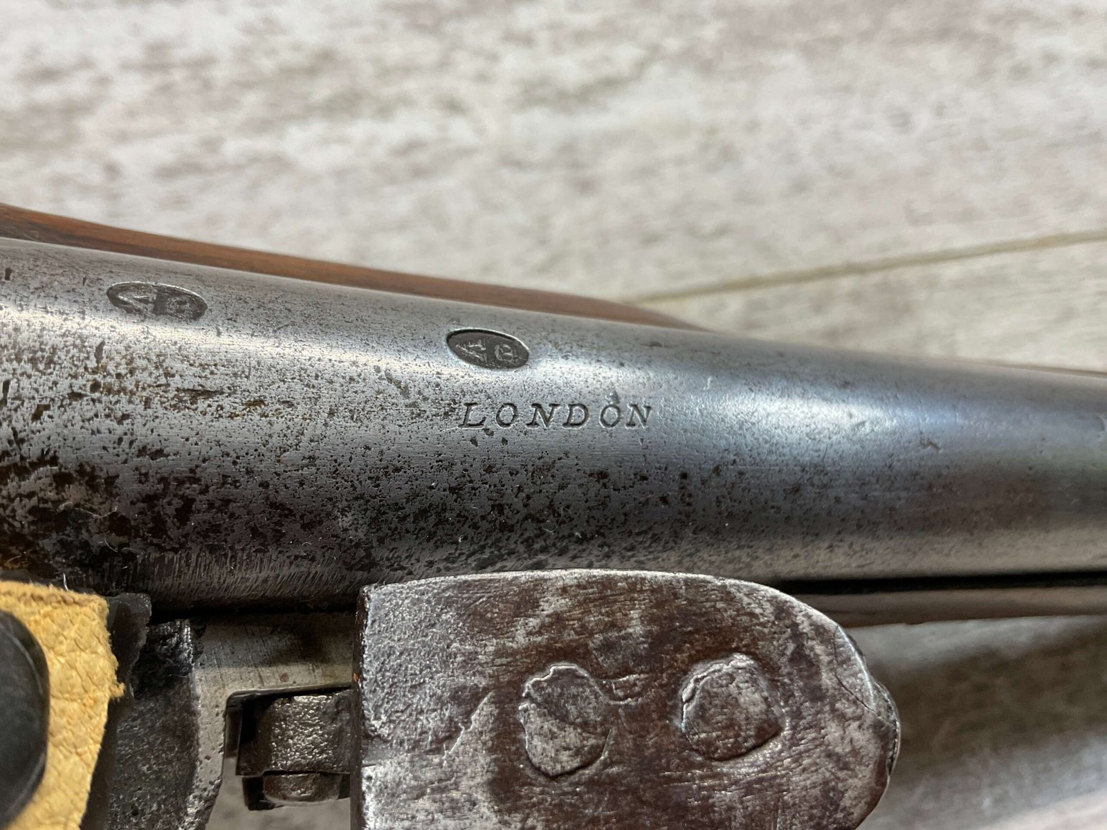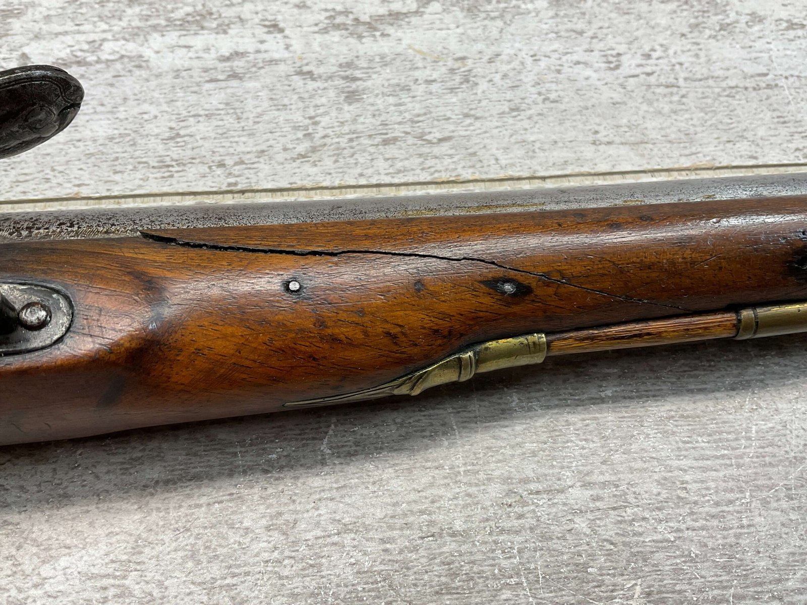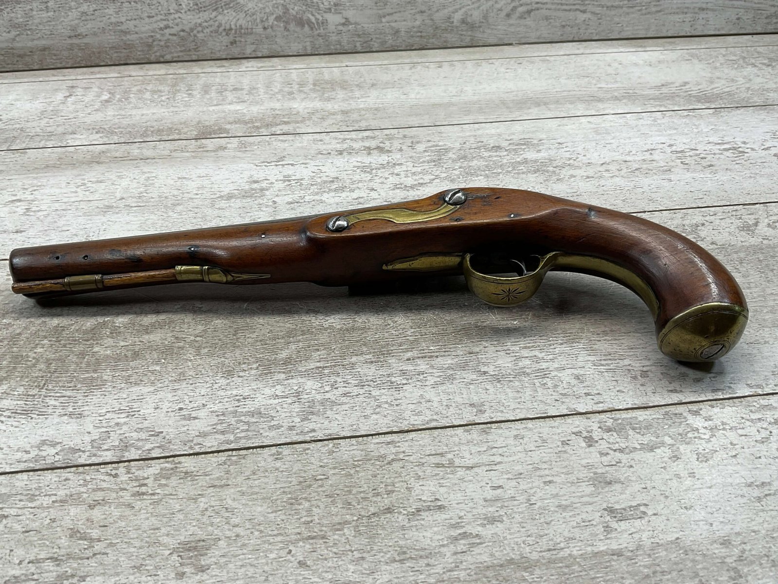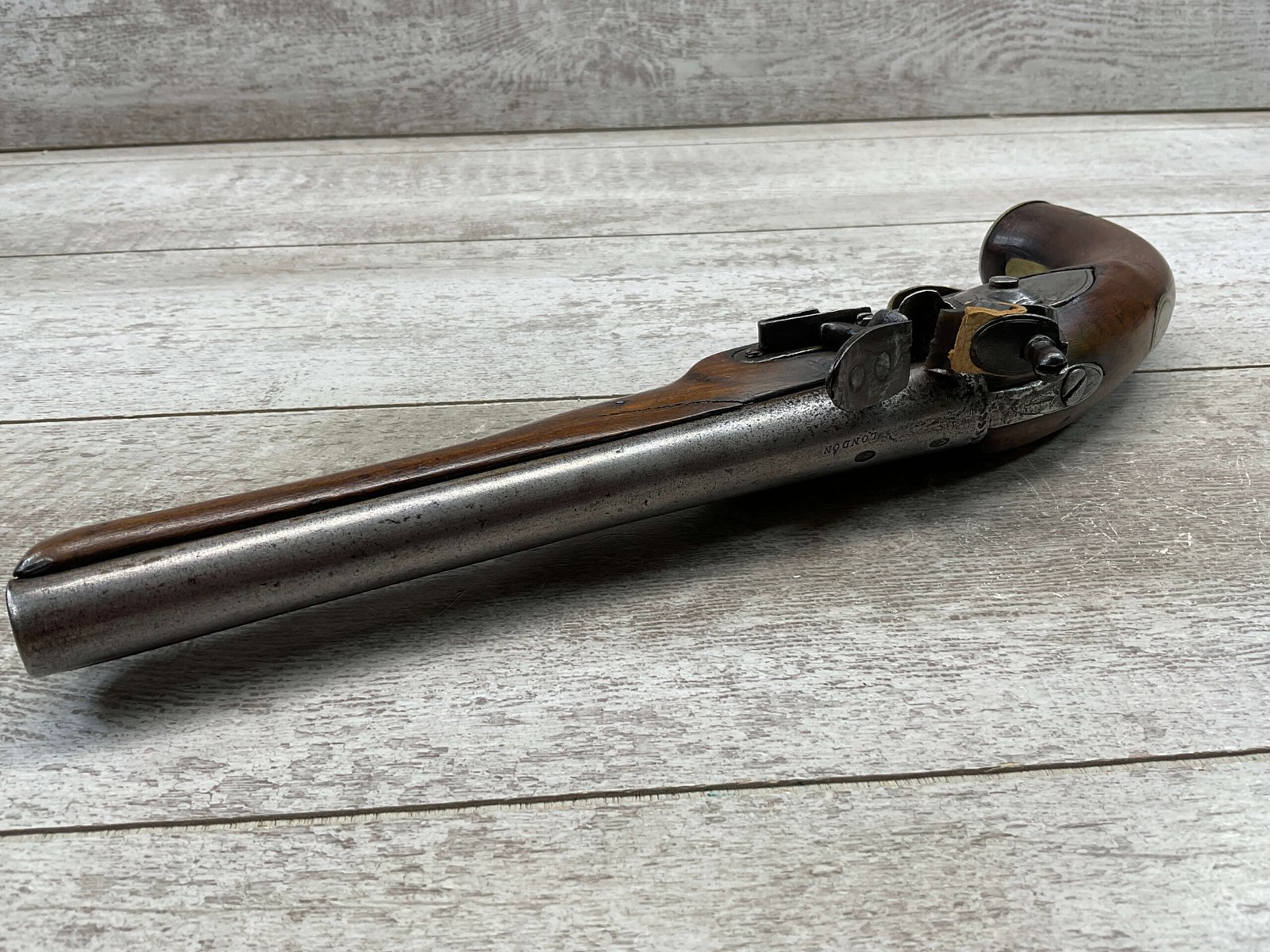 W. KETLAND & CO. LONDON DRAGOON .54 CAL FLINTLOCK PISTOL, ANTIQUE #NSN, 8″ BBL, CRACKED STOCK, POOR MARKS FROM THE EARLY 1800’S, BRASS FURNITURE, FLINT LOCK, WOODEN RAMROD, CONDITION AS SHOWN IN PHOTOS.