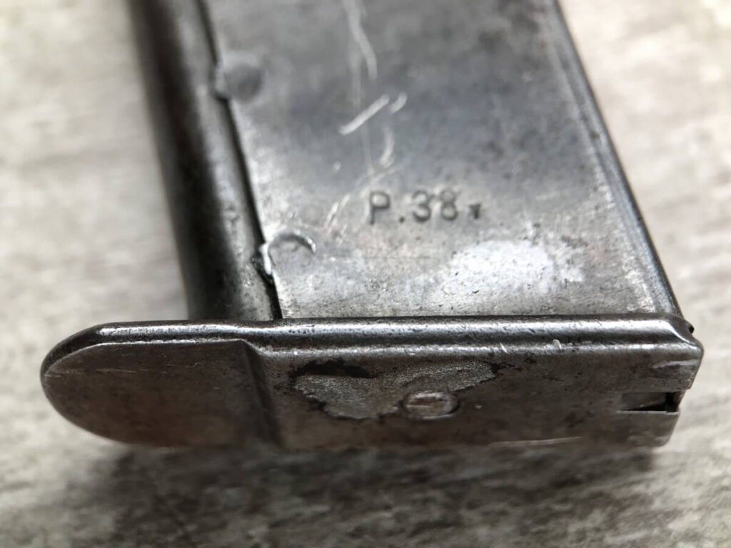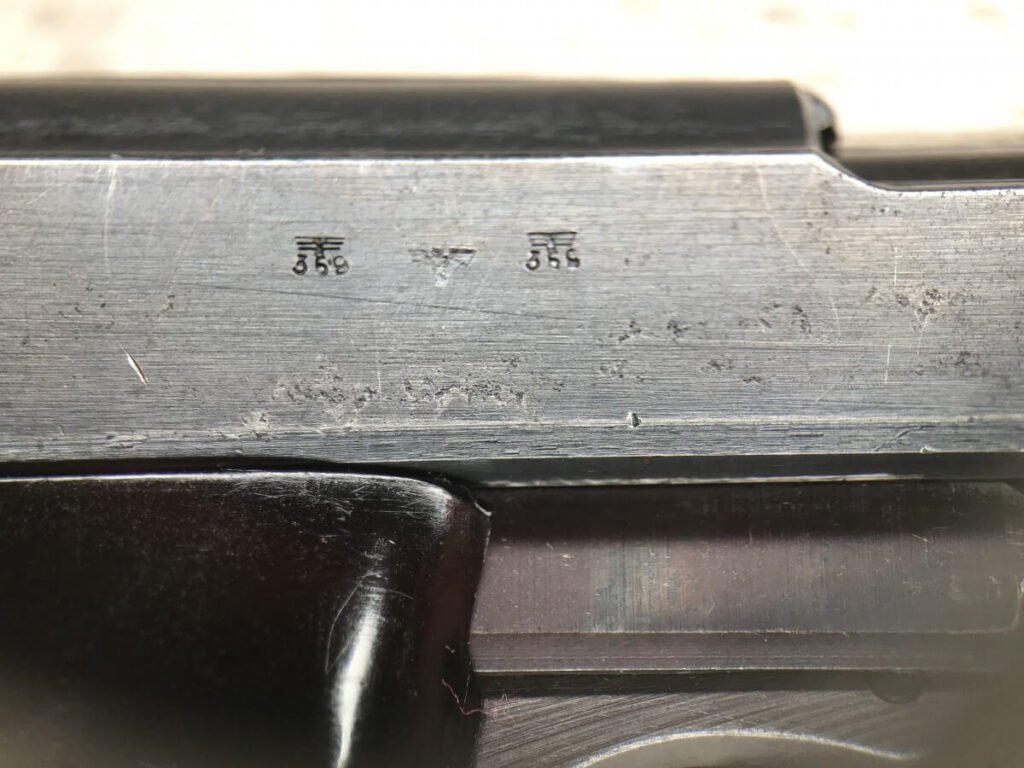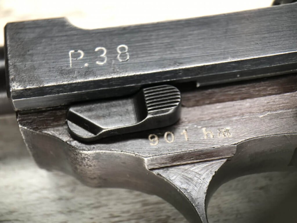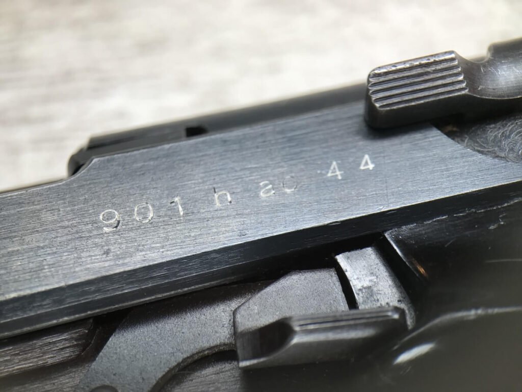 WALTHER AC 44 P.38 9MM SEMI AUTO PISTOL W/FN FRAME, RARE #901h, 9MM, ALL MATCHING, FN FRAME, RARE EAGLE/140 PROOF ON THE FRAME TO DENOTE IT WAS MANUFACTURED BY FN, ORIGINAL FINISH OF 93% BLUE (LIGHT HIGH EDGE WEAR), 5″ BBL, TINY “DINGS” ON RIGHT SIDE OF SLIDE, EXC BRIGHT BORE W/STRONG RIFFLING, EXC TYPE 1 POLYAMID-6-GRIPS GRIPS, FAIR MAG-“P.38v” ON LEFT SIDE OF MAG, 93% CONDITION