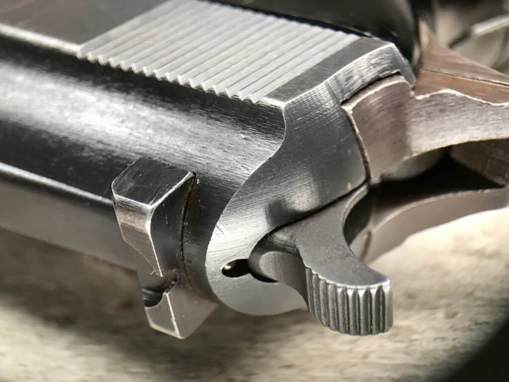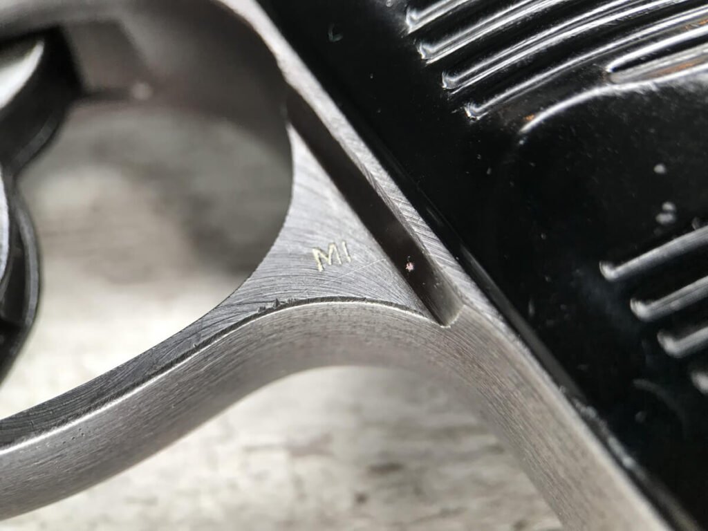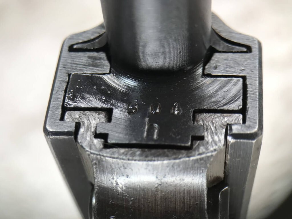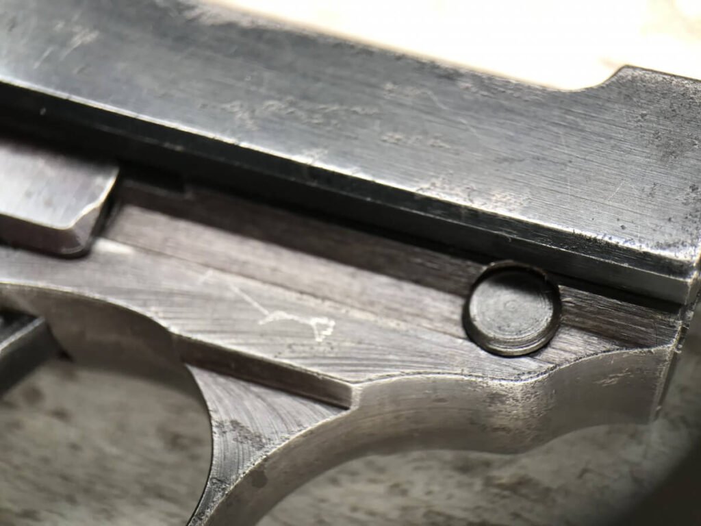 WALTHER AC 44 P.38 9MM SEMI AUTO PISTOL W/FN FRAME, RARE #901h, 9MM, ALL MATCHING, FN FRAME, RARE EAGLE/140 PROOF ON THE FRAME TO DENOTE IT WAS MANUFACTURED BY FN, ORIGINAL FINISH OF 93% BLUE (LIGHT HIGH EDGE WEAR), 5″ BBL, TINY “DINGS” ON RIGHT SIDE OF SLIDE, EXC BRIGHT BORE W/STRONG RIFFLING, EXC TYPE 1 POLYAMID-6-GRIPS GRIPS, FAIR MAG-“P.38v” ON LEFT SIDE OF MAG, 93% CONDITION
