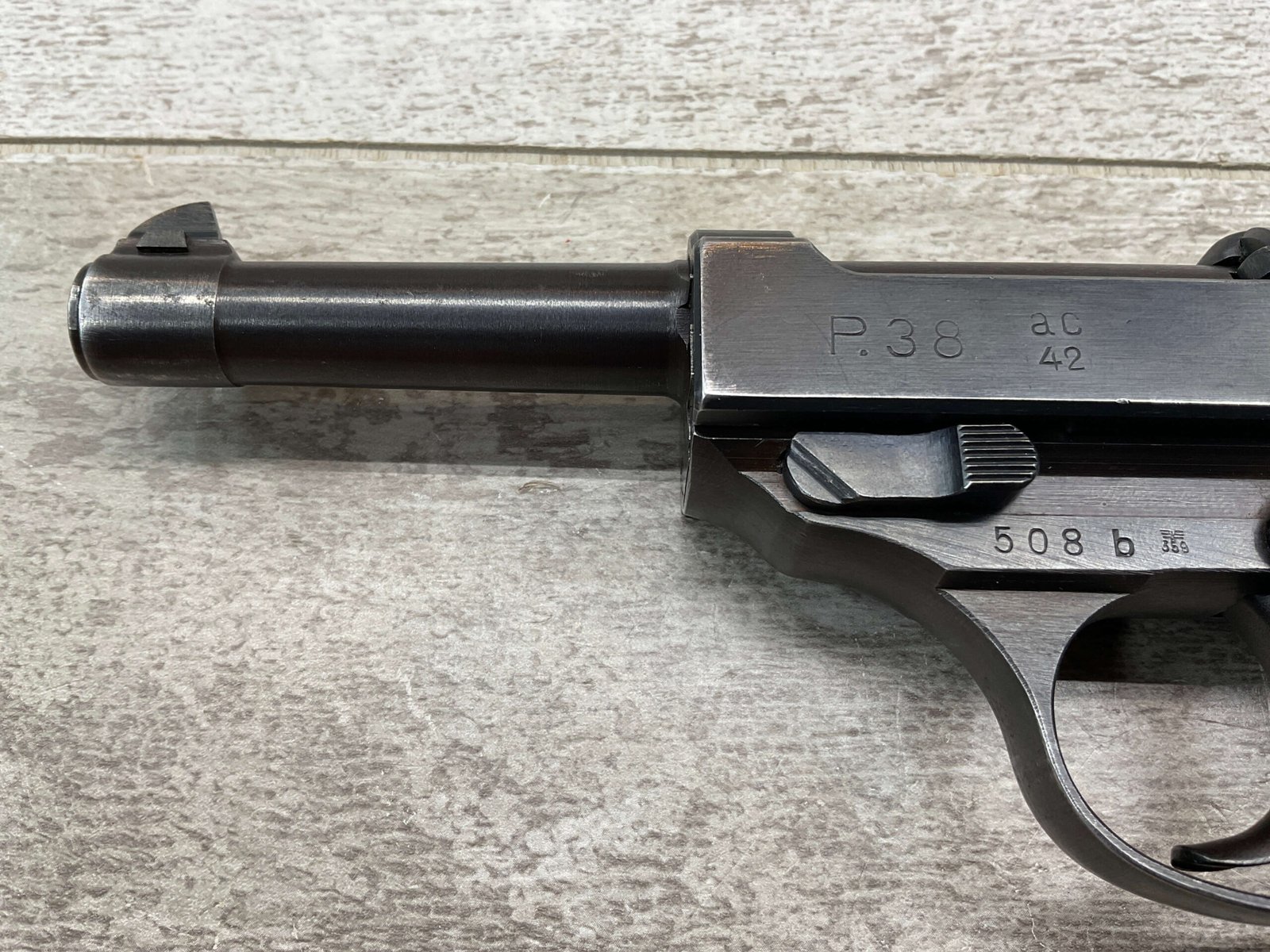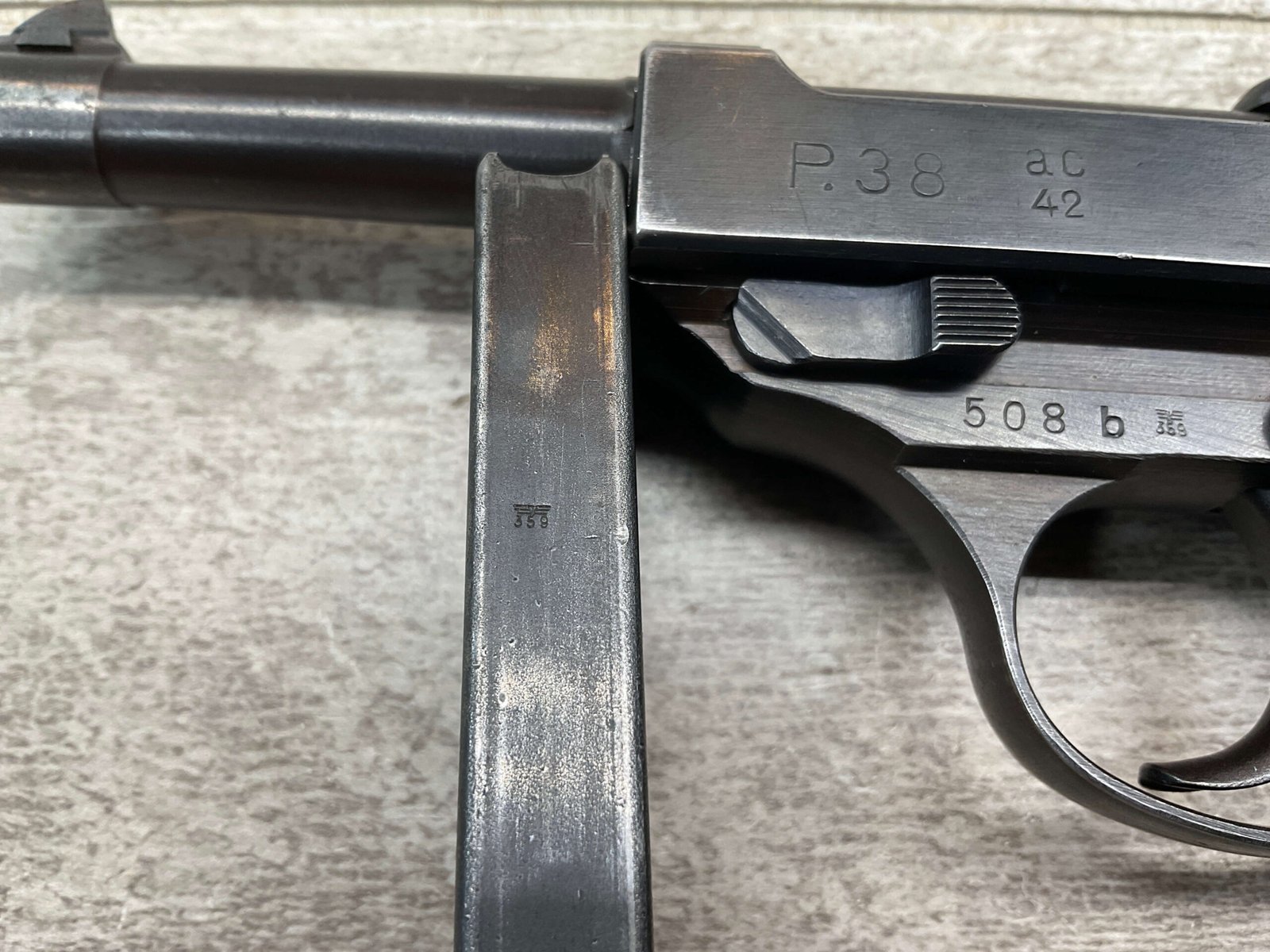 The Walther P38 produced in 1942 would have been one of the wartime variants used extensively by German forces during World War II. These pistols were manufactured to high standards of German engineering and craftsmanship. They typically featured a 9mm caliber, a double-action trigger system, and a capacity of 8 rounds in the magazine.
