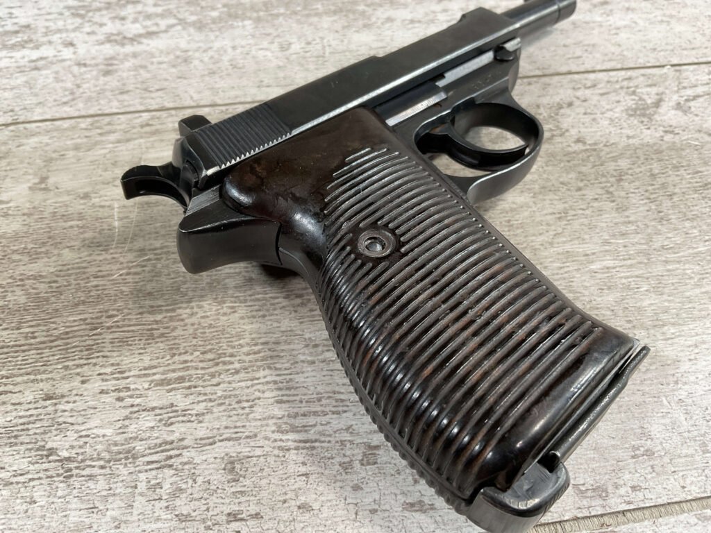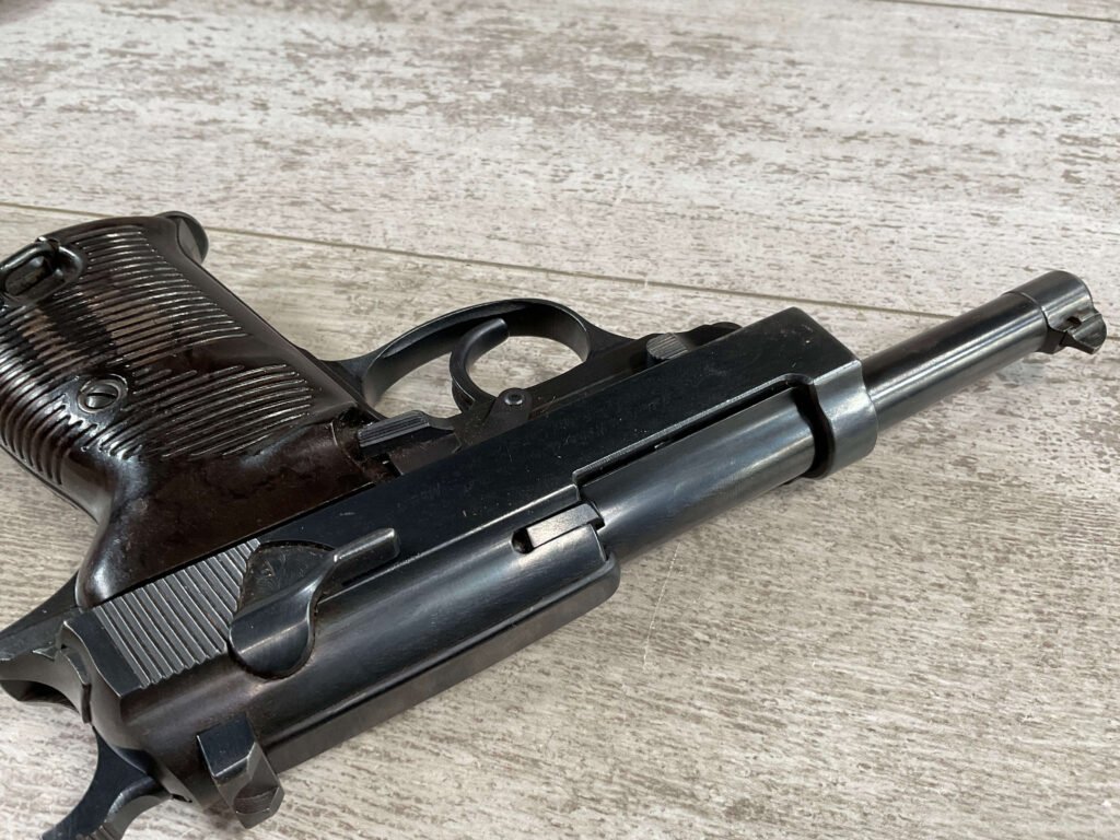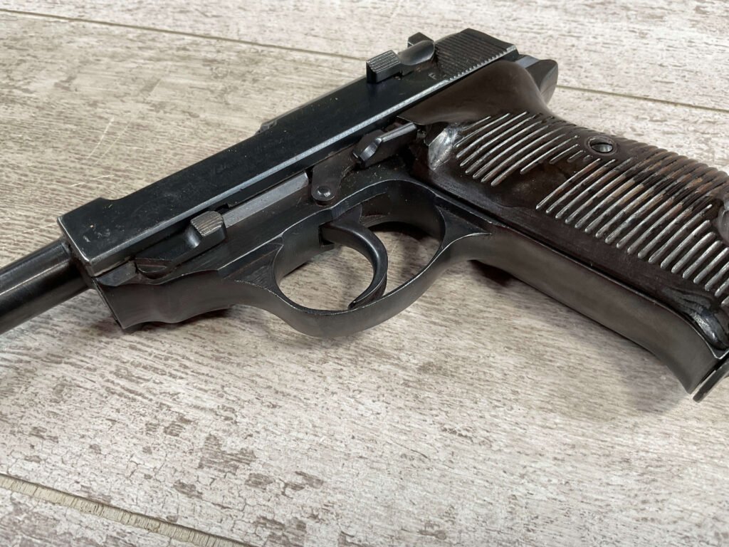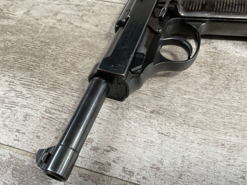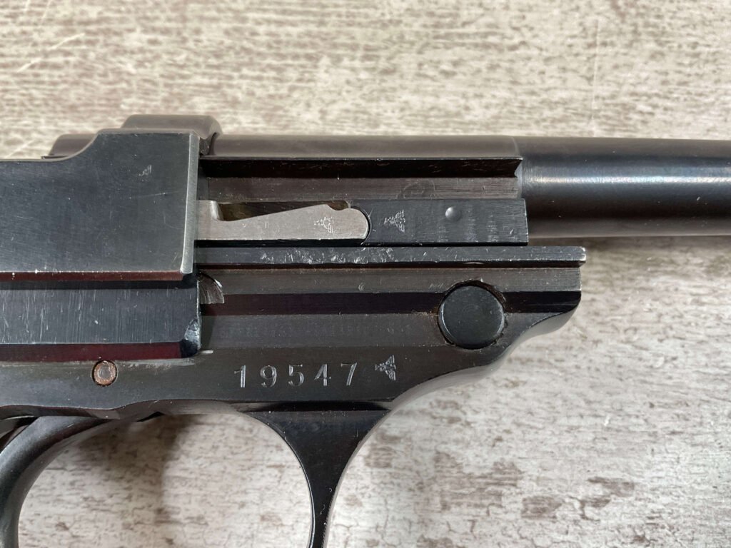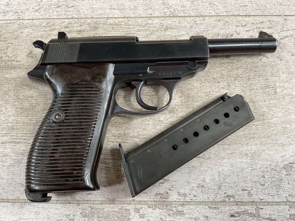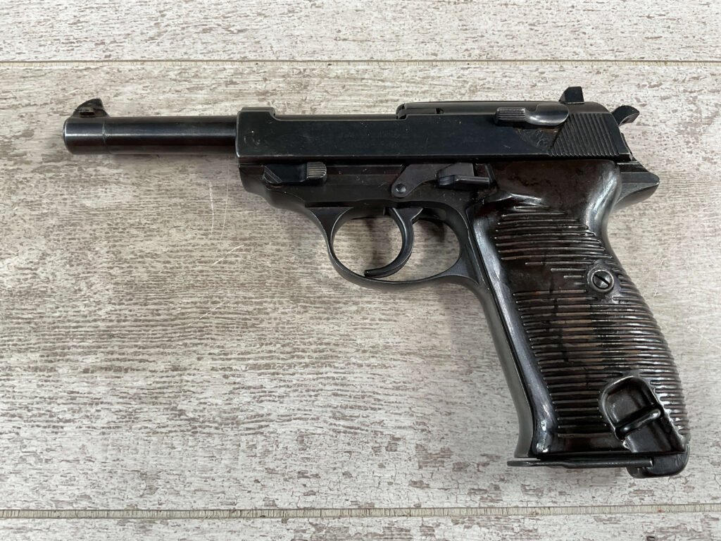 WALTHER HP HEERES ARMY P38 PISTOL #19547, 1943 MFR, 9MM, BORE HAS STRONG RIFLING W/FROST THROUGHOUT, REFINISHED, PROPER “EAGLE/N” COMMERCIAL PROOFS, NO IMPORT MARKS, WW2 BAKELITE GRIPS, DE-COCKER IS NOT FUNTIONAL, P1 9MM WALTHER MAGAZINE, POST WAR BERLIN BLACK HOLSTER, 90+%