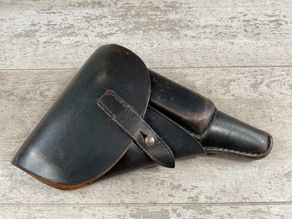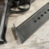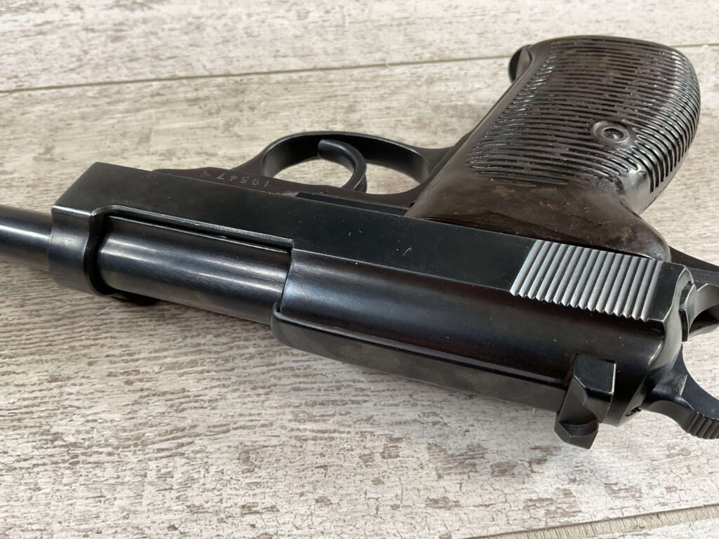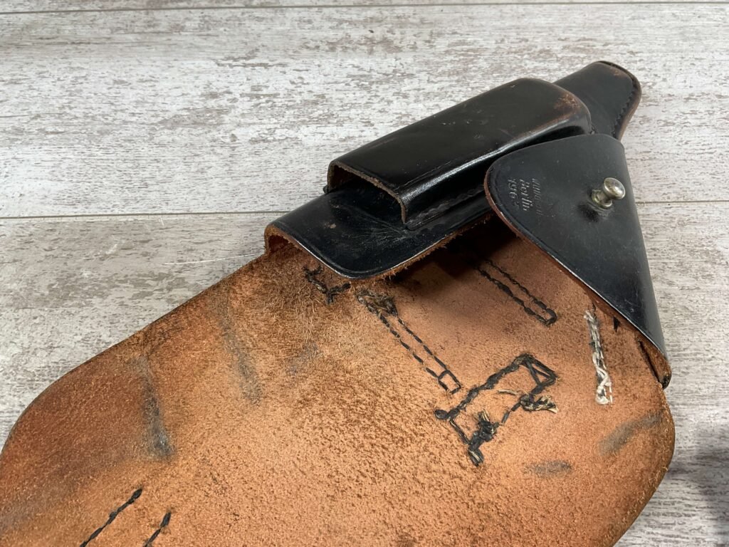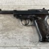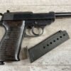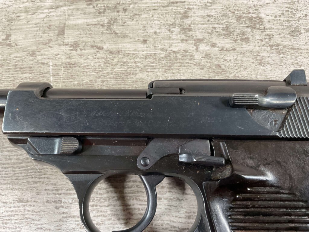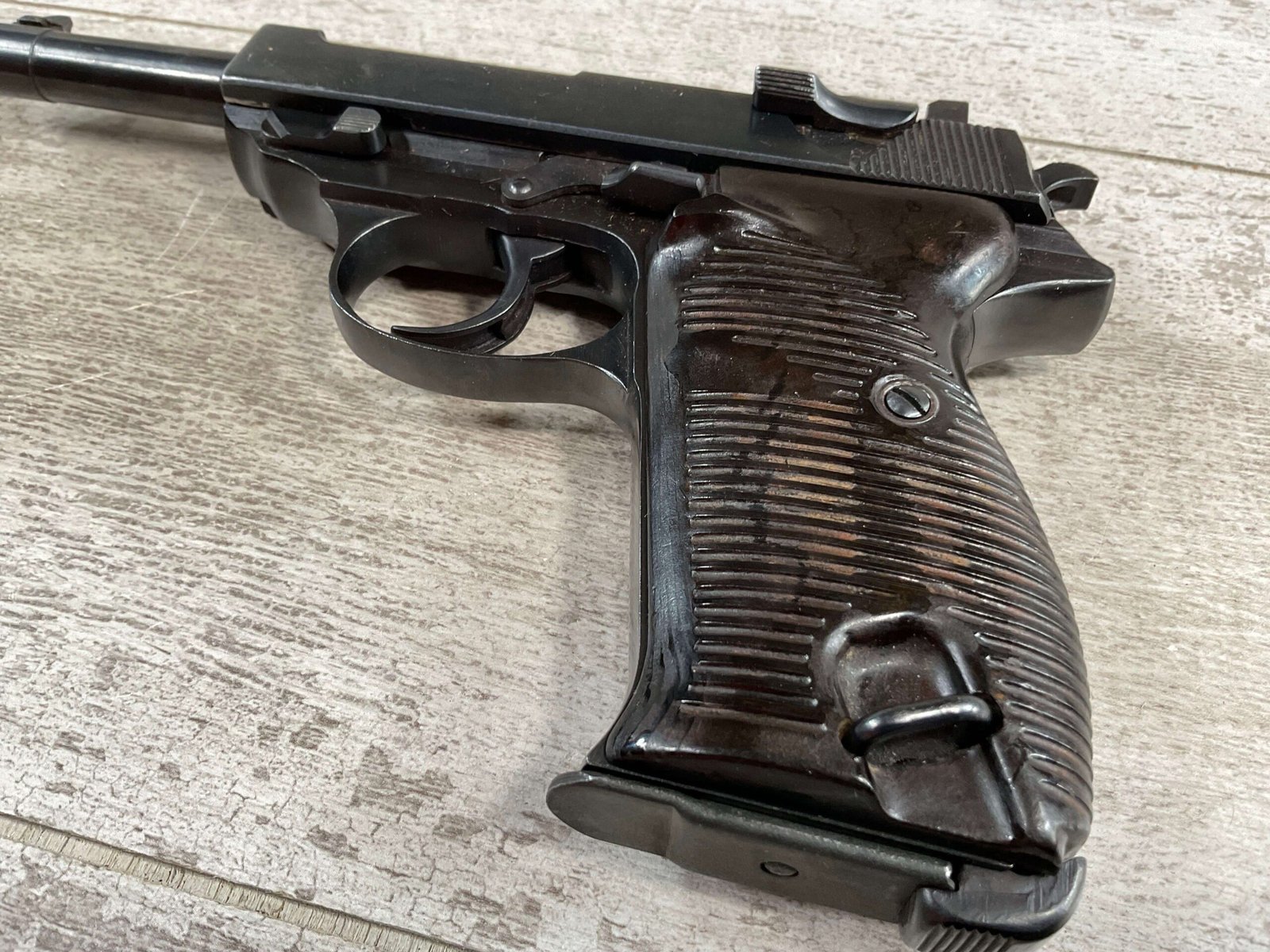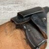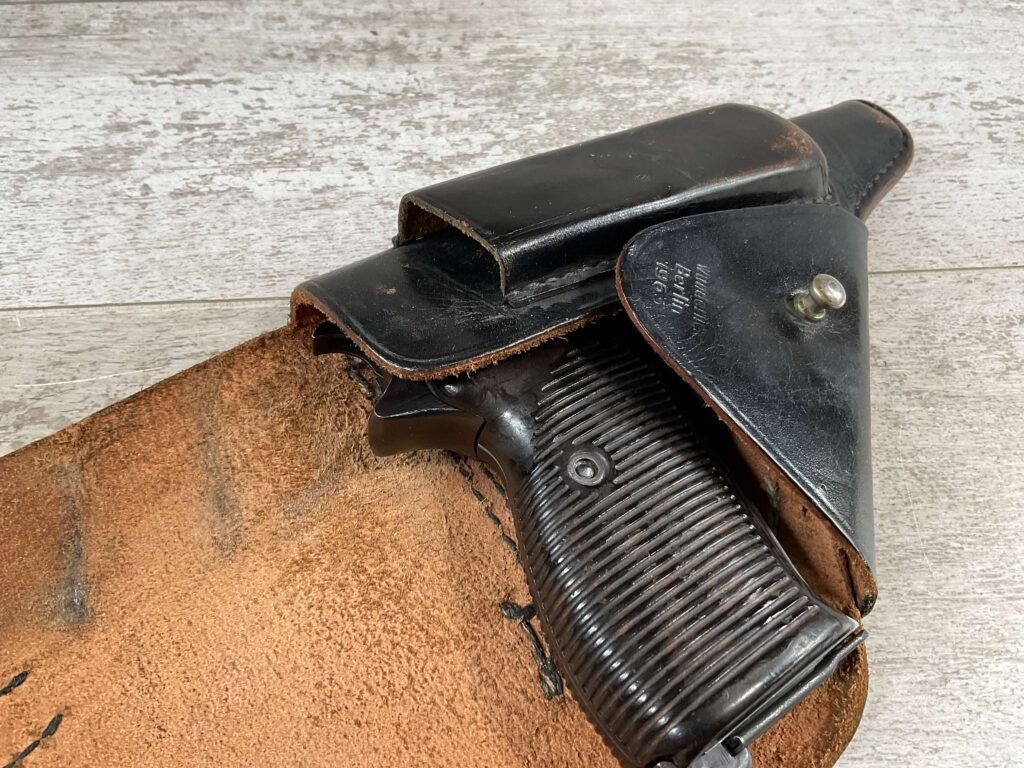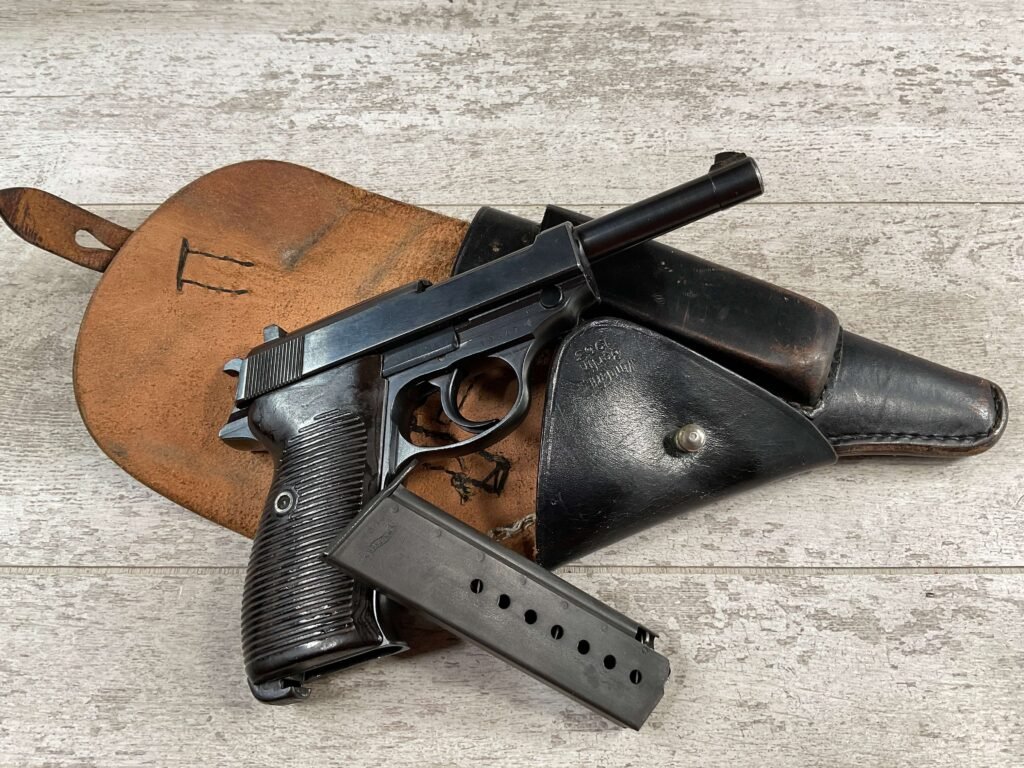 WALTHER HP HEERES ARMY P38 PISTOL #19547, 1943 MFR, 9MM, BORE HAS STRONG RIFLING W/FROST THROUGHOUT, REFINISHED, PROPER “EAGLE/N” COMMERCIAL PROOFS, NO IMPORT MARKS, WW2 BAKELITE GRIPS, DE-COCKER IS NOT FUNTIONAL, P1 9MM WALTHER MAGAZINE, POST WAR BERLIN BLACK HOLSTER, 90+%