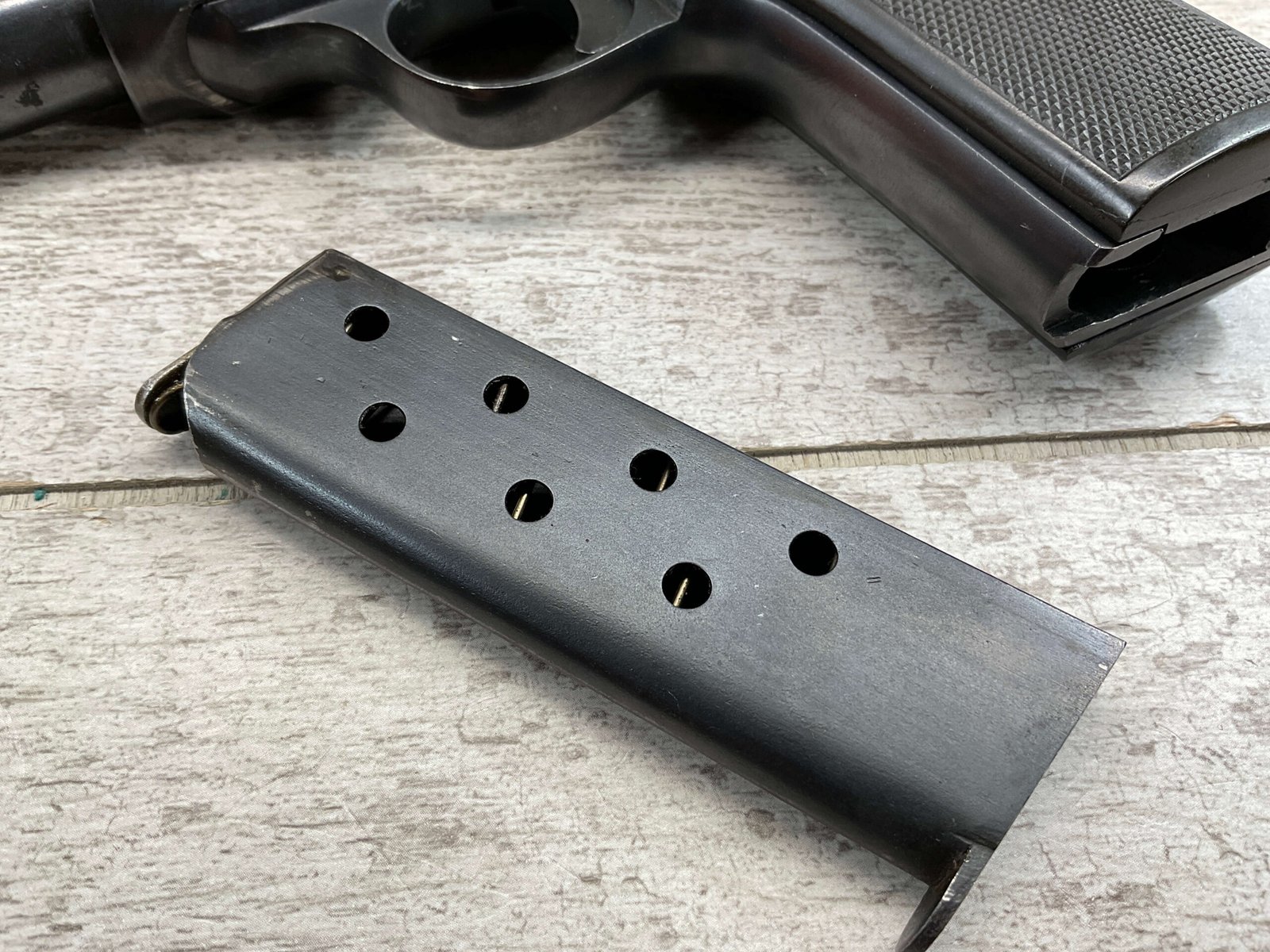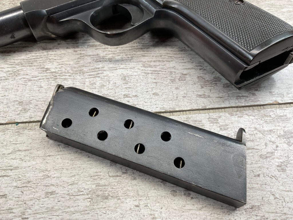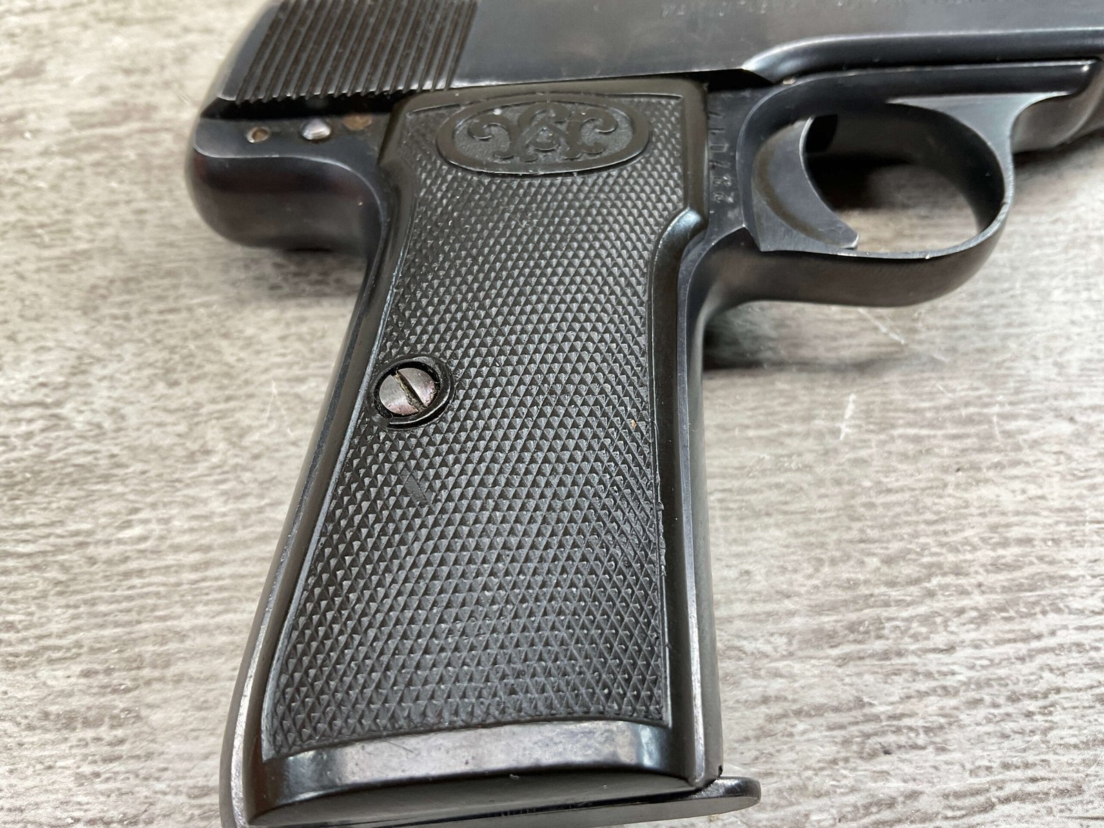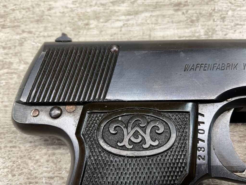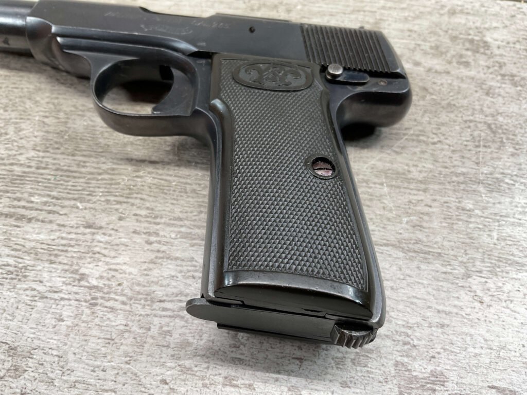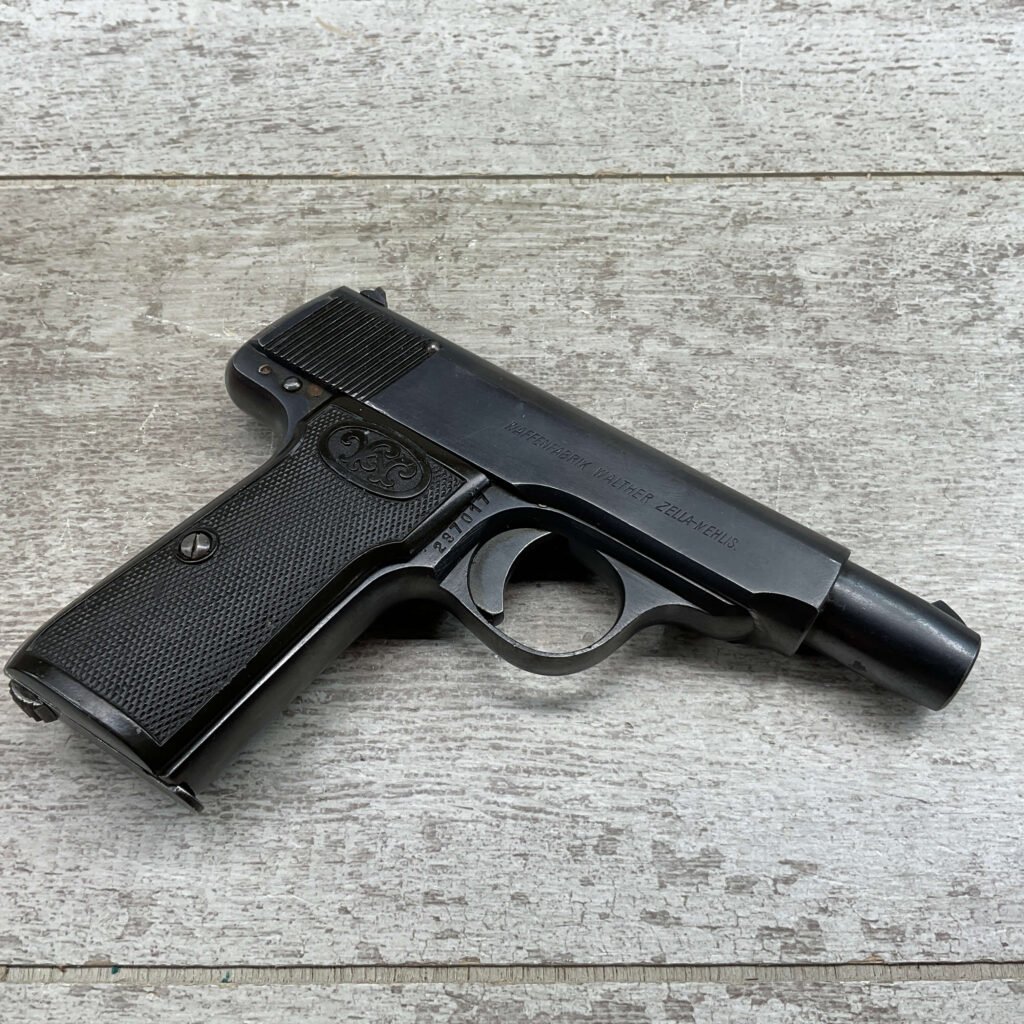 WALTHER MODEL 4 7.65MM SEMI-AUTO PISTOL, 3RD VARIATION #237017, 7.65MM, EXC ORIGINAL BLUE FINISH, EXC BLACK CHECKERED GRIPS, 16 SLIDE SERRATIONS, RAISED REAR SIGHTS, TRIANGULAR FRONT SIGHTS, LEFT SIDE MARKED “WALTHER’S PATENT CAL 7.65”, RIGHT SIDE MARKED “WAFFENFABRIK WALTHER ZELLA-MEHLIS”, INTERNAL TRIGGER BAR, OVAL EJECTION PORT, EXC MAGAZINE, EXC BORE & RIFLING, VERY NICE! 95%+ OVERALL