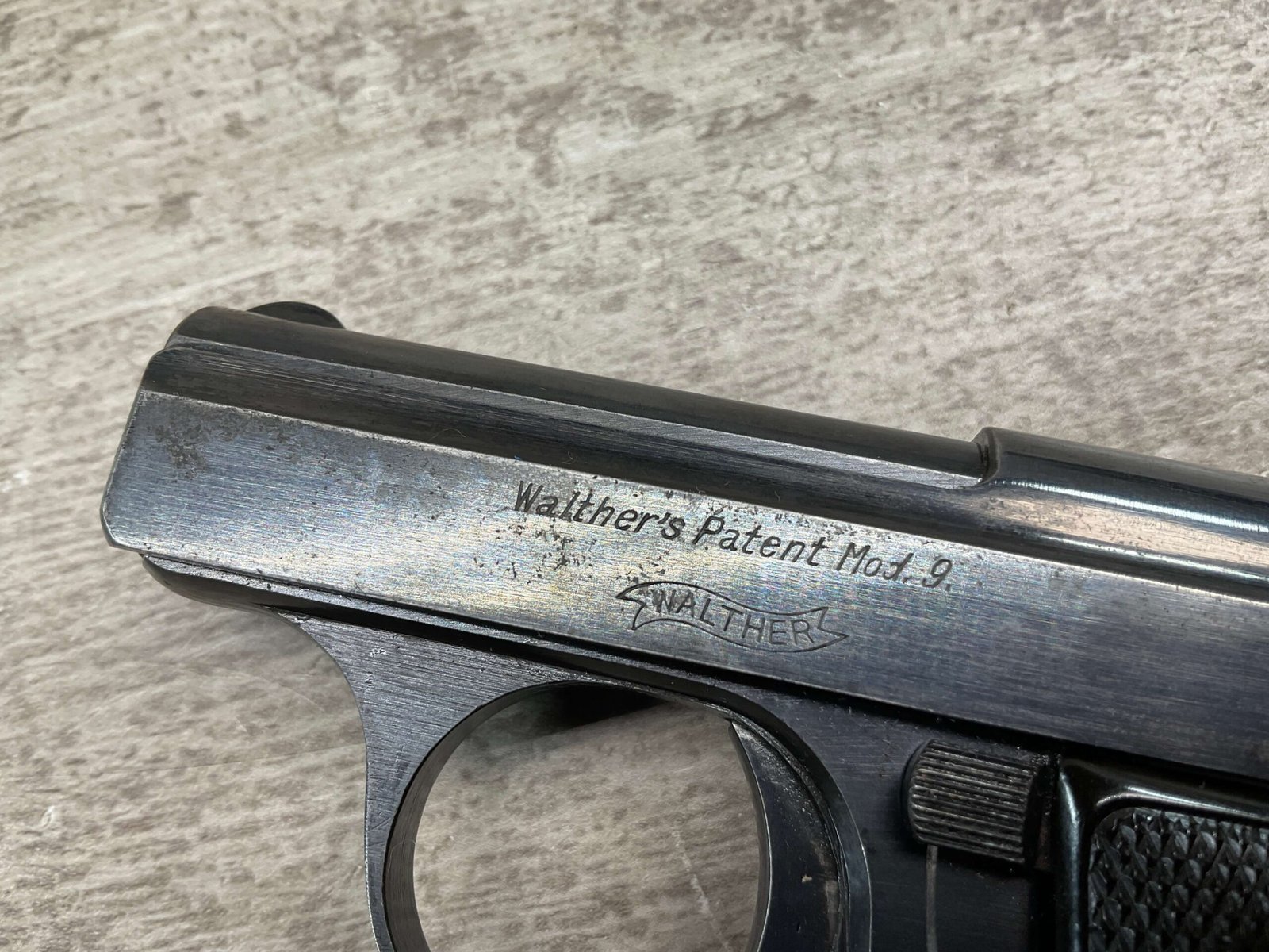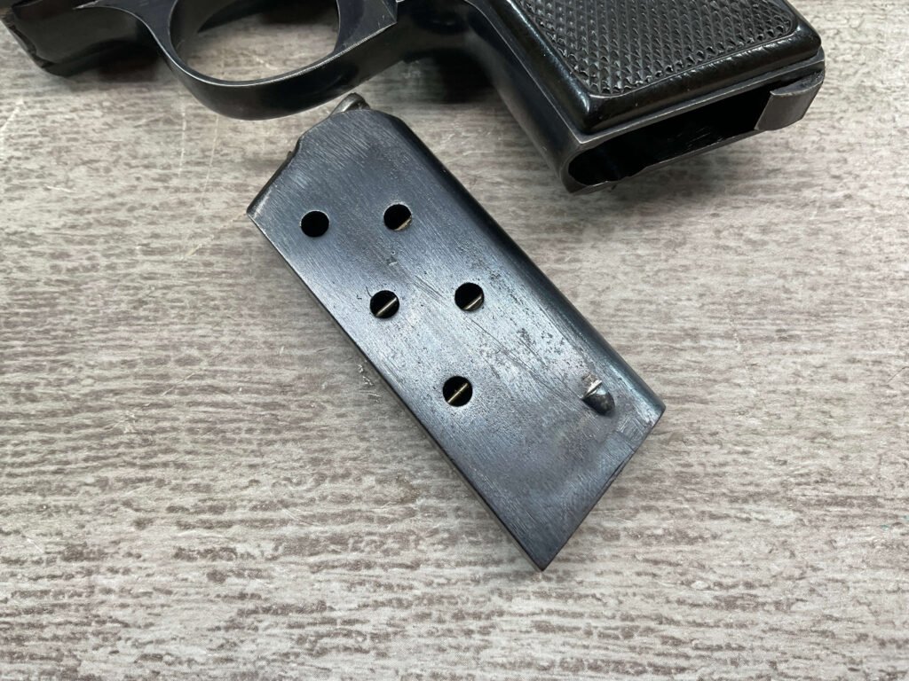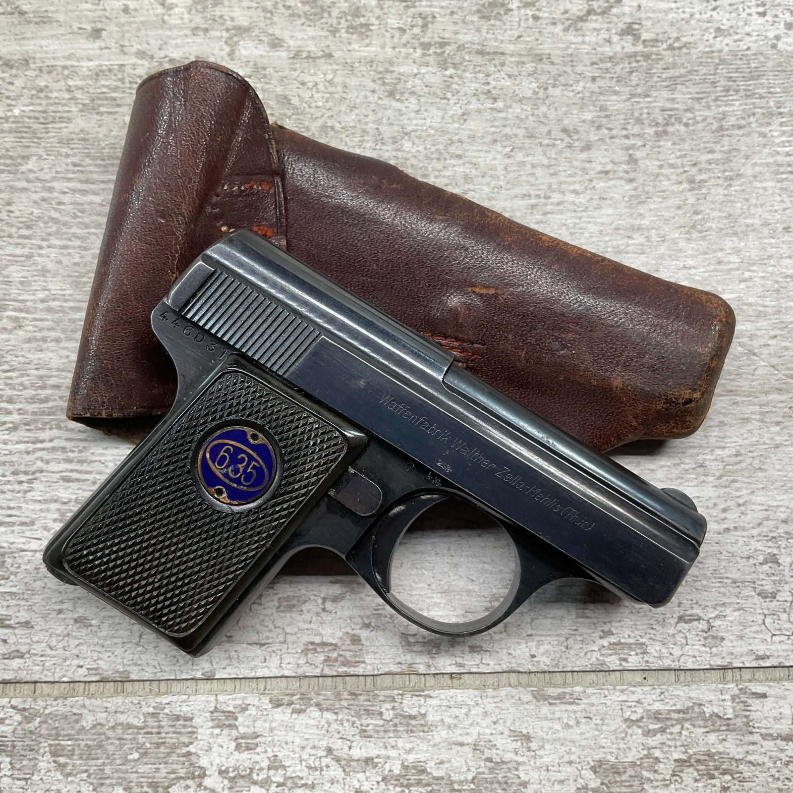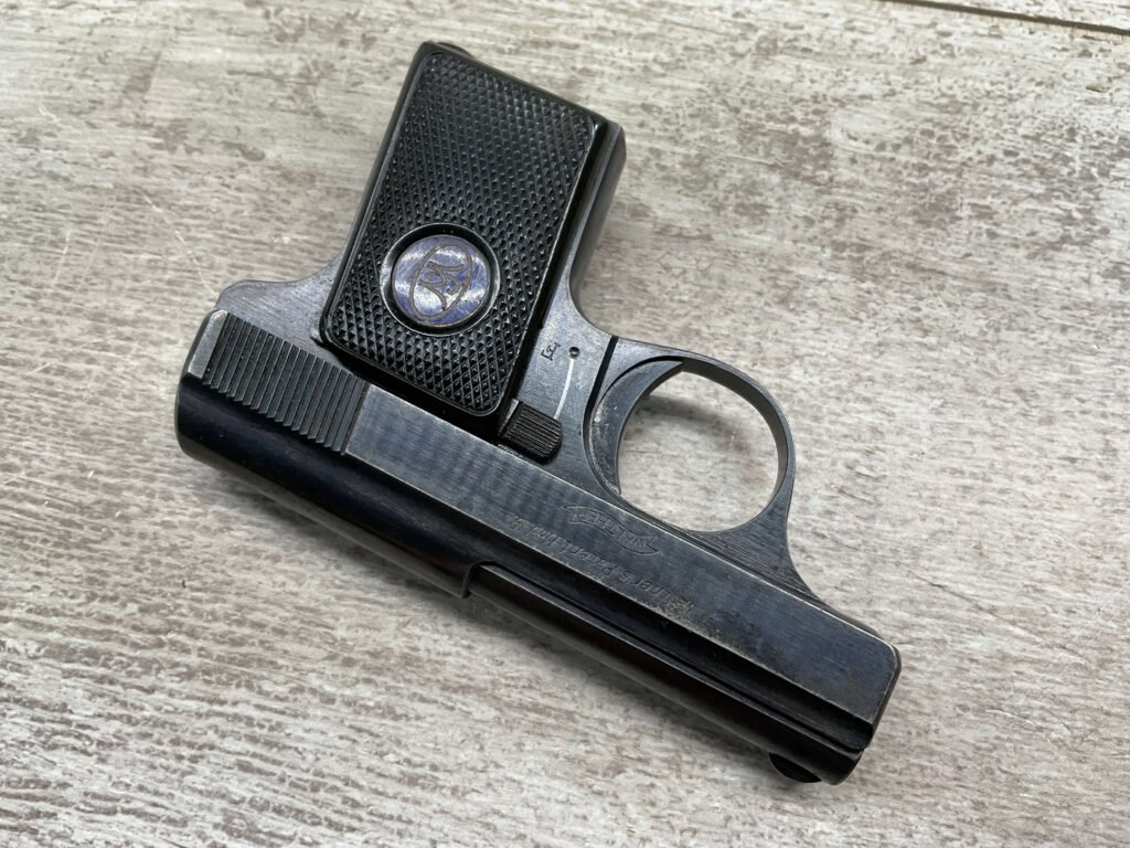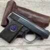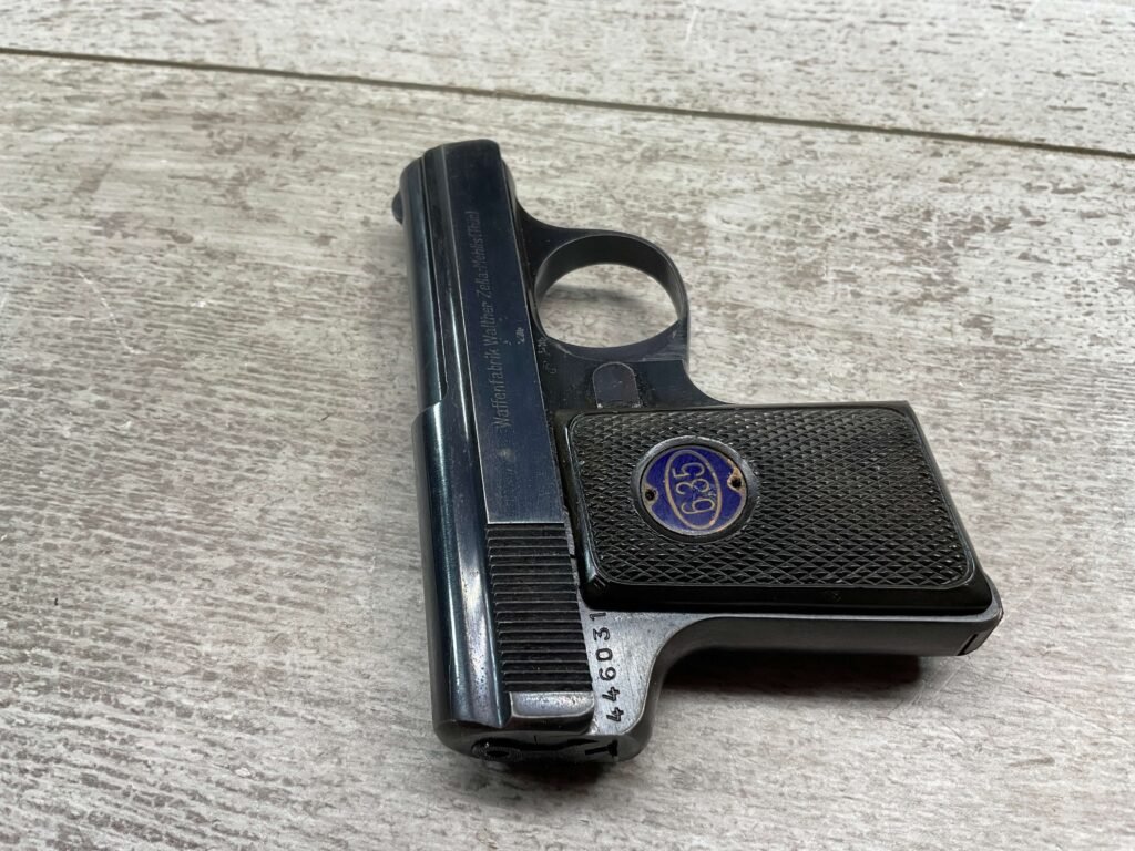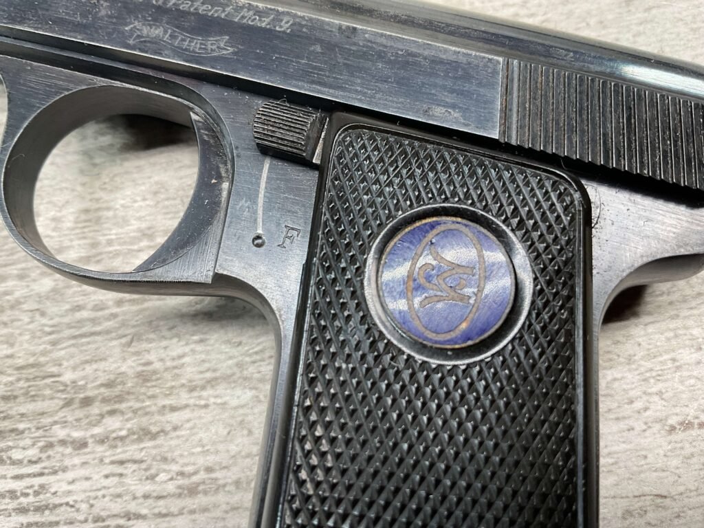 WALTHER MODEL 9 .25ACP POCKET PISTOL #446031, ALL MATCHING, 2″ BARREL, EXC ORIGINAL BLUING W/COUPLE SPOTS OF OXIDATION ON THE SLIDE, BRIGHT BORE & GOOD RIFLING, GRIPS ARE EXCELLENT WITH MEDALLIONS PRESENT, 1 UNMARKED MAGAZINE, BROWN LEATHER HOLSTER, BUILT IN THE LATE 1920’S, 90+% OVER ALL