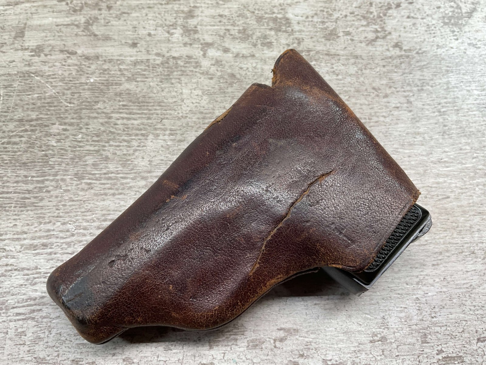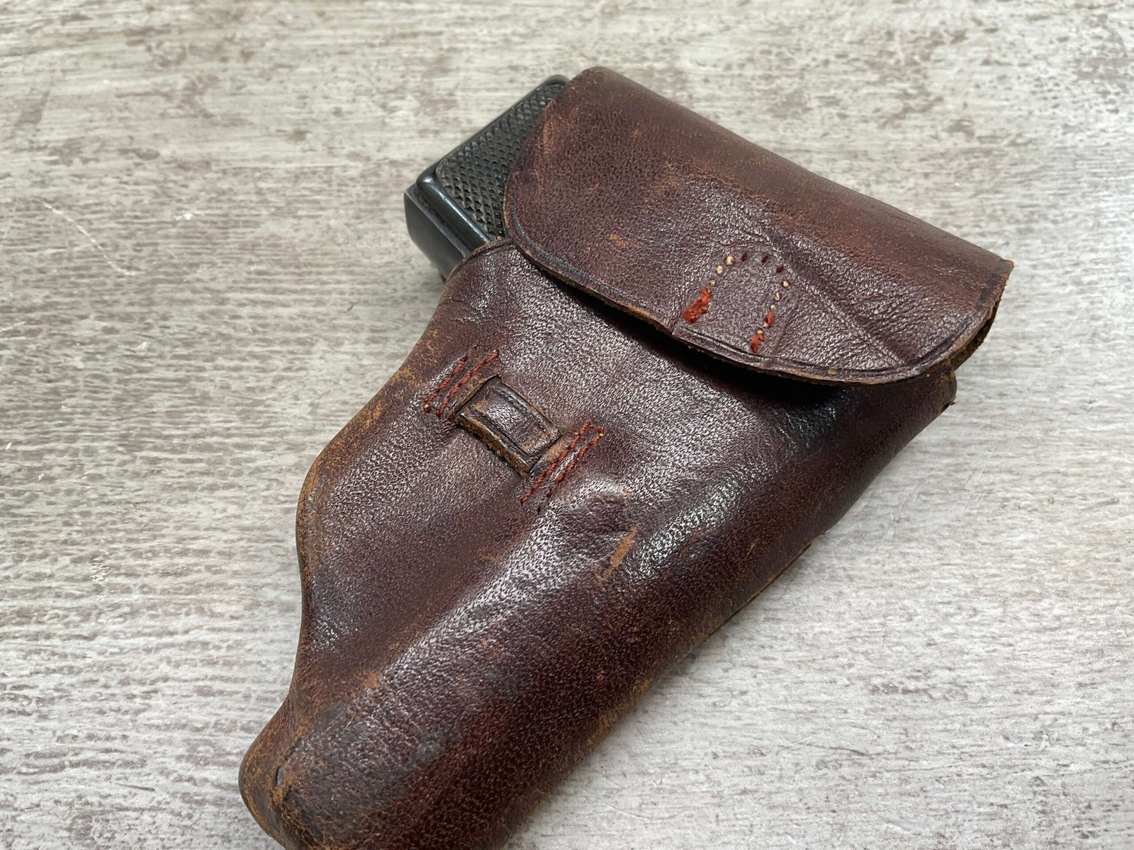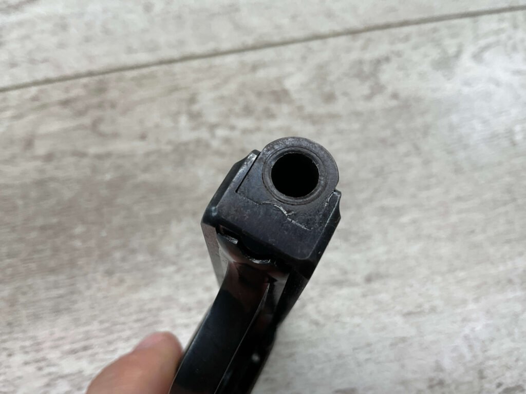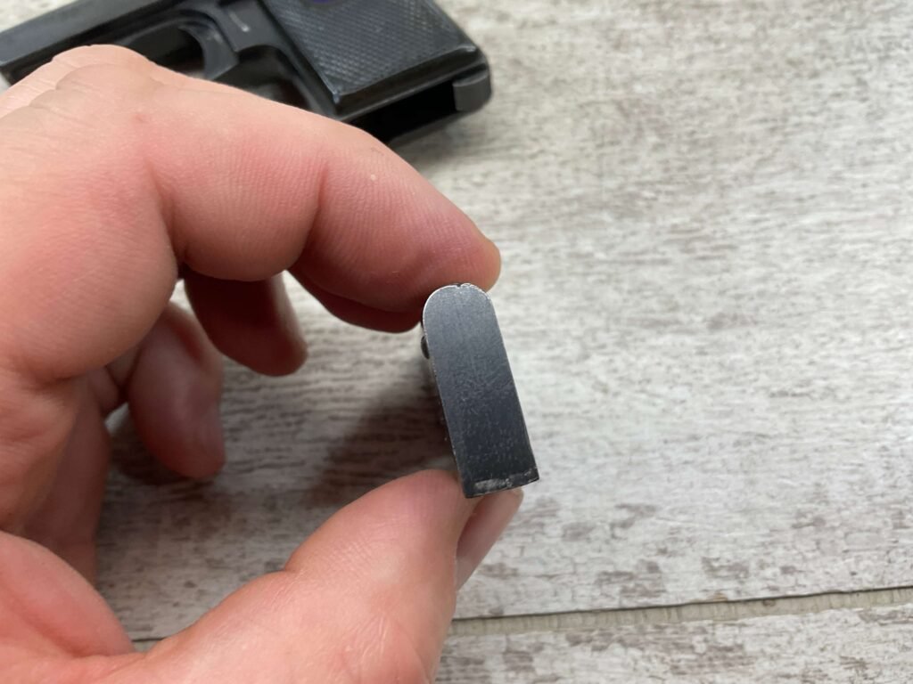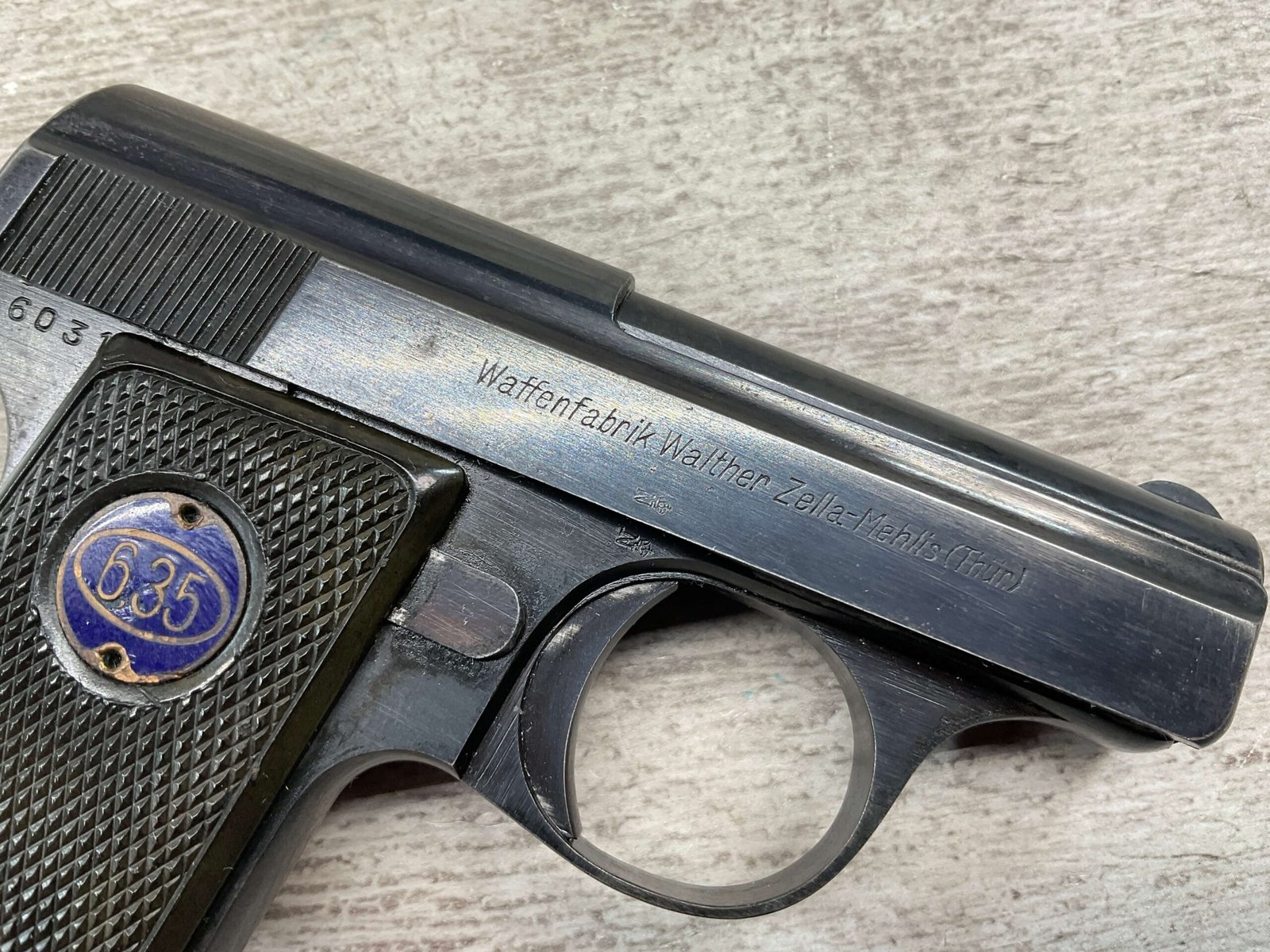 WALTHER MODEL 9 .25ACP POCKET PISTOL #446031, ALL MATCHING, 2″ BARREL, EXC ORIGINAL BLUING W/COUPLE SPOTS OF OXIDATION ON THE SLIDE, BRIGHT BORE & GOOD RIFLING, GRIPS ARE EXCELLENT WITH MEDALLIONS PRESENT, 1 UNMARKED MAGAZINE, BROWN LEATHER HOLSTER, BUILT IN THE LATE 1920’S, 90+% OVER ALL