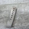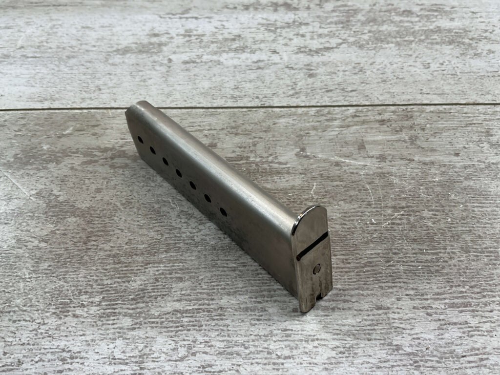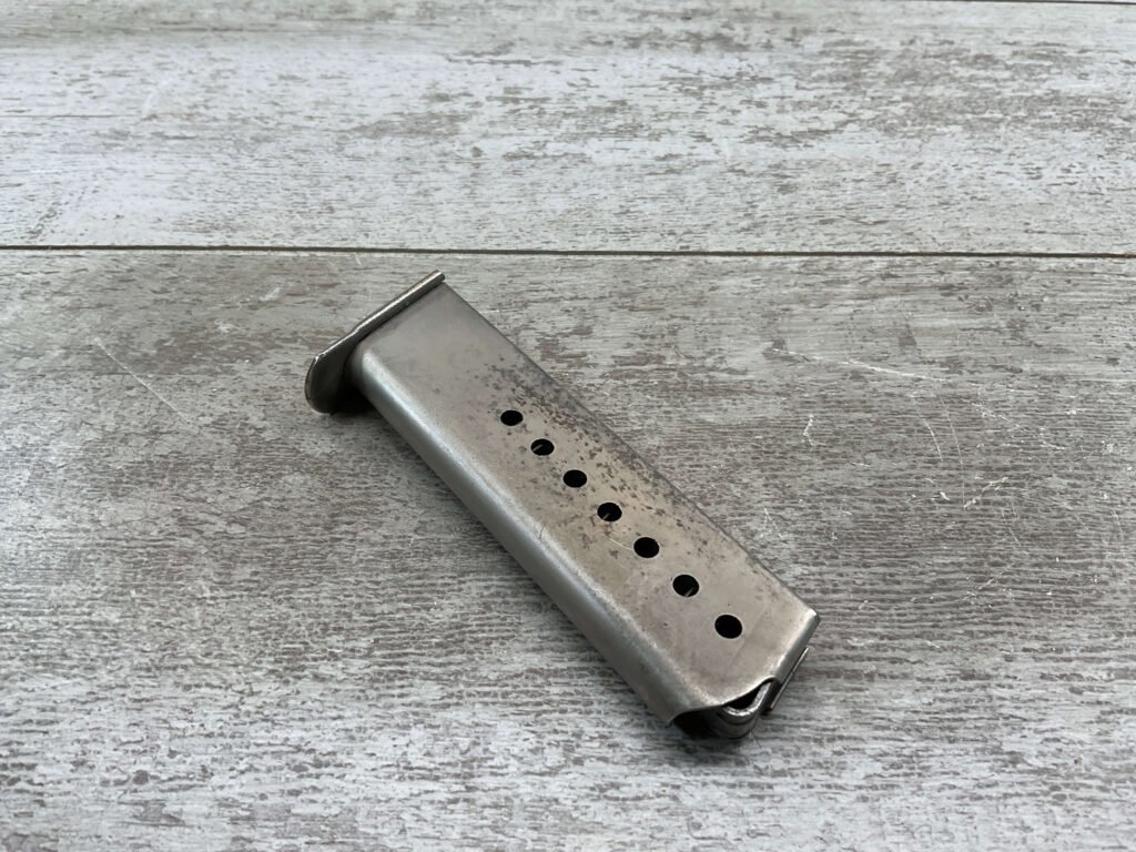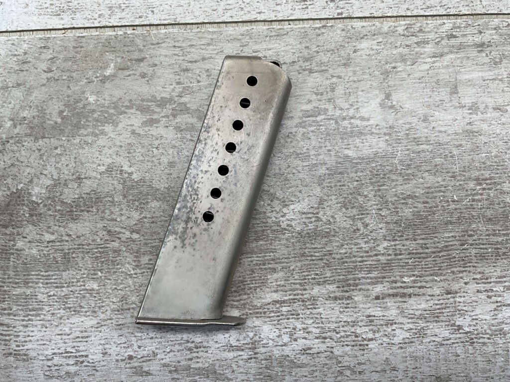 WALTHER P1 9MM MAGAZINE, RIGHT SIDE MARKING NONE, SPINE STAMPED “7/63”, LEFT SIDE STAMPED “P1/9MM X 19”, NICKLE FINISH WITH CHROME BASE, LIGHT DISCOLORATION, LIGHT USE WEAR, VG CONDITION