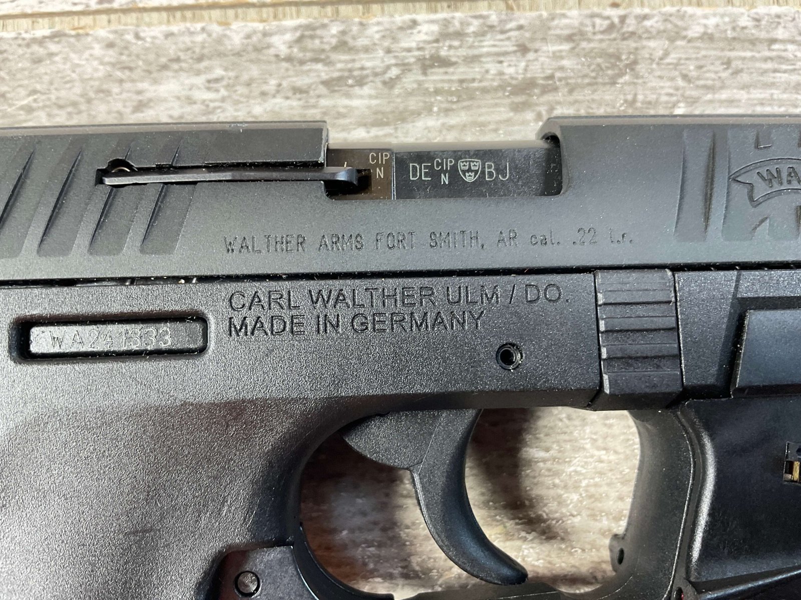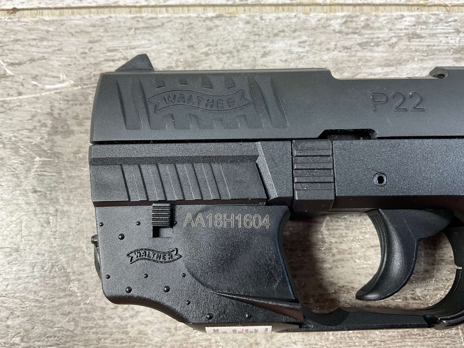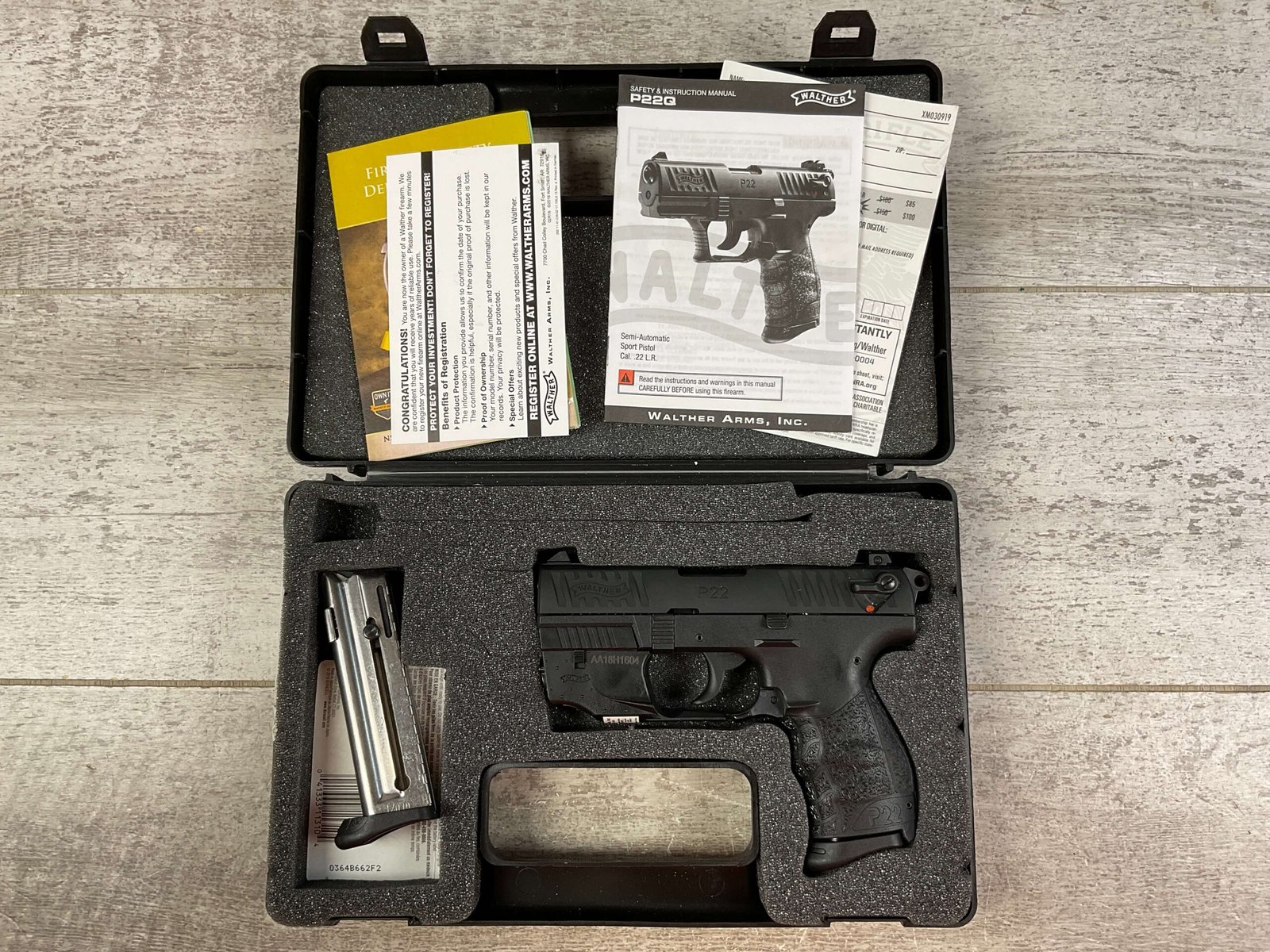 WALTHER P22Q .22LR 10-RD SA SEMI AUTO PISTOL, W/ LASER #WA241333 SA/DA, BLACK POLYMER FRAME, 3.42″ BARREL, 10 SHOT MAGAZINE, LOWER ACCESSORY RAIL (WALTHER ARMS LASER MOUNTED), LOADED CHAMBER INDICATOR, DECOCKING SAFETY, TWO MAGS, LIKE NEW IN ORIGINAL PLASTIC BOX W/MANUAL