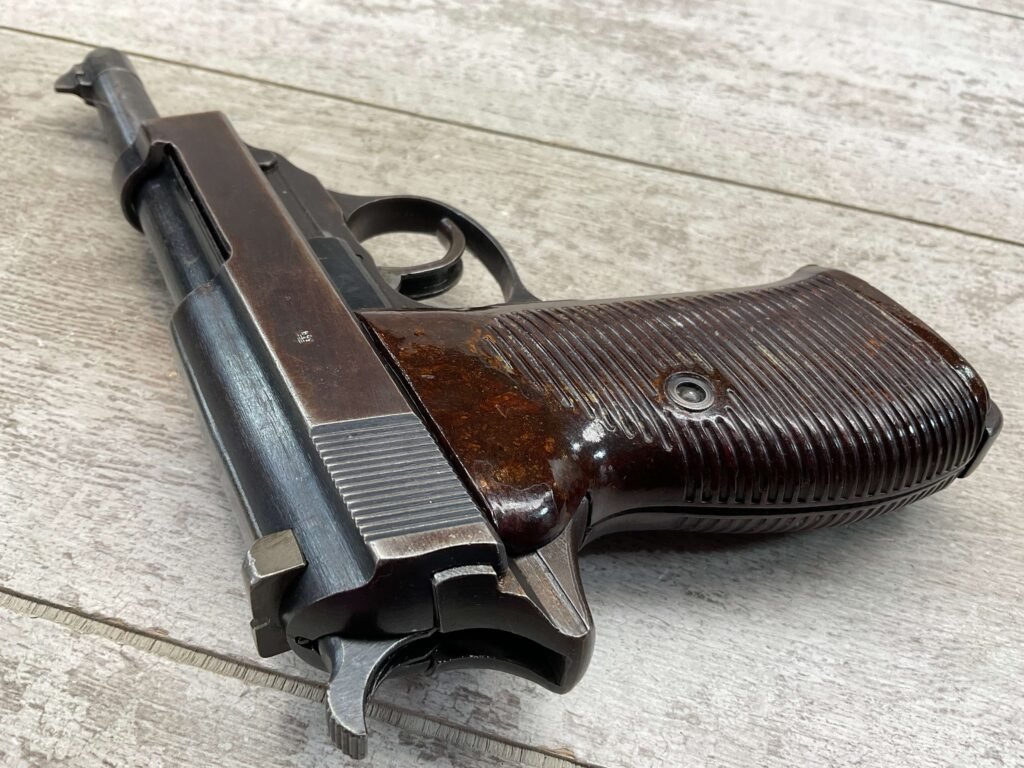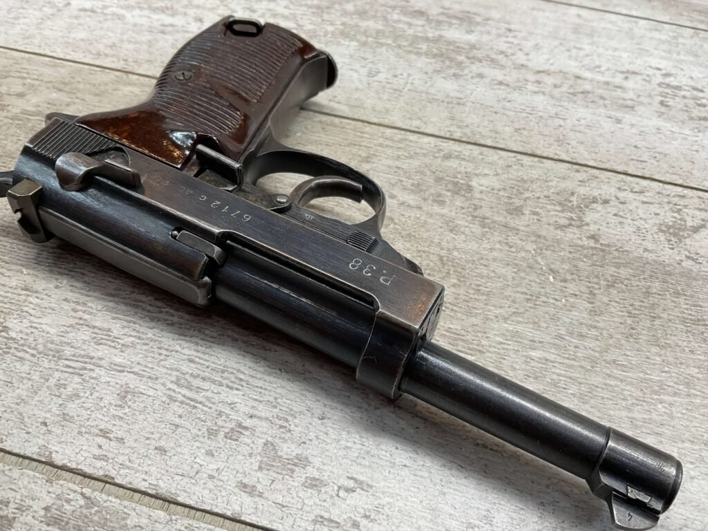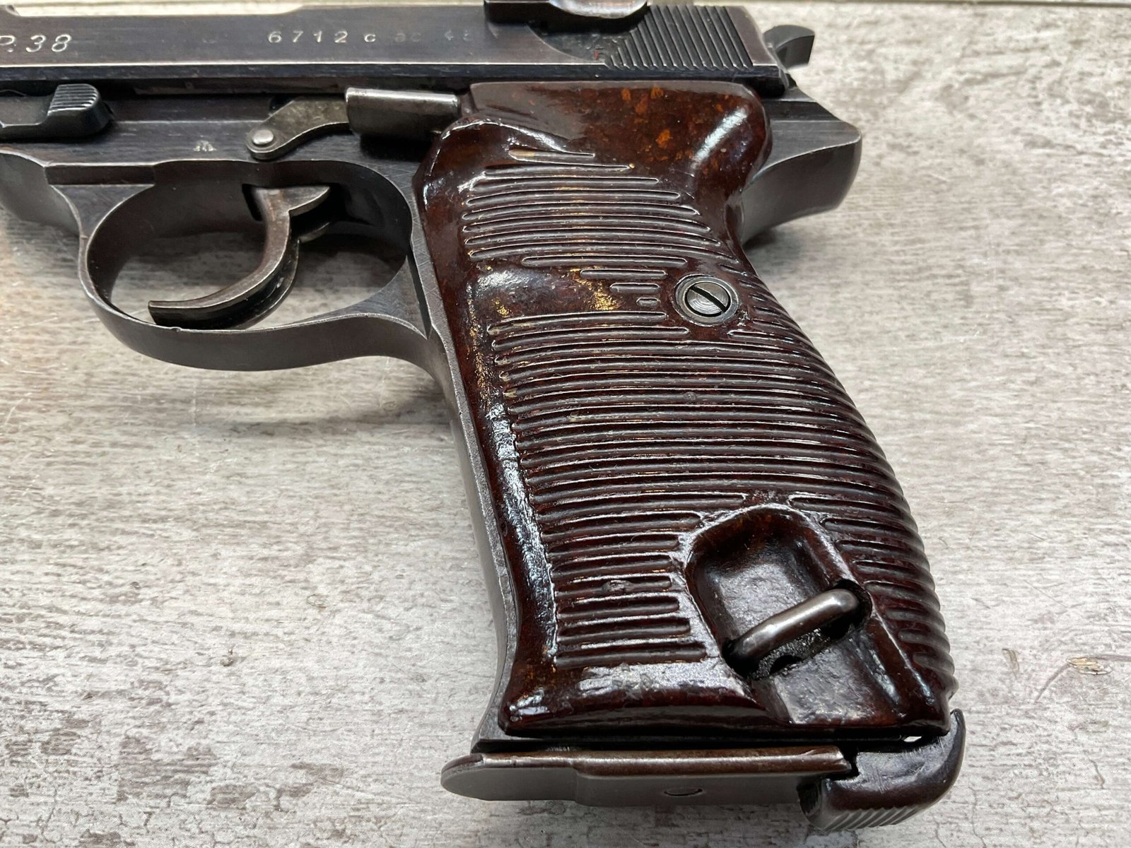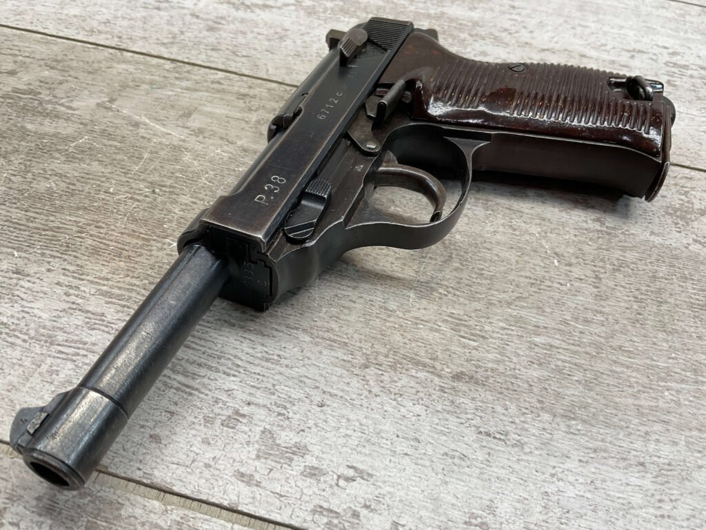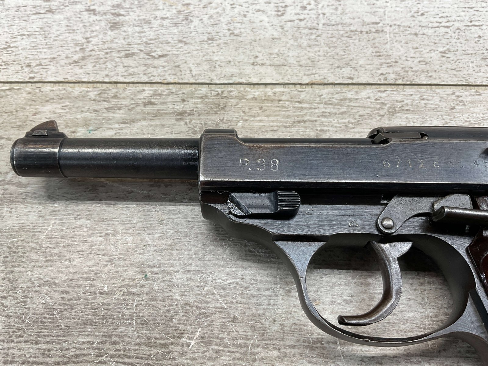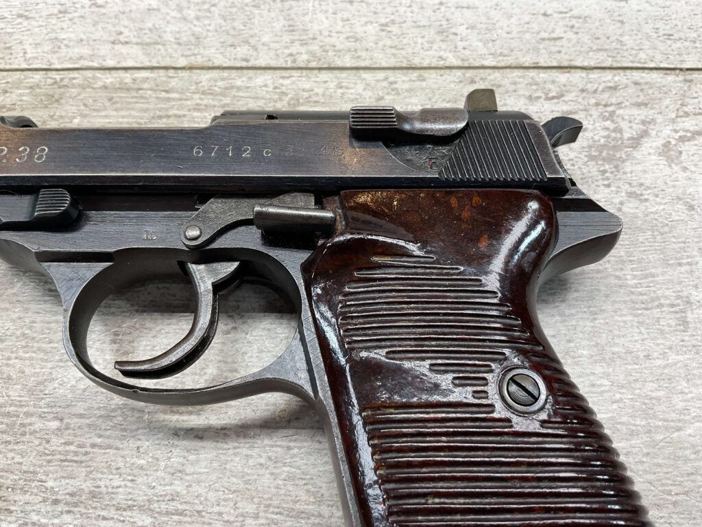 WALTHER P38 AC45 9MM SEMI AUTO PISTOL, NON MATCHING #6335c, #6712c SLIDE, 90%+ BLUE, 4 7/8″ BARREL, ORIGINAL RED BAKELITE GRIPS, “P.38v / U” STAMPED MAGAZINE, DULL MILITARY FINISH, GOOD BORE & RIFLING W/ LIGHT FROSTING IN AREAS, “359” INSPECTION STAMP ON LEFT SIDE OF FRAME ABOVE TRIGGER, EXCELLENT LATE WAR!