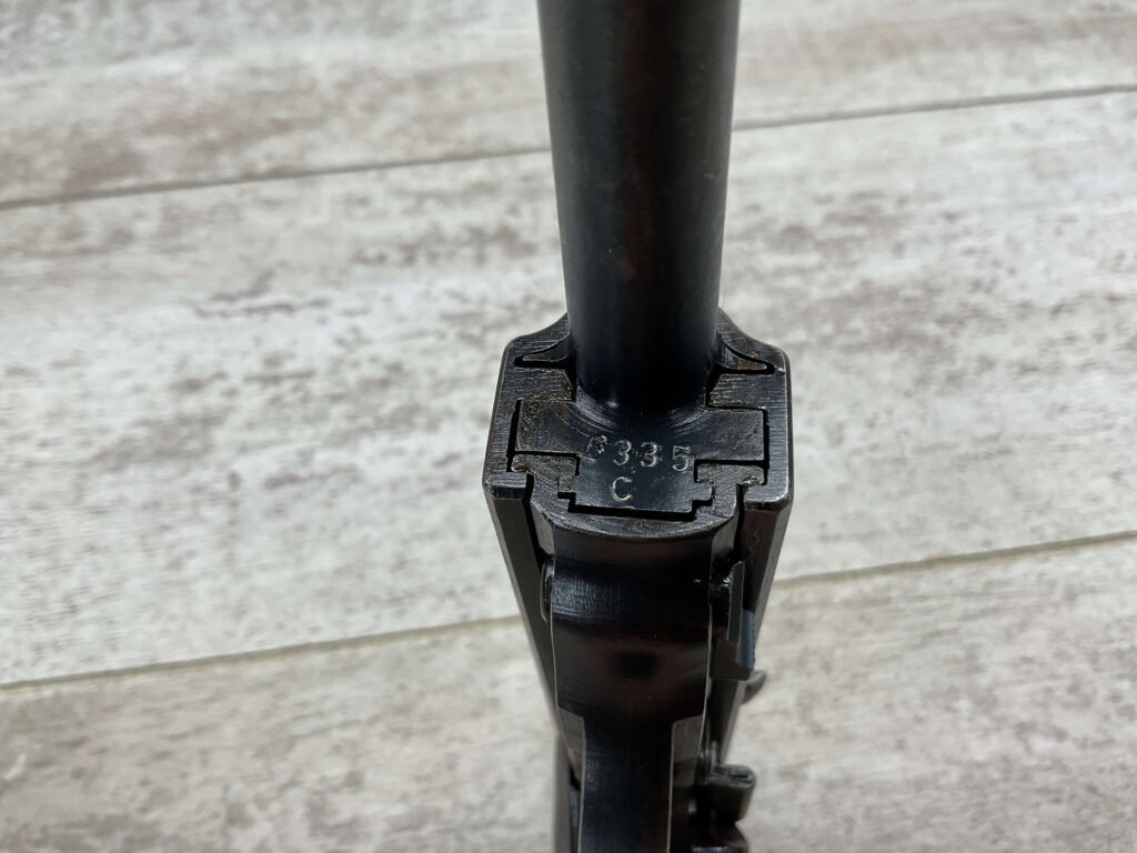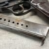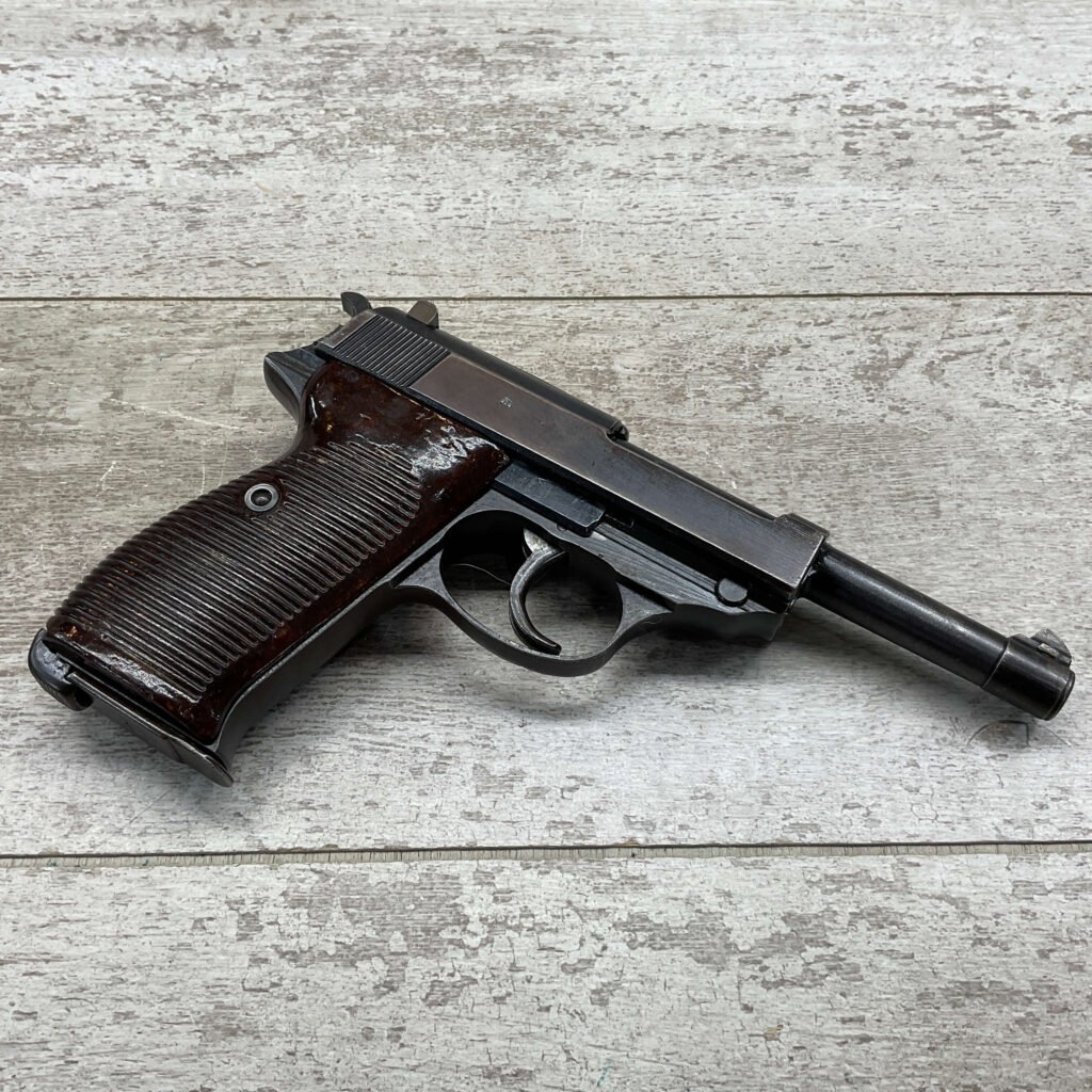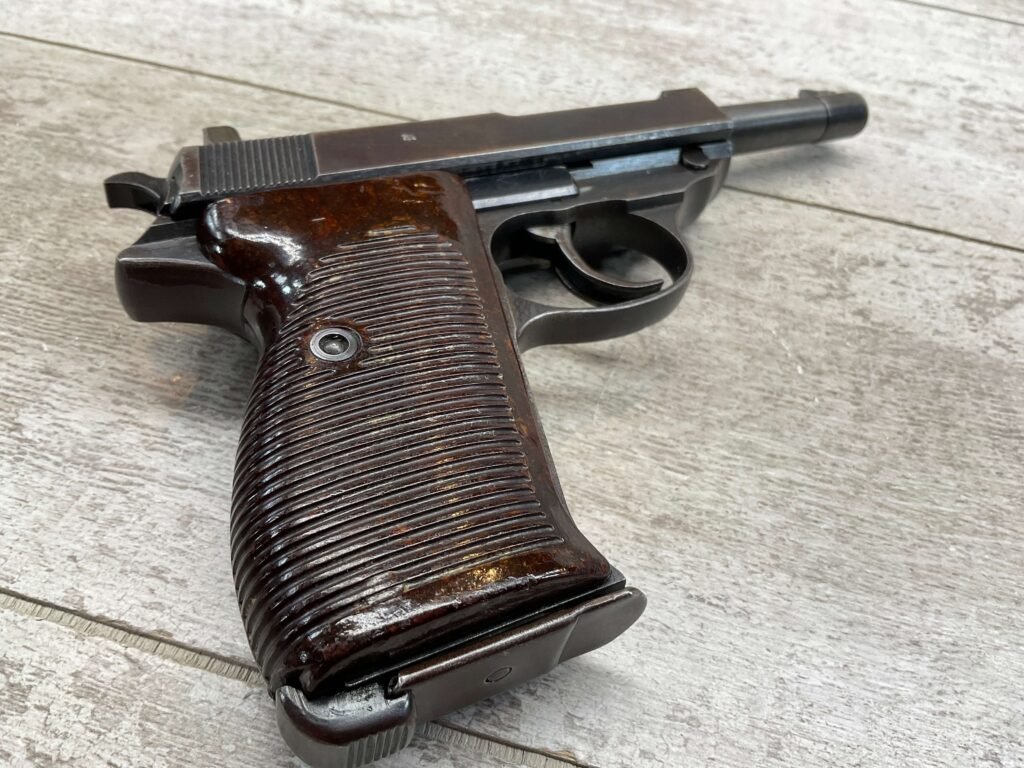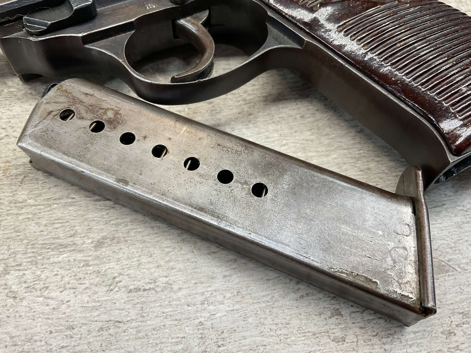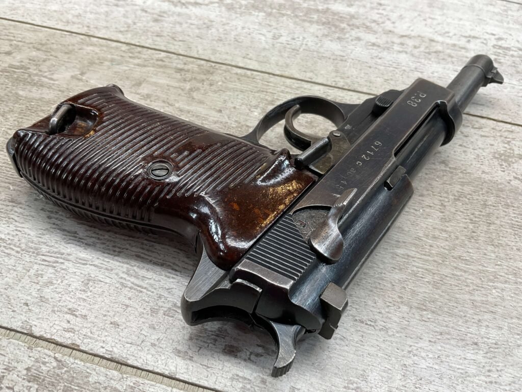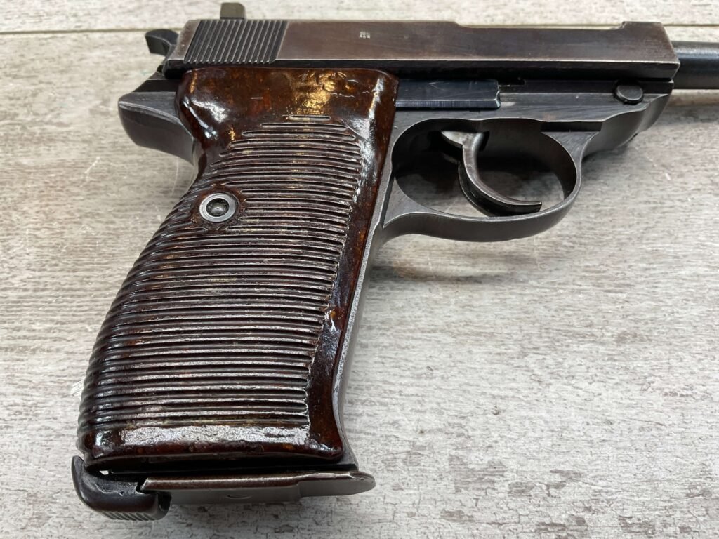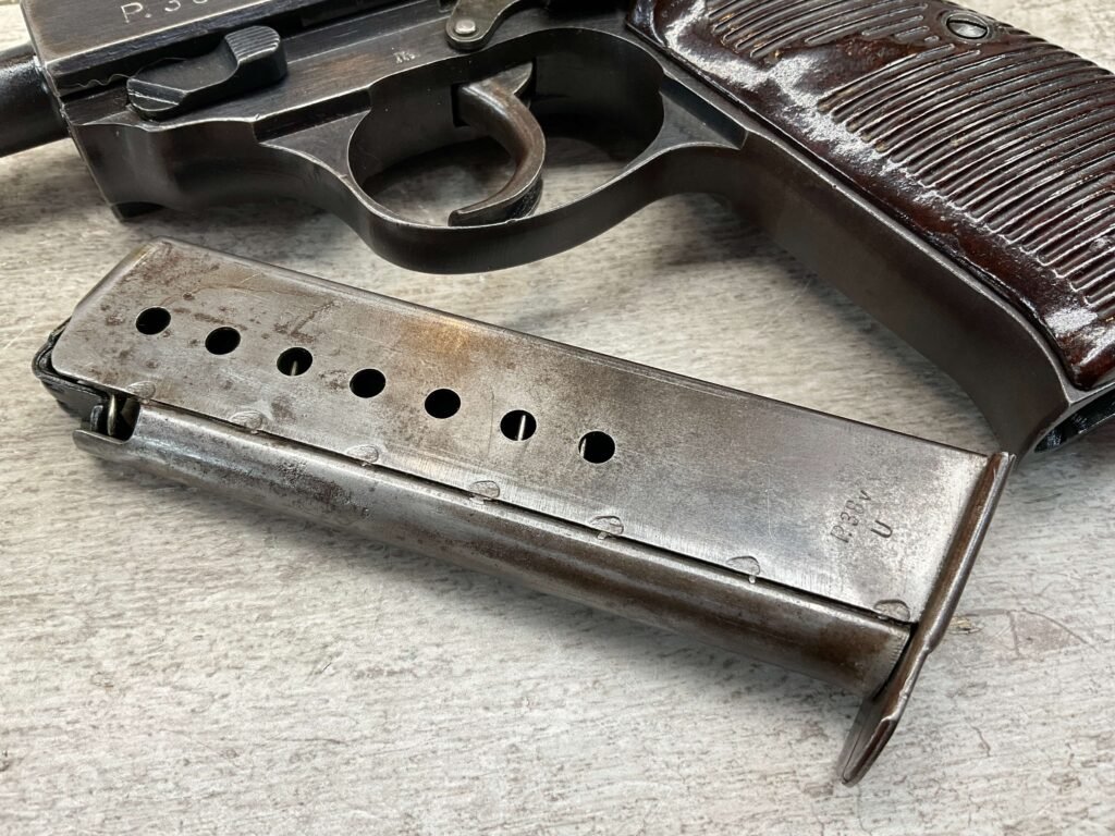 WALTHER P38 AC45 9MM SEMI AUTO PISTOL, NON MATCHING #6335c, #6712c SLIDE, 90%+ BLUE, 4 7/8″ BARREL, ORIGINAL RED BAKELITE GRIPS, “P.38v / U” STAMPED MAGAZINE, DULL MILITARY FINISH, GOOD BORE & RIFLING W/ LIGHT FROSTING IN AREAS, “359” INSPECTION STAMP ON LEFT SIDE OF FRAME ABOVE TRIGGER, EXCELLENT LATE WAR!