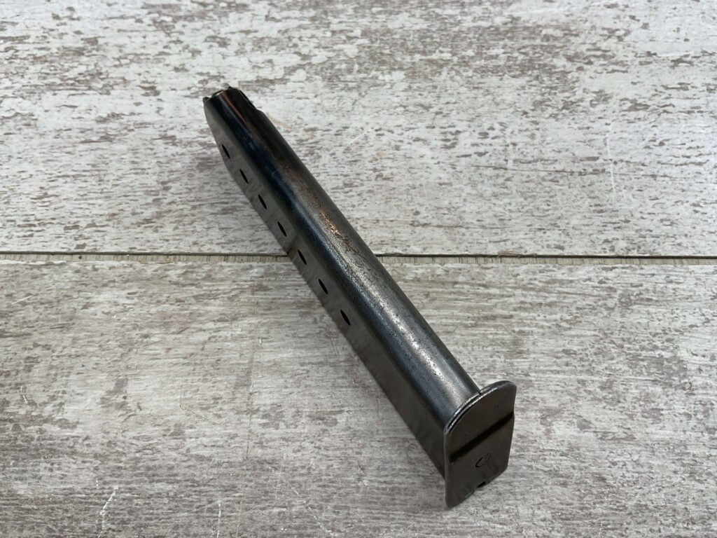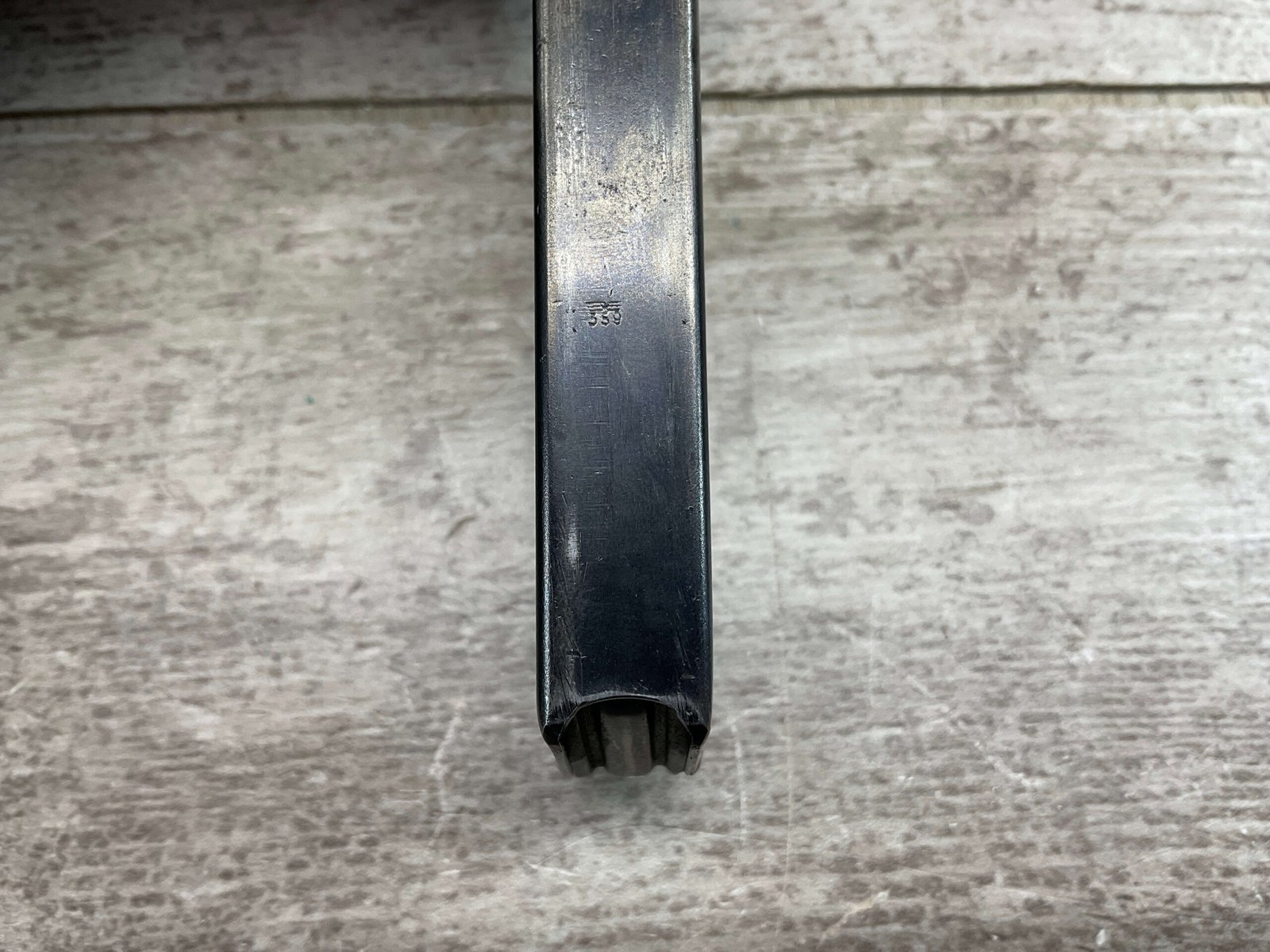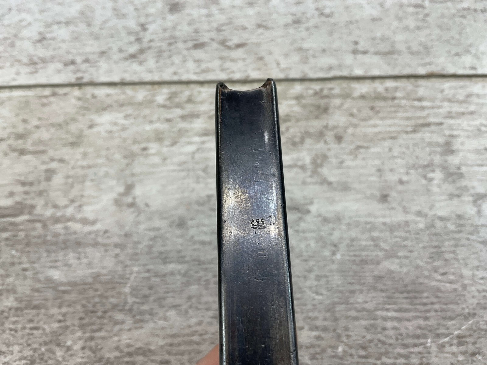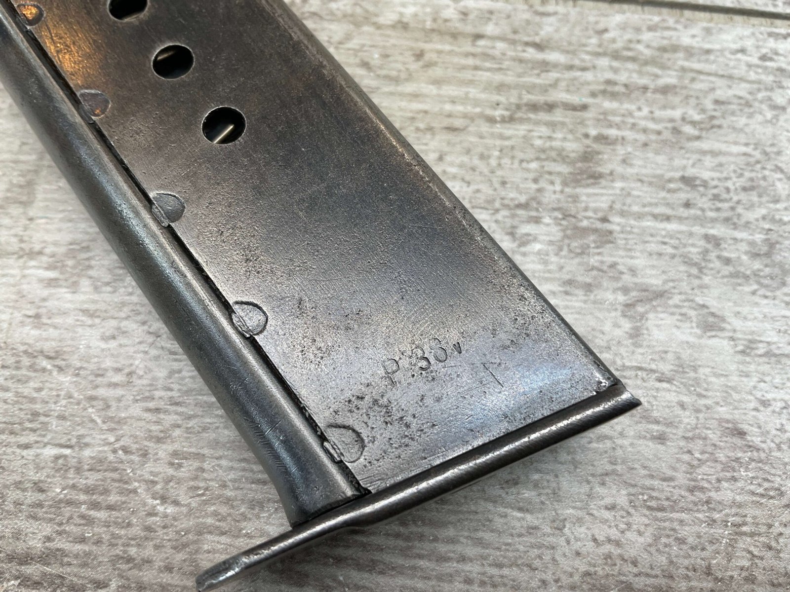 FACTORY ORIGINAL, WALTHER PRODUCED MAGAZINE FOR P38, RIGHT SIDE MARKING “P.38v”, LEFT SIDE MARKING, NONE. SPINE MARKING “E/359” , LITE WEAR, VG. CONDITION