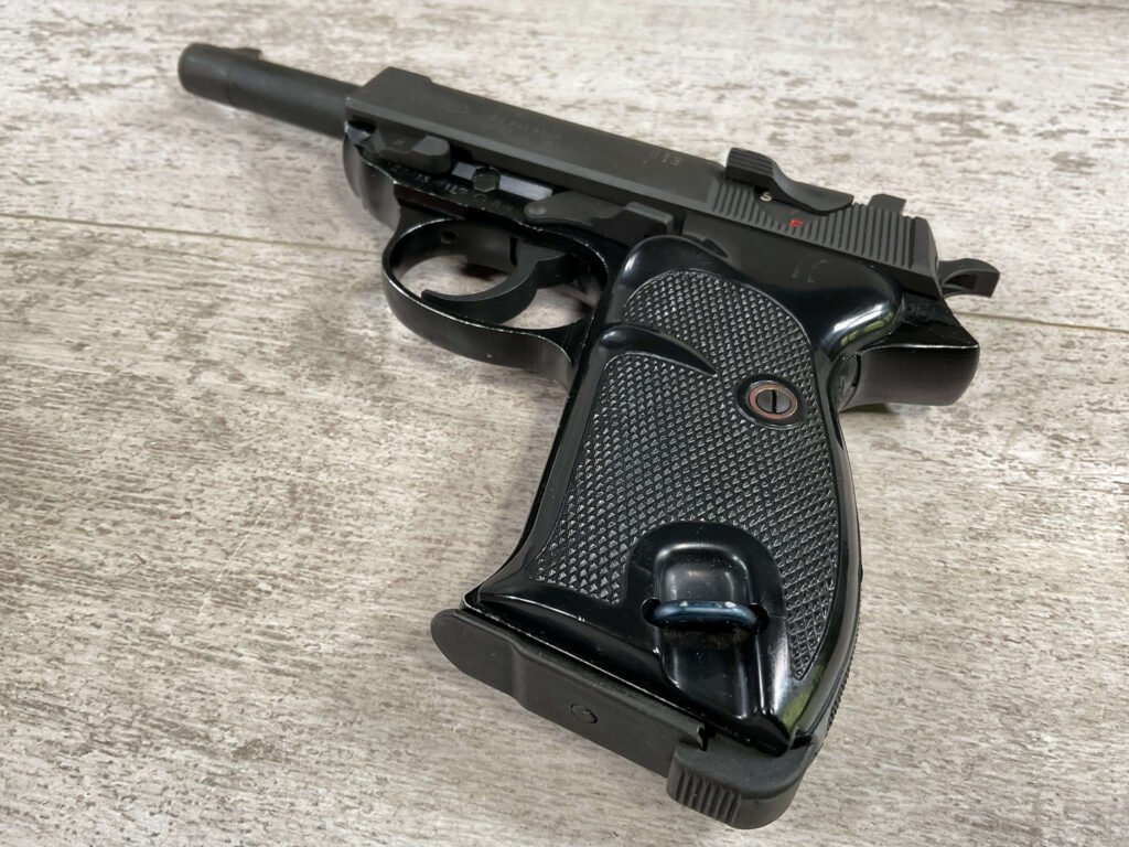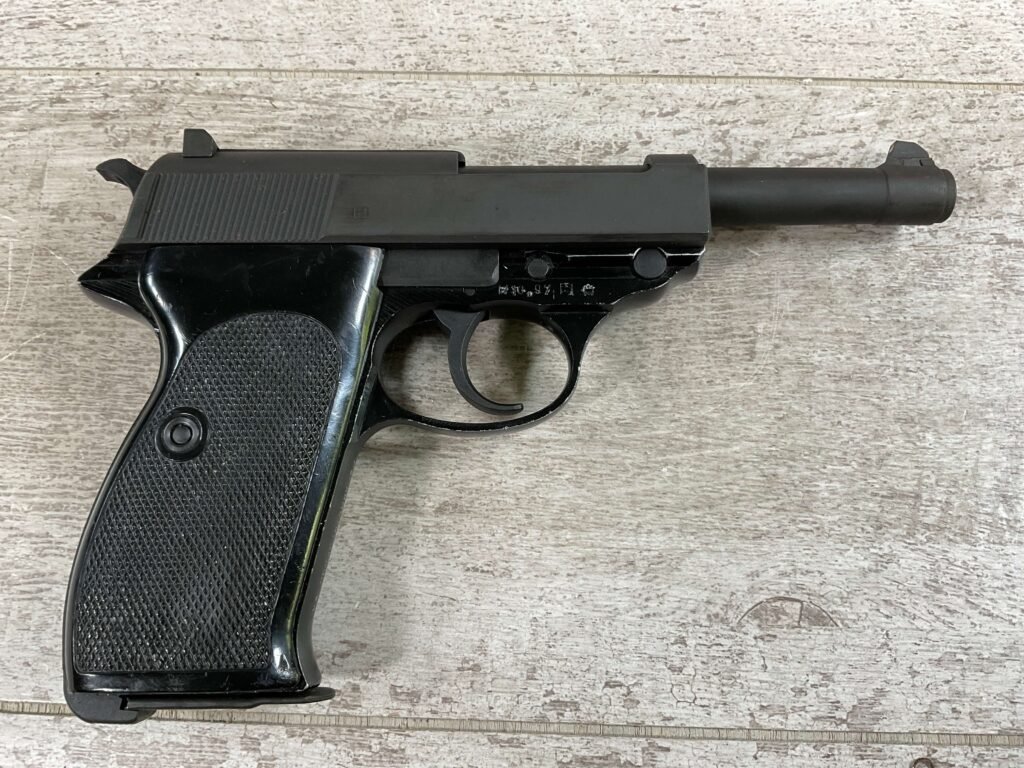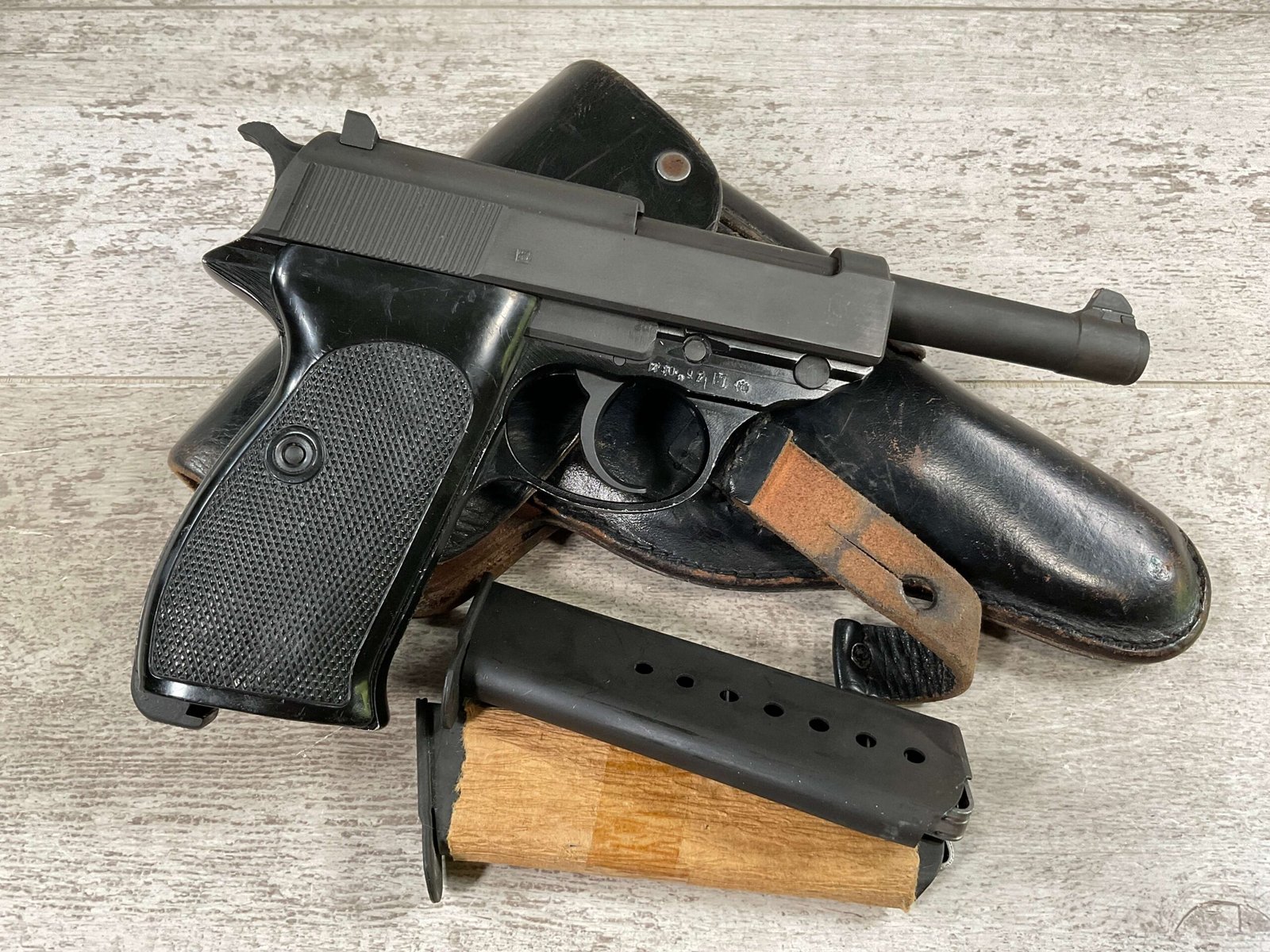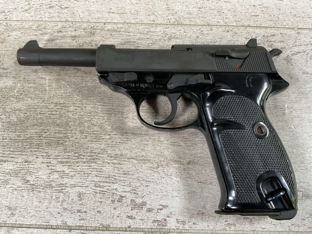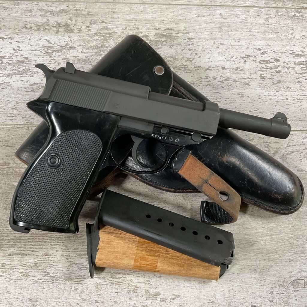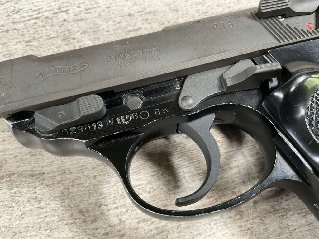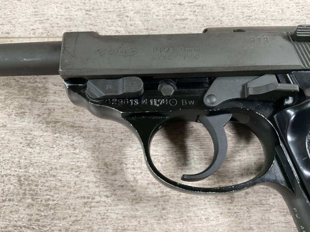 WALTHER P38 P1 9MM PISTOL RIG #029813, 9MM, 5″ BARREL, BLACK ALLOY FRAME W/MATTE SLIDE AND BARREL, PW ARMS IMPORT MARKS ON FRONT OF GRIP STRAP, MINTY BORE W/EXC RIFLING, EXC ORIGINAL PLASTIC CHECKERED GRIPS, MECHANICALLY EXCELLENT, BLACK GERMAN P1 LEATHER HOLSTER W/INTREGAL BELT LOOP, 2 MAGAZINES-ONE MARKED P38 “5/61” ON SPINE THE OTHER P38 “10/58” ON SPINE, ALL MATCHING, DECOCK WORKS, LEFT SIDE OF SLIDE MARKED “WALTHER BANNER P1 KAL. 9mm. OVER 6/82”, 98+% OVERALL