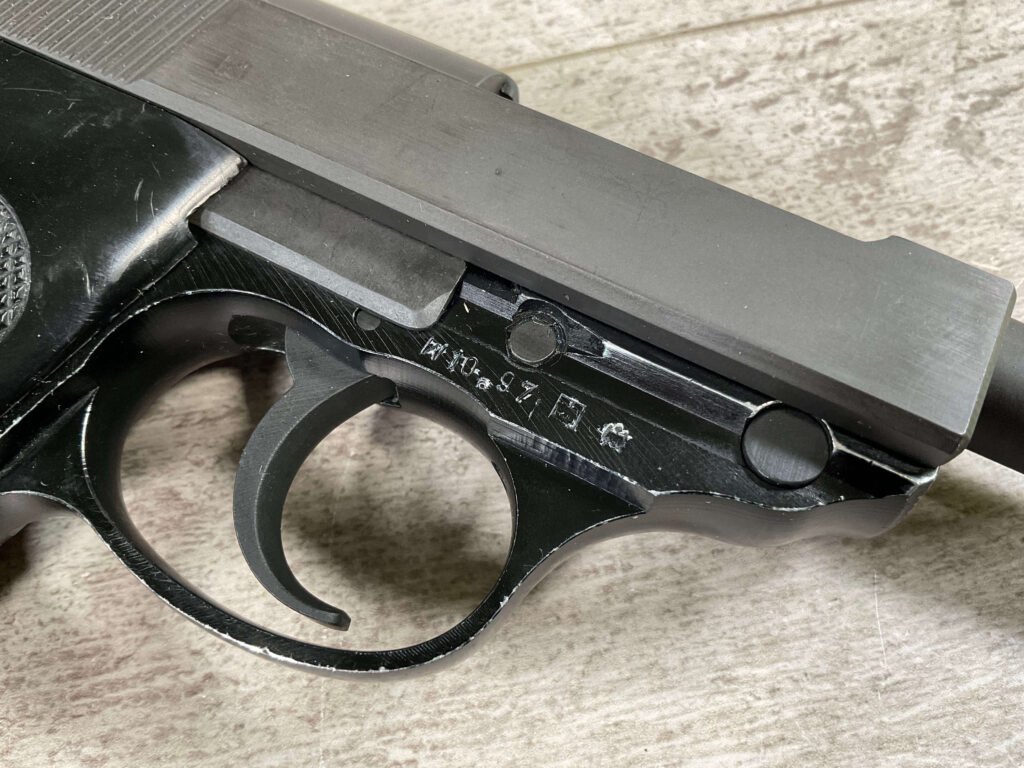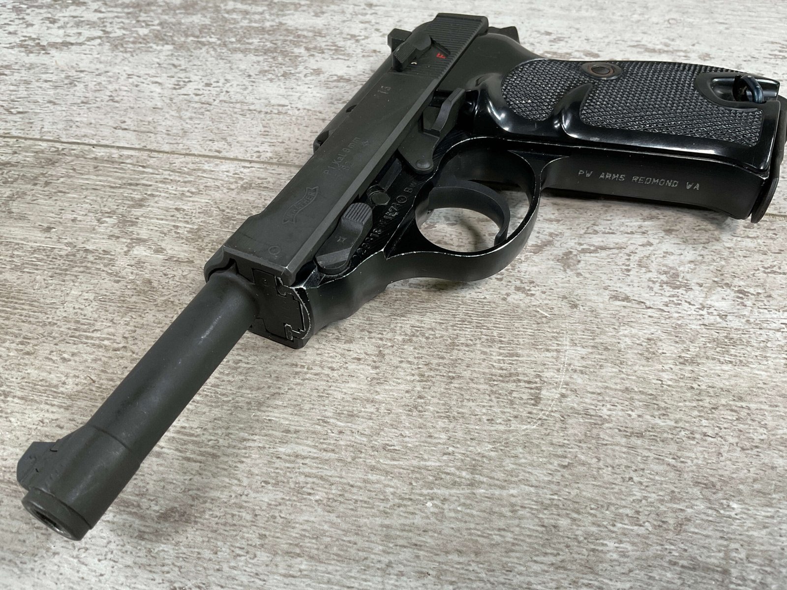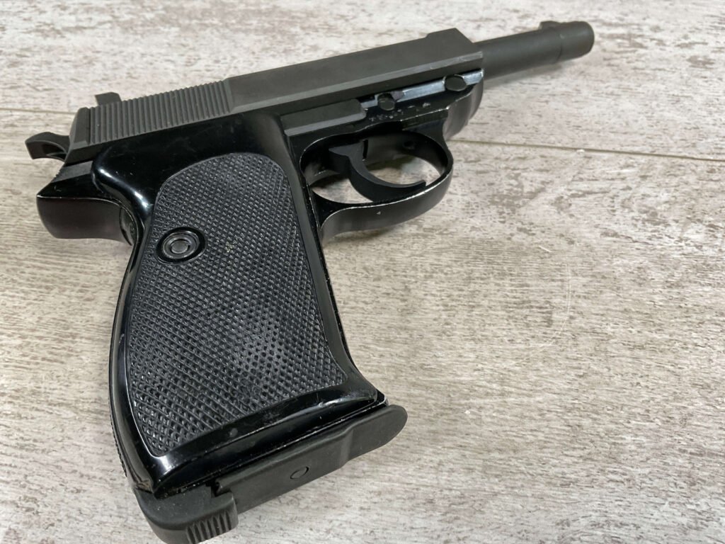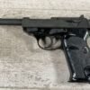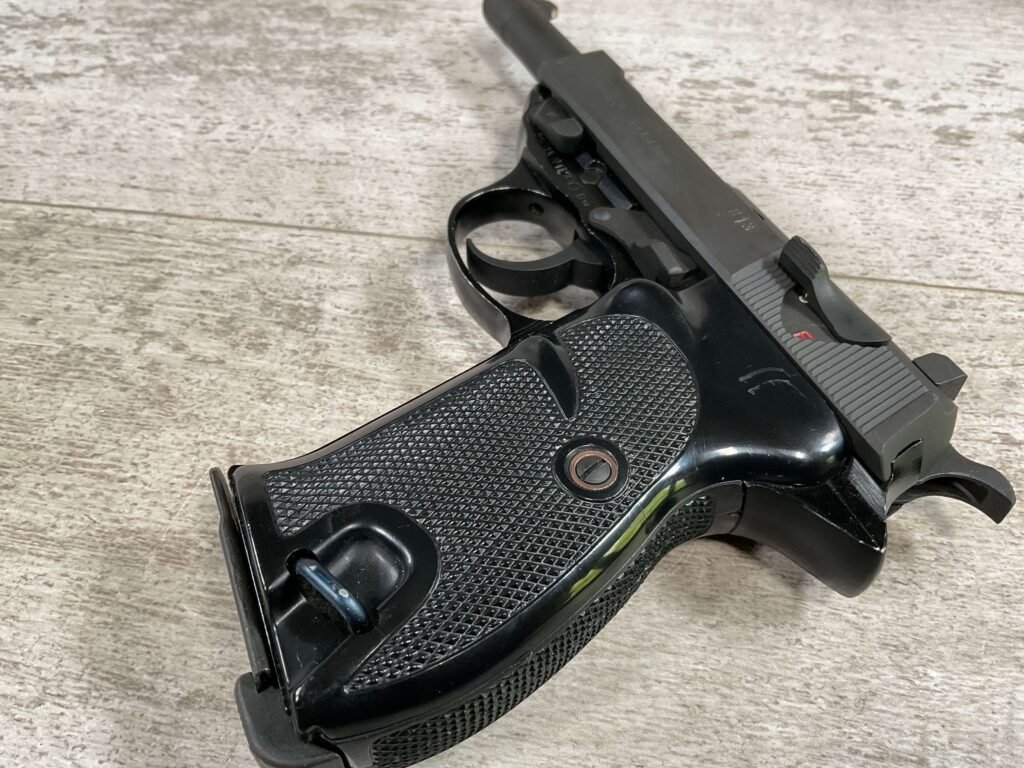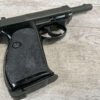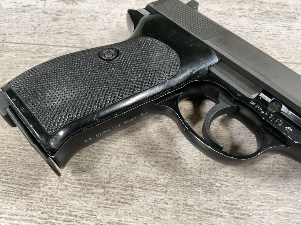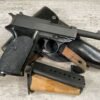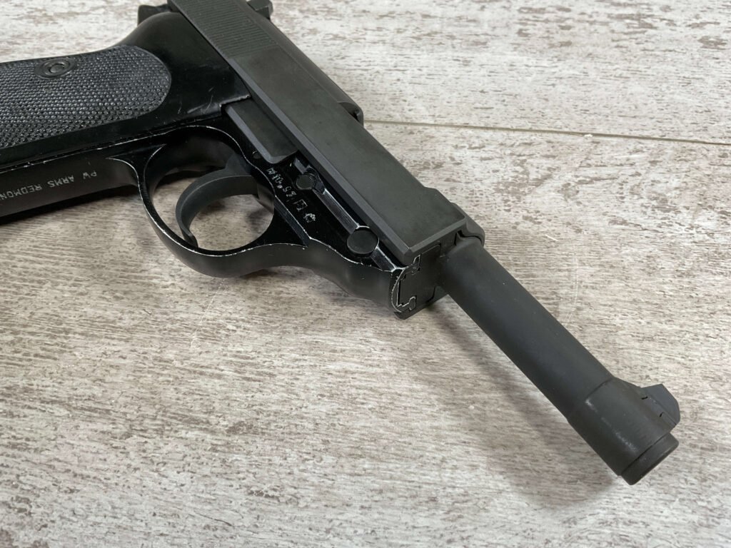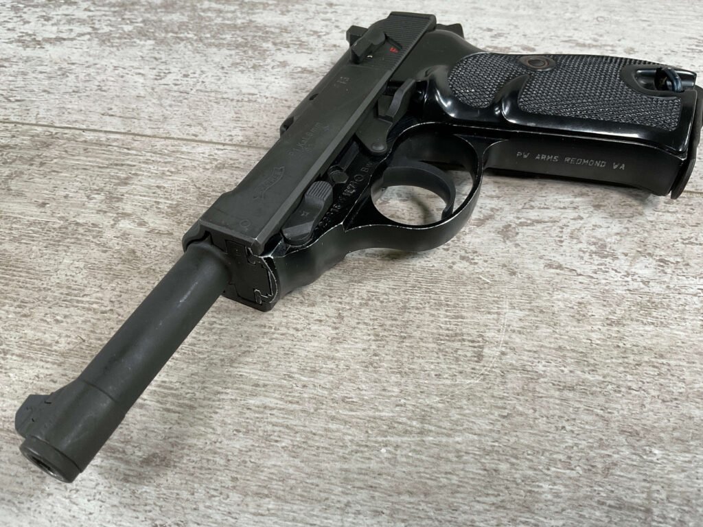 WALTHER P38 P1 9MM PISTOL RIG #029813, 9MM, 5″ BARREL, BLACK ALLOY FRAME W/MATTE SLIDE AND BARREL, PW ARMS IMPORT MARKS ON FRONT OF GRIP STRAP, MINTY BORE W/EXC RIFLING, EXC ORIGINAL PLASTIC CHECKERED GRIPS, MECHANICALLY EXCELLENT, BLACK GERMAN P1 LEATHER HOLSTER W/INTREGAL BELT LOOP, 2 MAGAZINES-ONE MARKED P38 “5/61” ON SPINE THE OTHER P38 “10/58” ON SPINE, ALL MATCHING, DECOCK WORKS, LEFT SIDE OF SLIDE MARKED “WALTHER BANNER P1 KAL. 9mm. OVER 6/82”, 98+% OVERALL