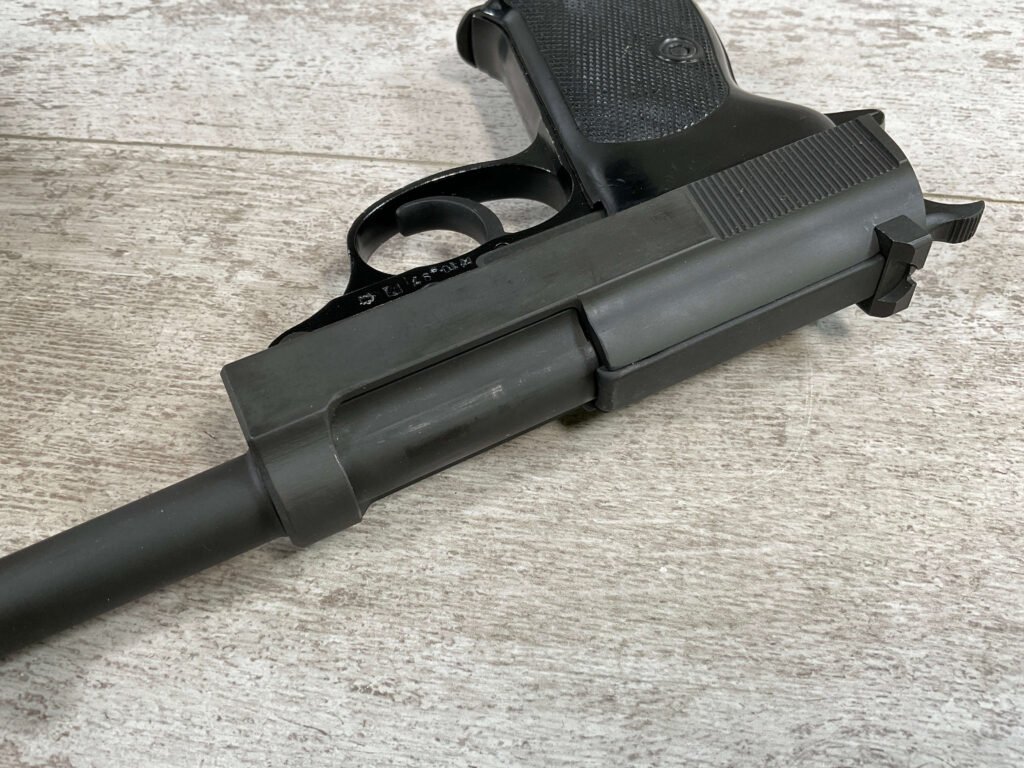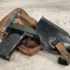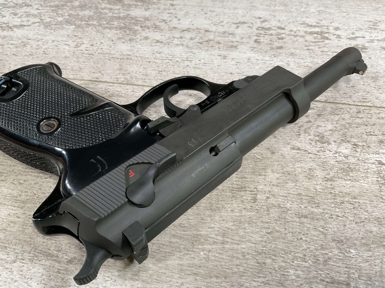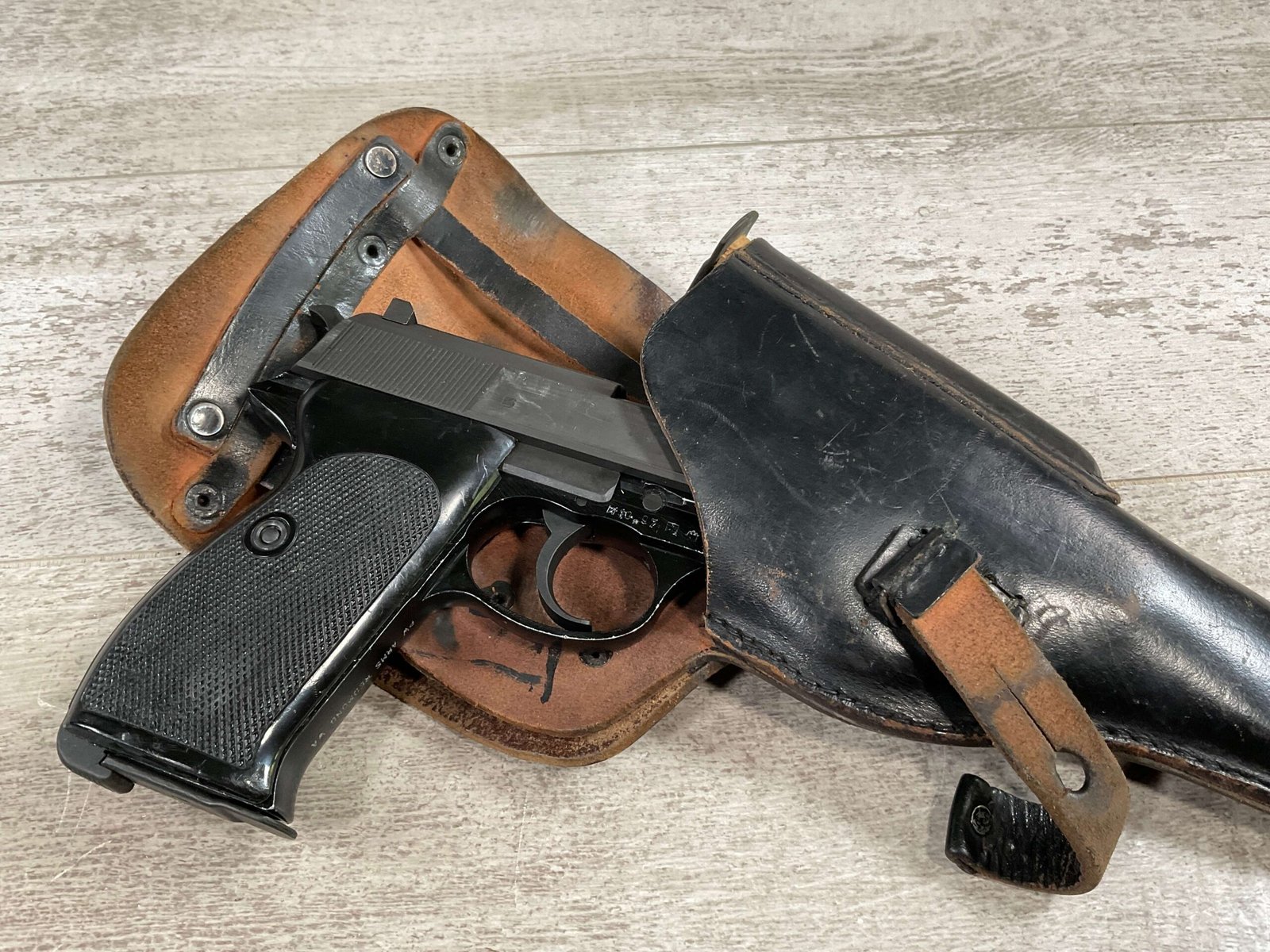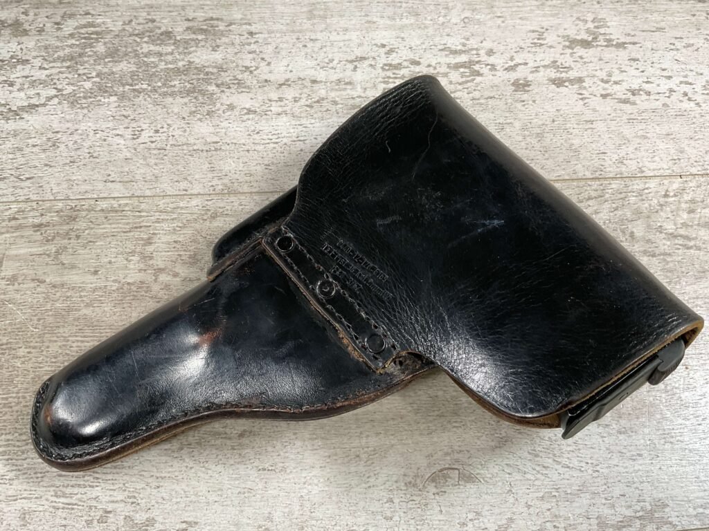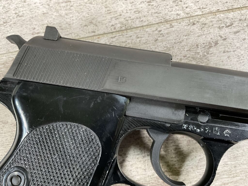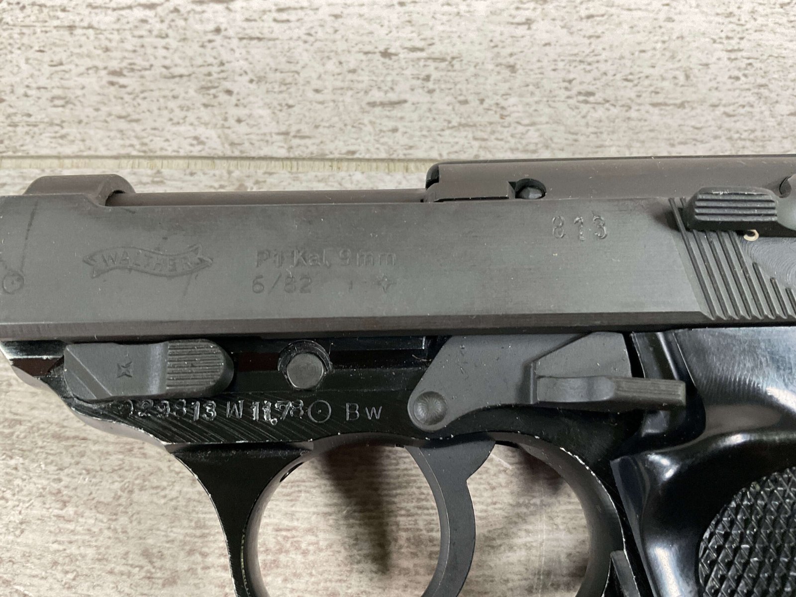 WALTHER P38 P1 9MM PISTOL RIG #029813, 9MM, 5″ BARREL, BLACK ALLOY FRAME W/MATTE SLIDE AND BARREL, PW ARMS IMPORT MARKS ON FRONT OF GRIP STRAP, MINTY BORE W/EXC RIFLING, EXC ORIGINAL PLASTIC CHECKERED GRIPS, MECHANICALLY EXCELLENT, BLACK GERMAN P1 LEATHER HOLSTER W/INTREGAL BELT LOOP, 2 MAGAZINES-ONE MARKED P38 “5/61” ON SPINE THE OTHER P38 “10/58” ON SPINE, ALL MATCHING, DECOCK WORKS, LEFT SIDE OF SLIDE MARKED “WALTHER BANNER P1 KAL. 9mm. OVER 6/82”, 98+% OVERALL