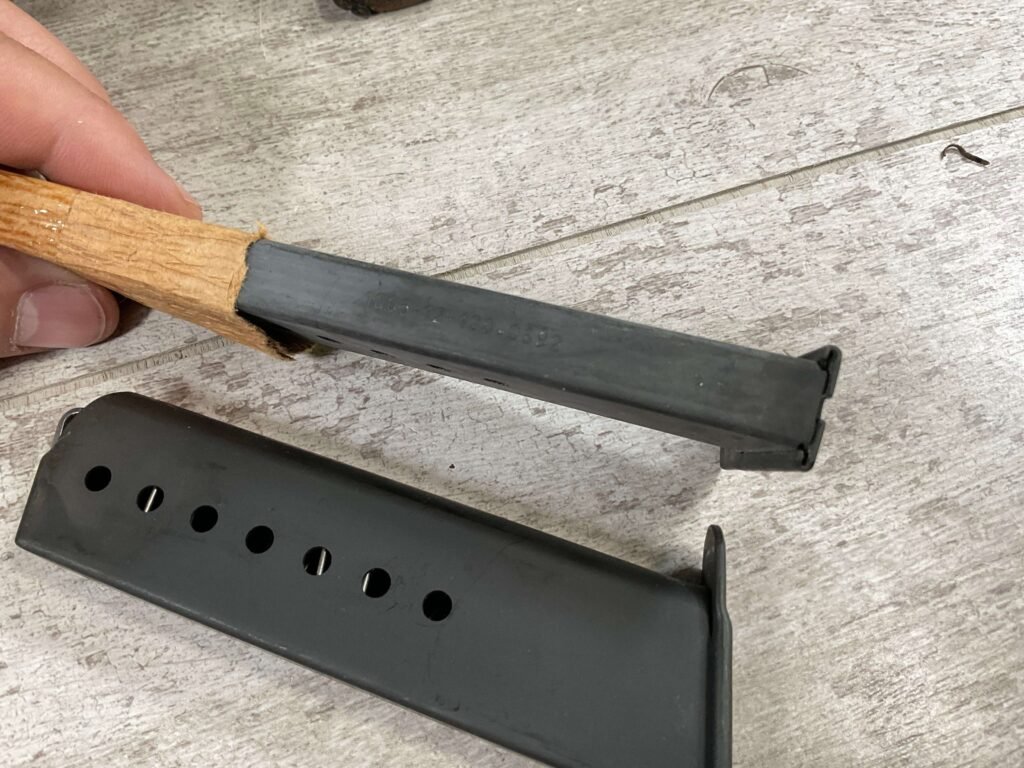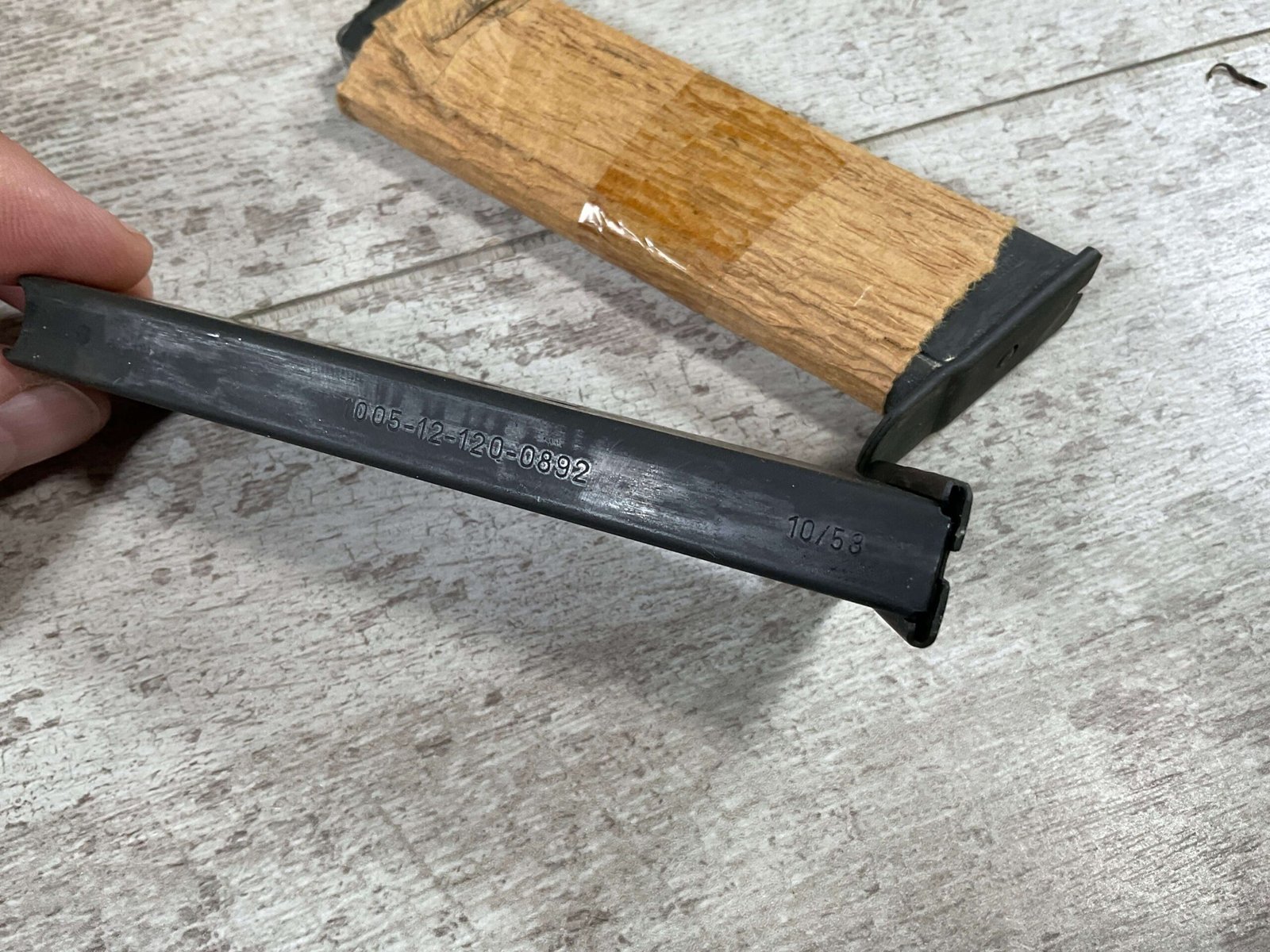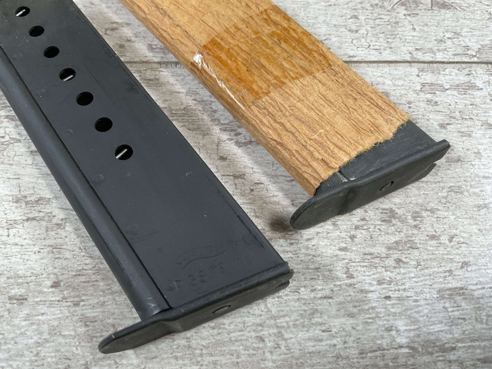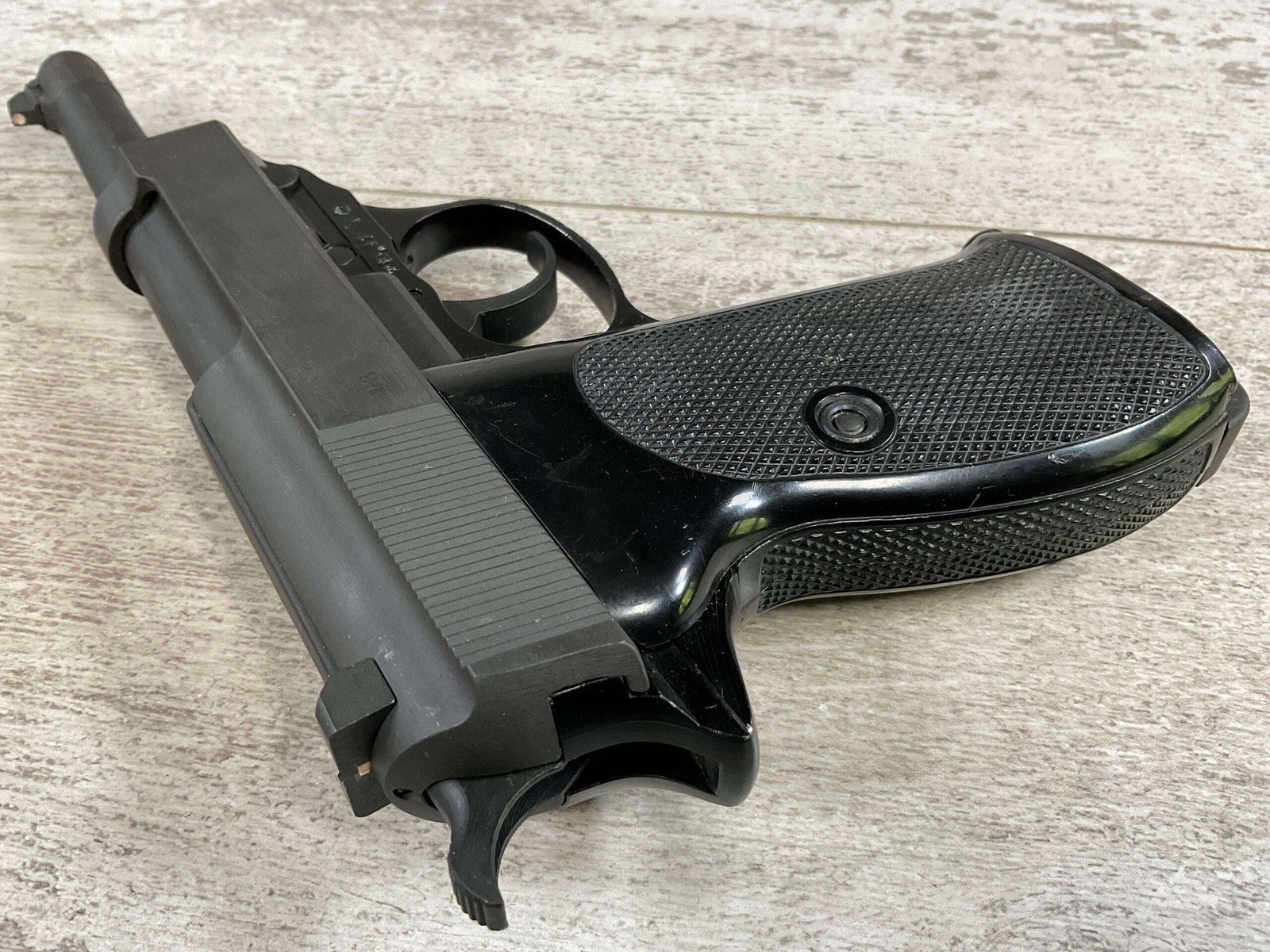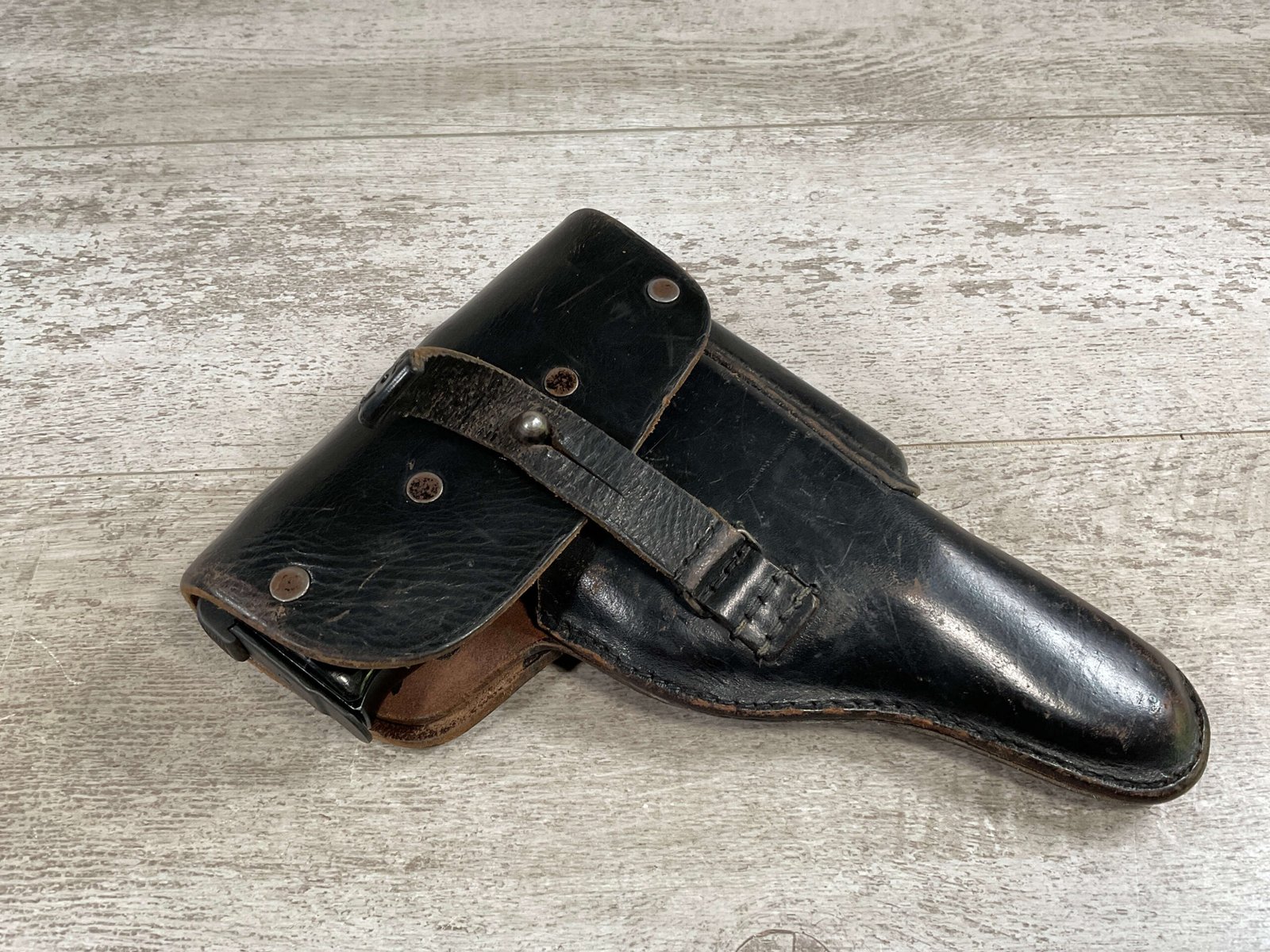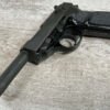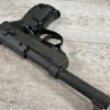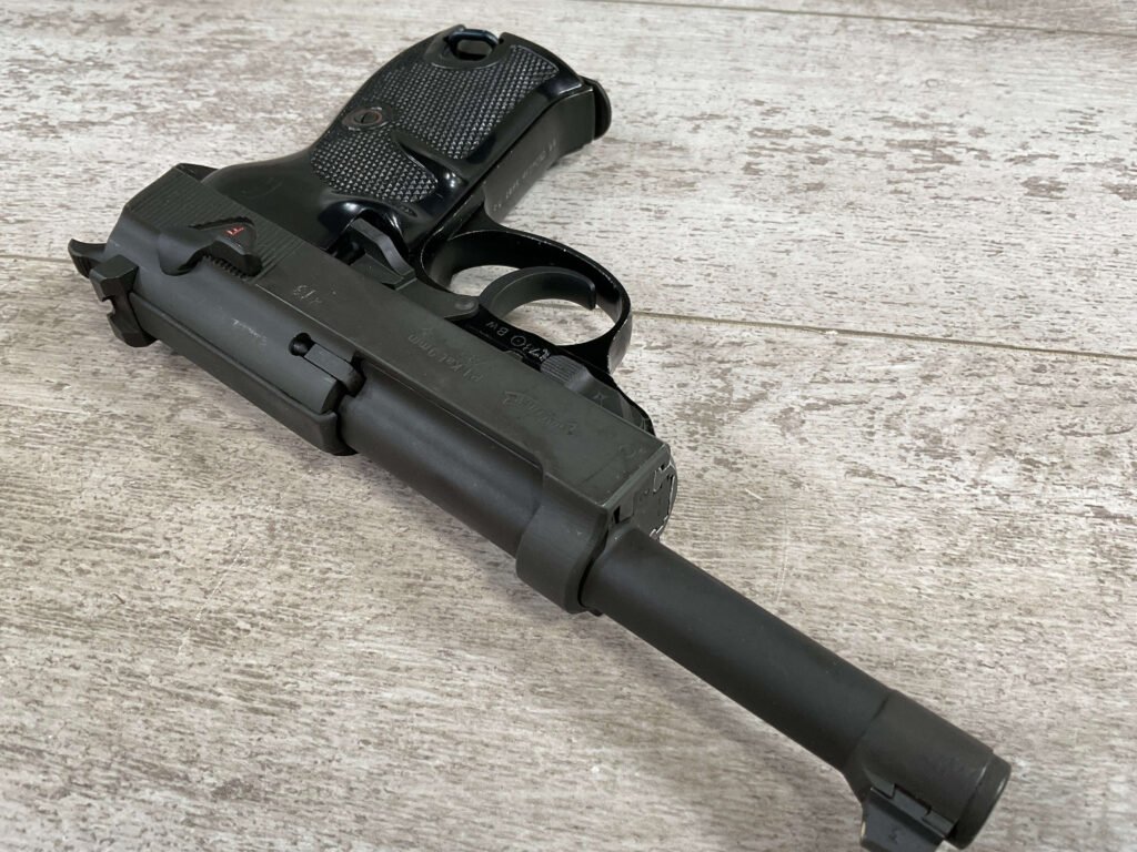 WALTHER P38 P1 9MM PISTOL RIG #029813, 9MM, 5″ BARREL, BLACK ALLOY FRAME W/MATTE SLIDE AND BARREL, PW ARMS IMPORT MARKS ON FRONT OF GRIP STRAP, MINTY BORE W/EXC RIFLING, EXC ORIGINAL PLASTIC CHECKERED GRIPS, MECHANICALLY EXCELLENT, BLACK GERMAN P1 LEATHER HOLSTER W/INTREGAL BELT LOOP, 2 MAGAZINES-ONE MARKED P38 “5/61” ON SPINE THE OTHER P38 “10/58” ON SPINE, ALL MATCHING, DECOCK WORKS, LEFT SIDE OF SLIDE MARKED “WALTHER BANNER P1 KAL. 9mm. OVER 6/82”, 98+% OVERALL