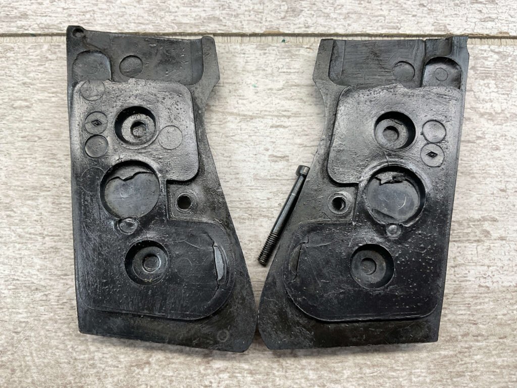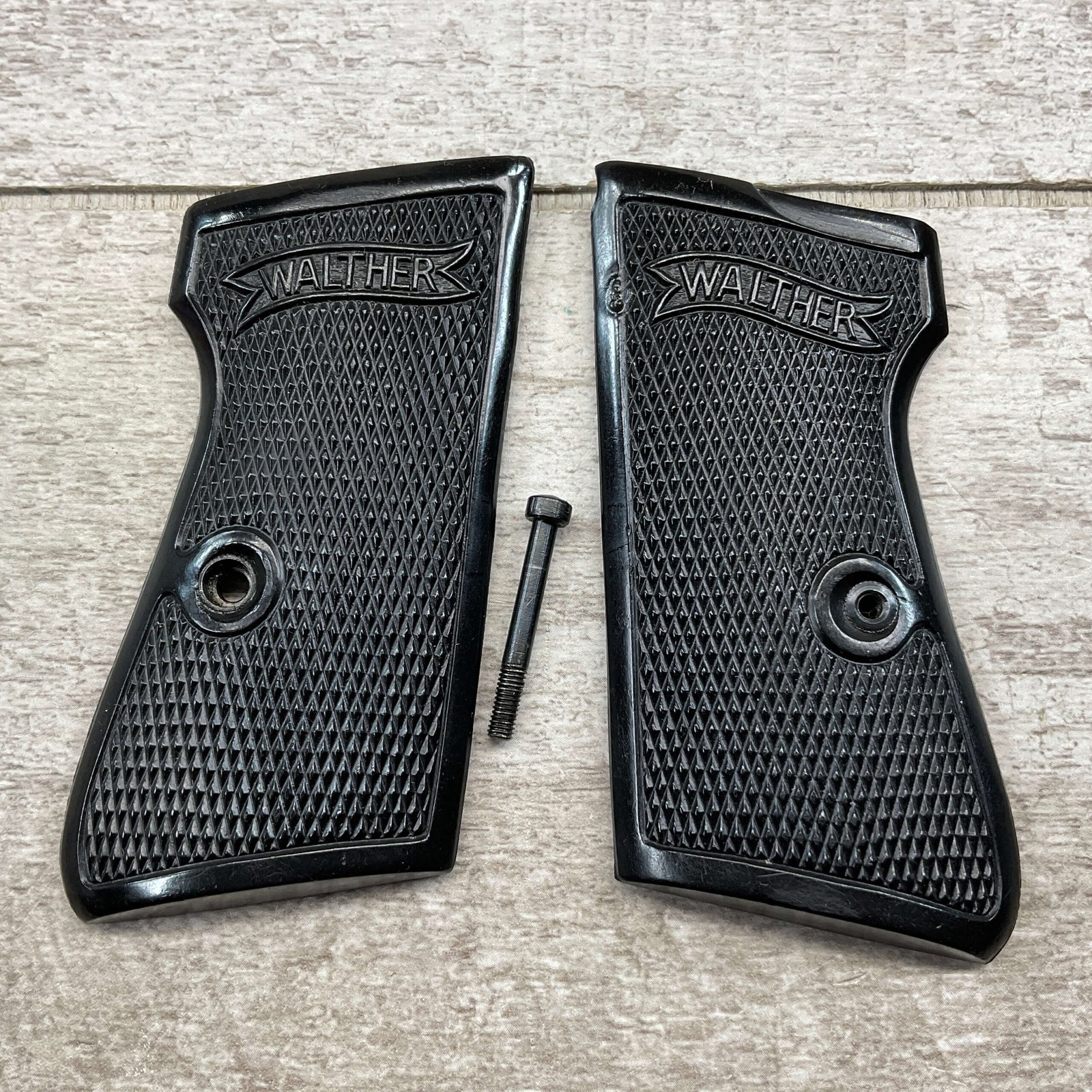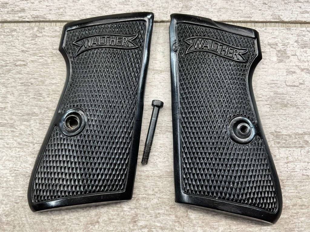 WALTHER PP BLACK PLASTIC GRIPS, INCLUDES SCREW, HARD TO FIND, EXC COND W/NO CRACKS