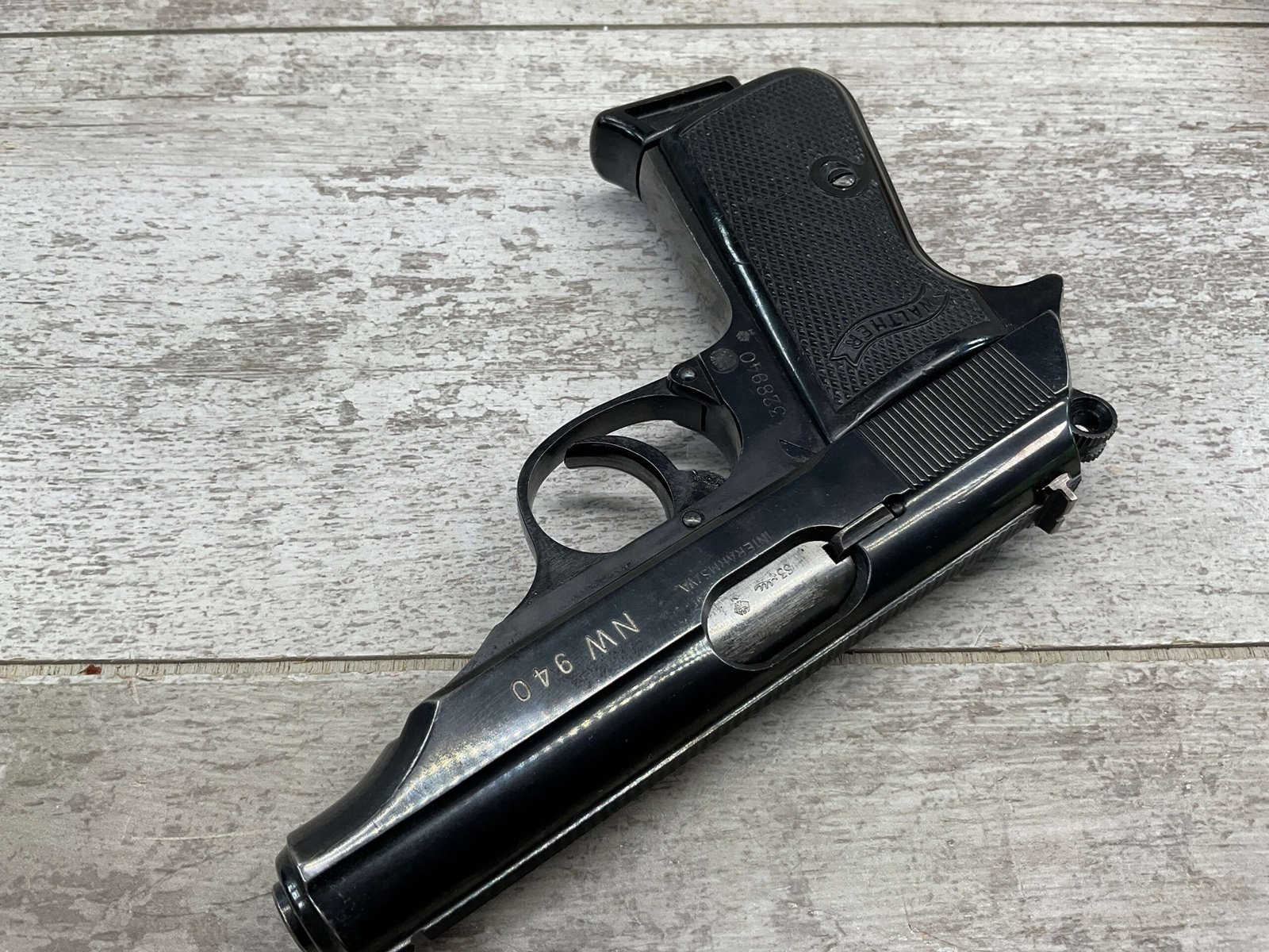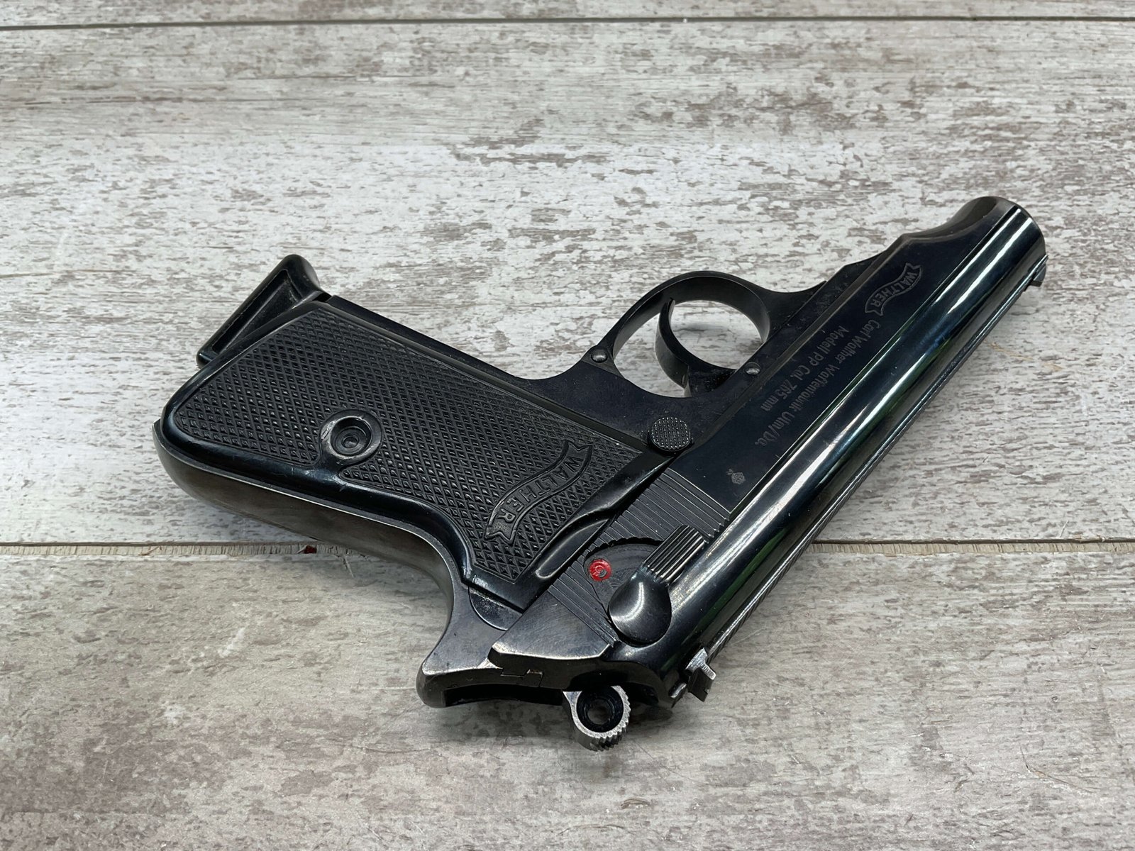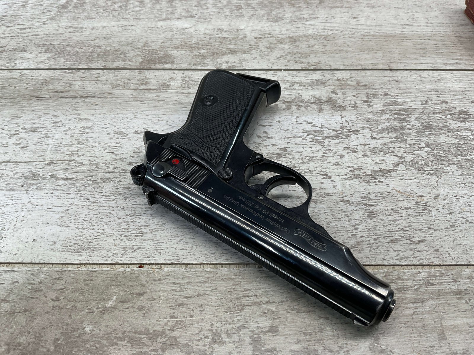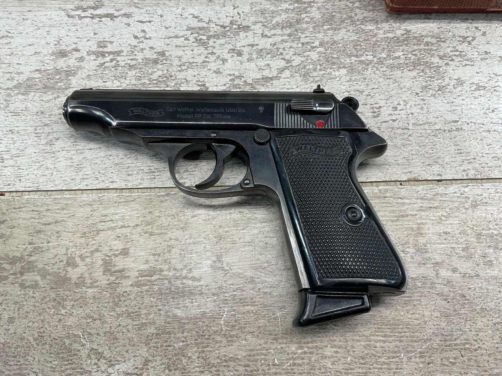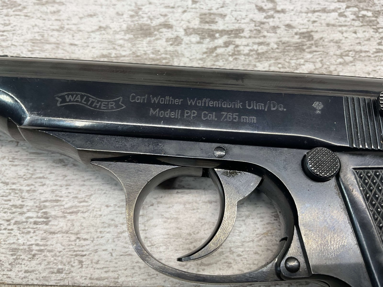 - Slide: Marked with “Walther” banner, “Carl Walther Waffenfabrik Ulm/Do. Modell PP Cal. 7.65mm” on the left side.