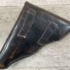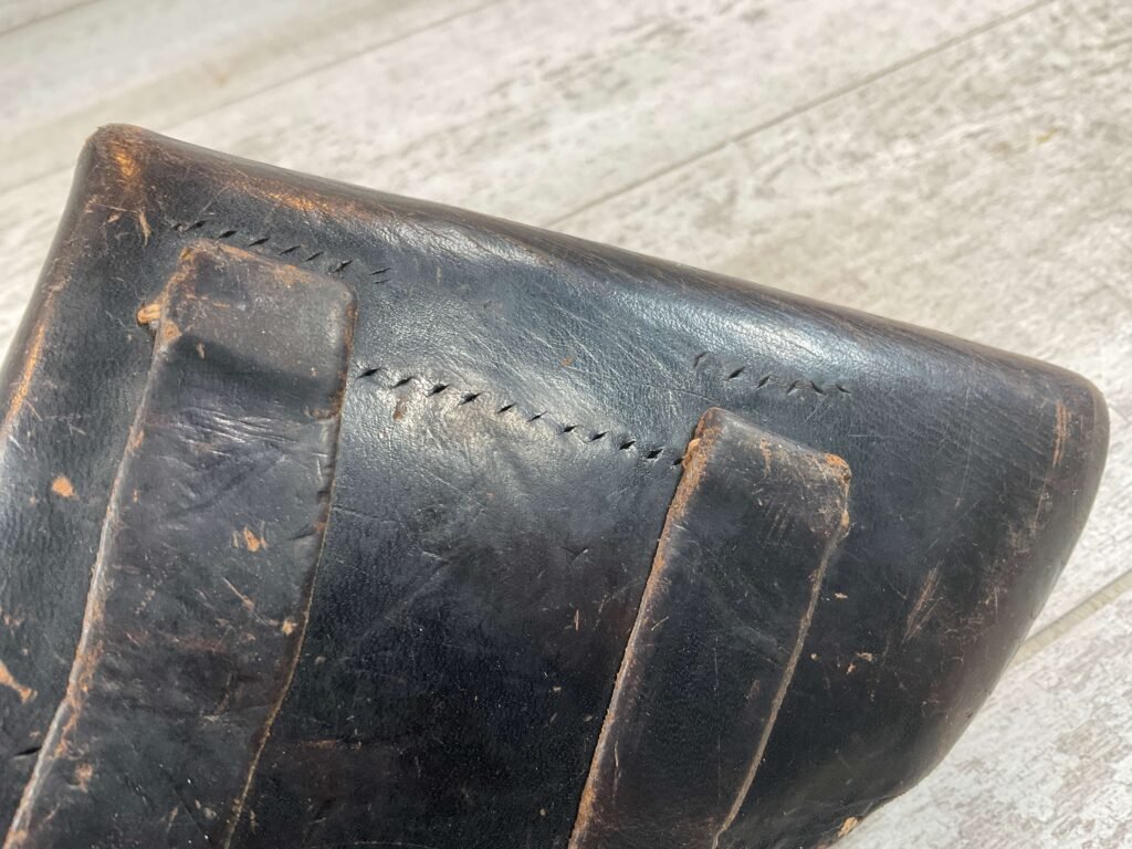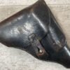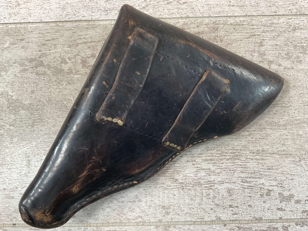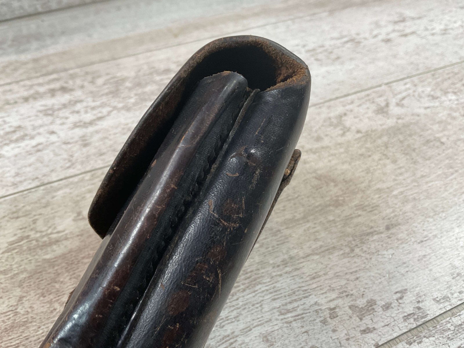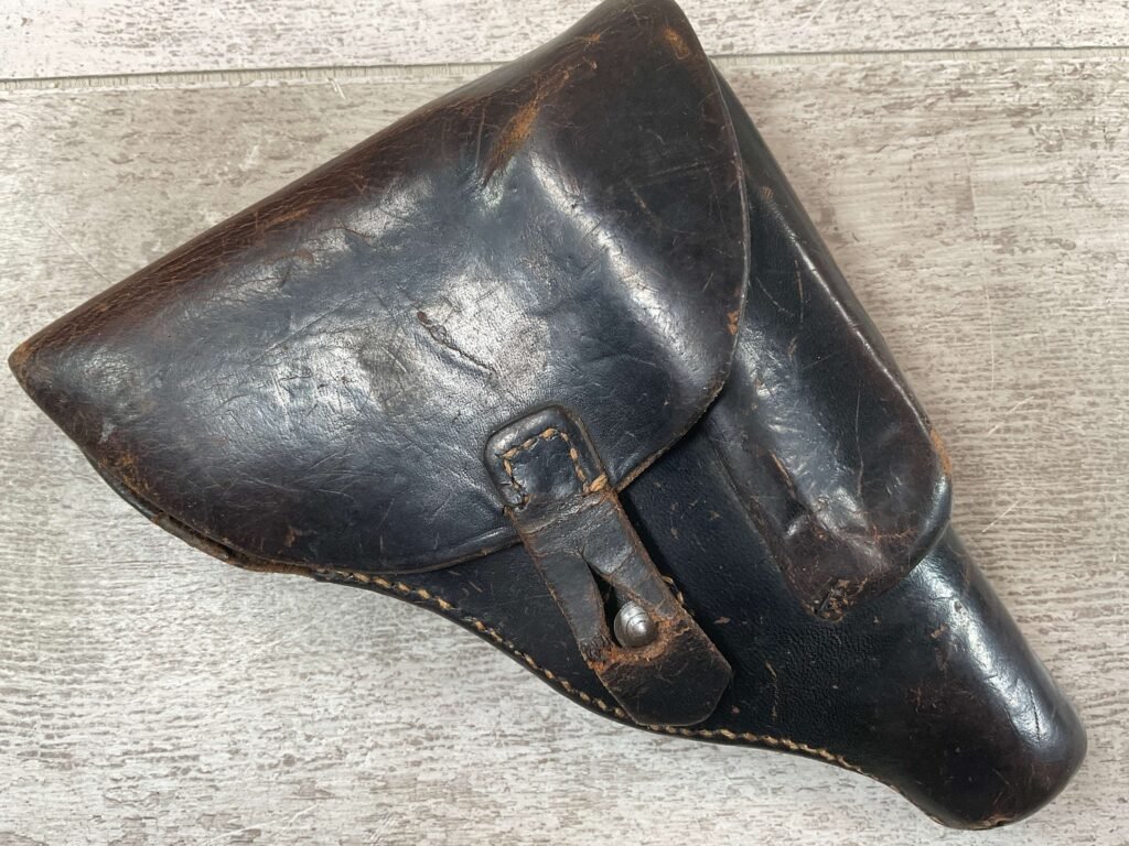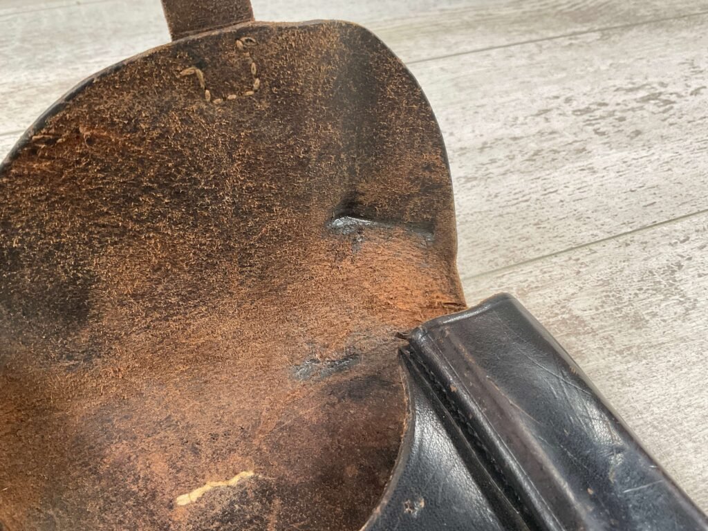 SKU#509 WALTHER PP WWII BLACK UNMARKED VG HOLSTER, WHITE STITCHING, PERIOD BELT LOOP REPAIR, WORN CLOSURE TAB, STEEL CLOSURE STUD