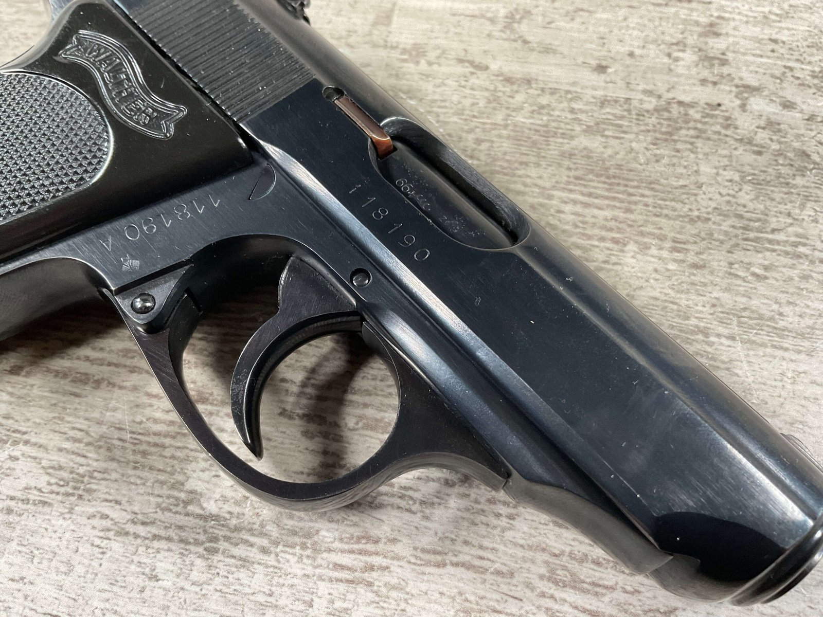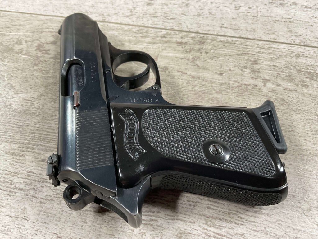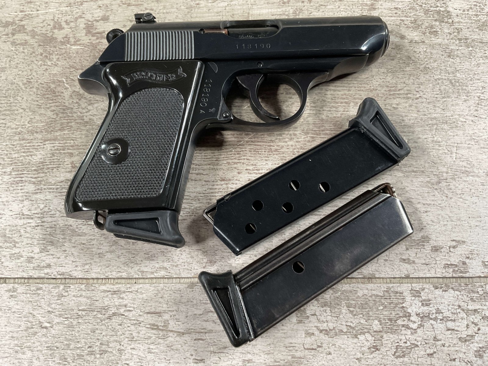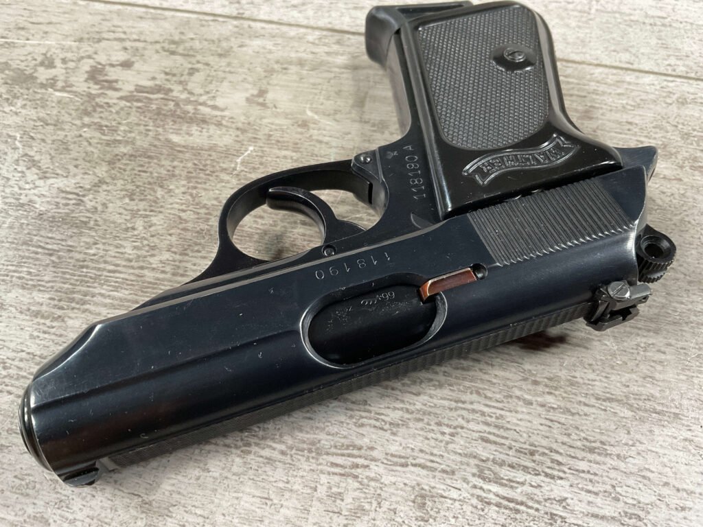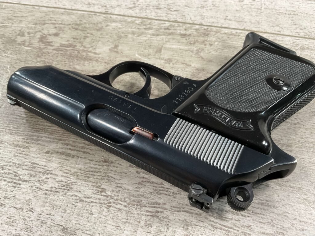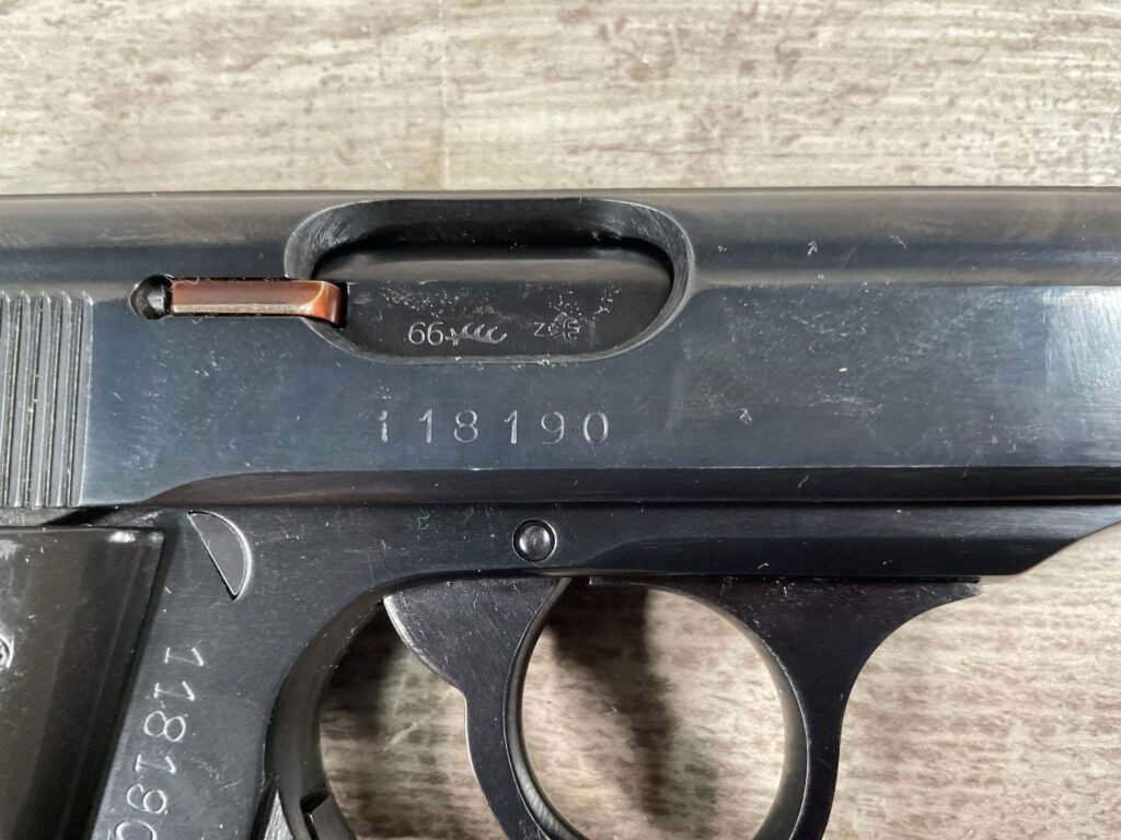 WALTHER PPK BLANK SLIDE MADE IN WEST GERMANY MARKED .380ACP (9mm KURZ) PISTOL #118190A, 3 3/8″ BBL, EXC MINTY BORE & RIFLING (10/10), VG BLACK PLASTIC WALTHER GRIPS, LEFT SIDE OF SLIDE IS BLANK, RIGH SIDE OF SLIDE HAS SERIAL NUMBER, MATCHING, HORNS 66 ON BARREL (1966), LEFT SIDE OF SLIDE HAS AREAS OF PITTING, TWO SMALL AREAS OF FINISH LOSS BETWEEN TRIGGER AND GRIPS, 3 PLASTIC FINGER EXTENSION MAGAZINES INCLUDE (NO MARKINGS) AND EXCELLENT CONDITION, NO IMPORT MARKS, FIXED FRONT SIGHT, MMC ADJUSTABLE REAR SIGHT, ORIGINAL BLUE, RARE BLANK SLIDE, EALGE/N PROOF MARKED BARREL AND FRAME NEAR SERIAL #, 90% OVERALL