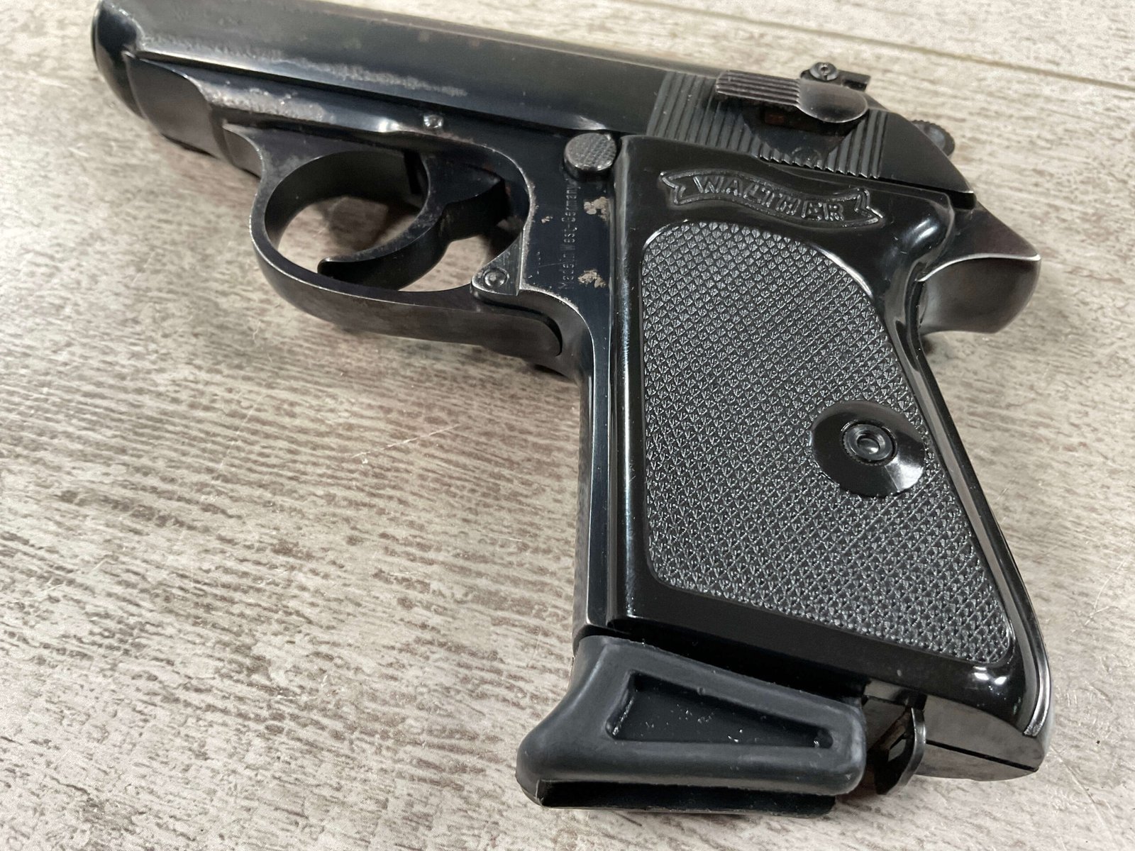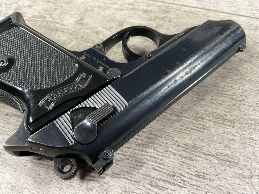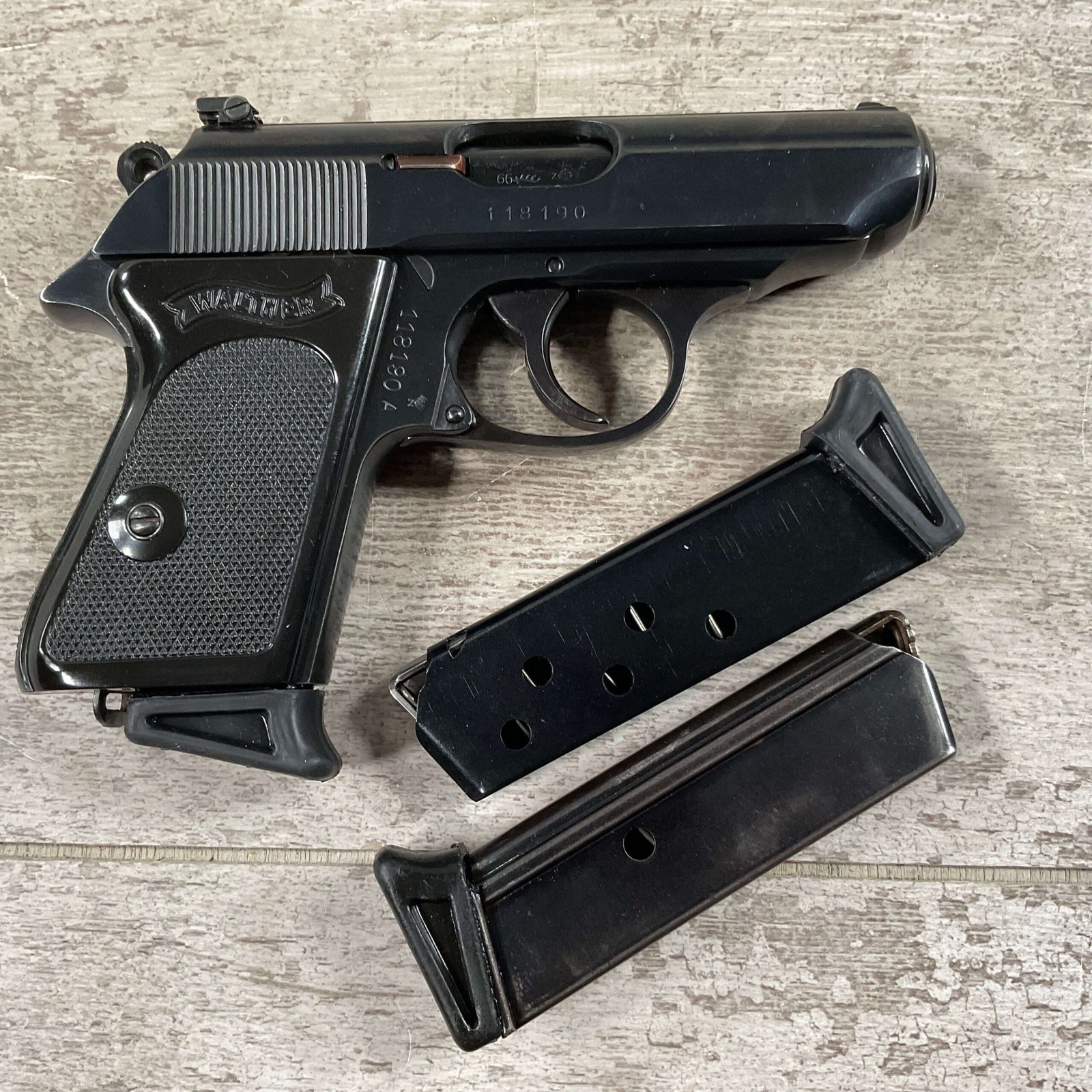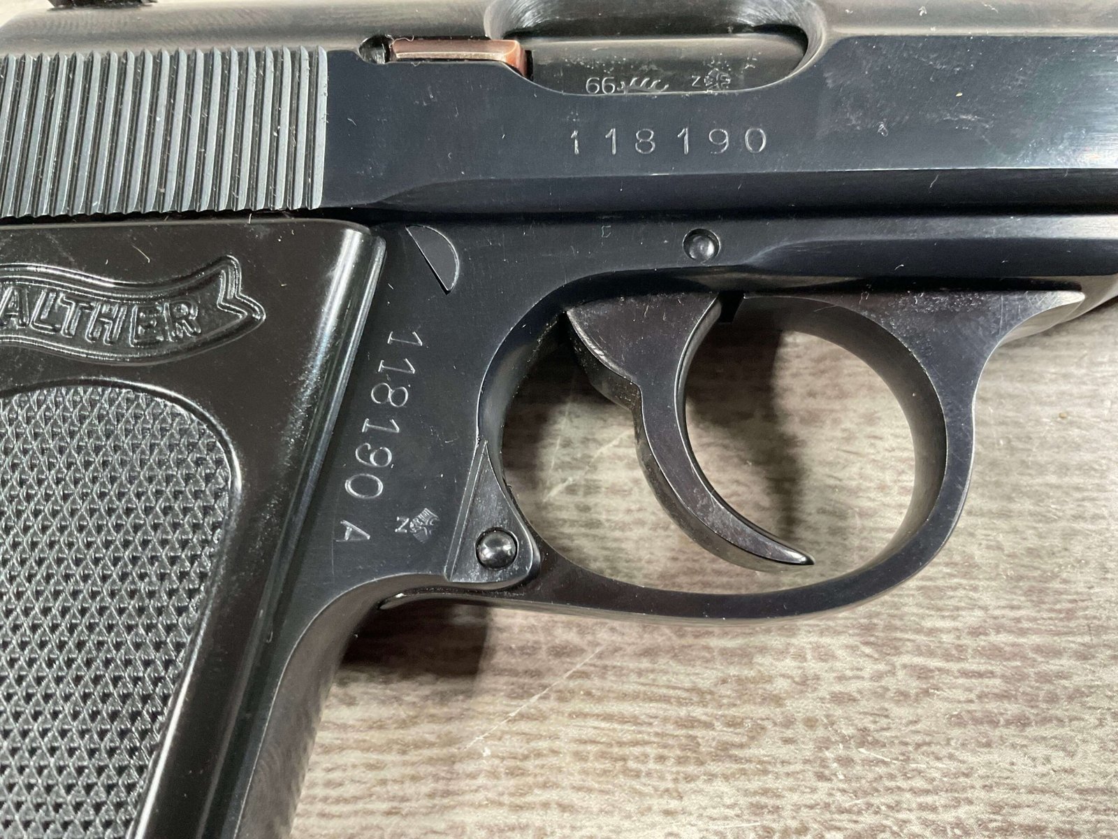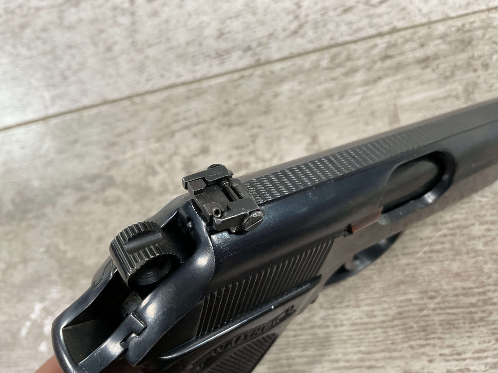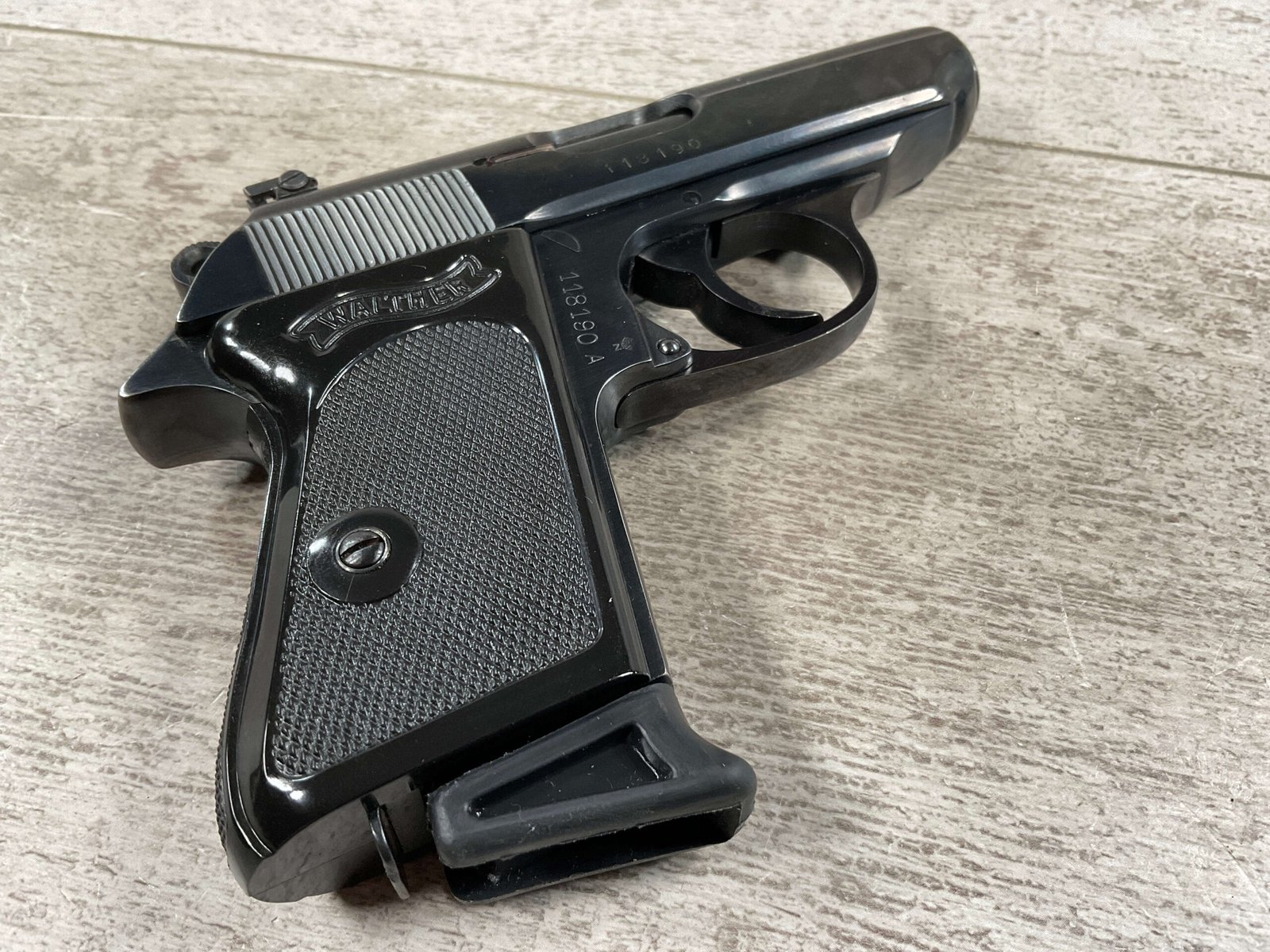 WALTHER PPK BLANK SLIDE MADE IN WEST GERMANY MARKED .380ACP (9mm KURZ) PISTOL #118190A, 3 3/8″ BBL, EXC MINTY BORE & RIFLING (10/10), VG BLACK PLASTIC WALTHER GRIPS, LEFT SIDE OF SLIDE IS BLANK, RIGH SIDE OF SLIDE HAS SERIAL NUMBER, MATCHING, HORNS 66 ON BARREL (1966), LEFT SIDE OF SLIDE HAS AREAS OF PITTING, TWO SMALL AREAS OF FINISH LOSS BETWEEN TRIGGER AND GRIPS, 3 PLASTIC FINGER EXTENSION MAGAZINES INCLUDE (NO MARKINGS) AND EXCELLENT CONDITION, NO IMPORT MARKS, FIXED FRONT SIGHT, MMC ADJUSTABLE REAR SIGHT, ORIGINAL BLUE, RARE BLANK SLIDE, EALGE/N PROOF MARKED BARREL AND FRAME NEAR SERIAL #, 90% OVERALL
