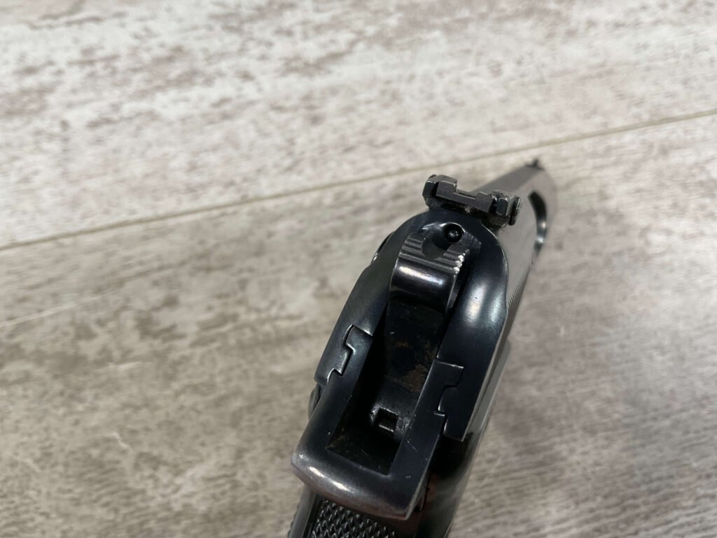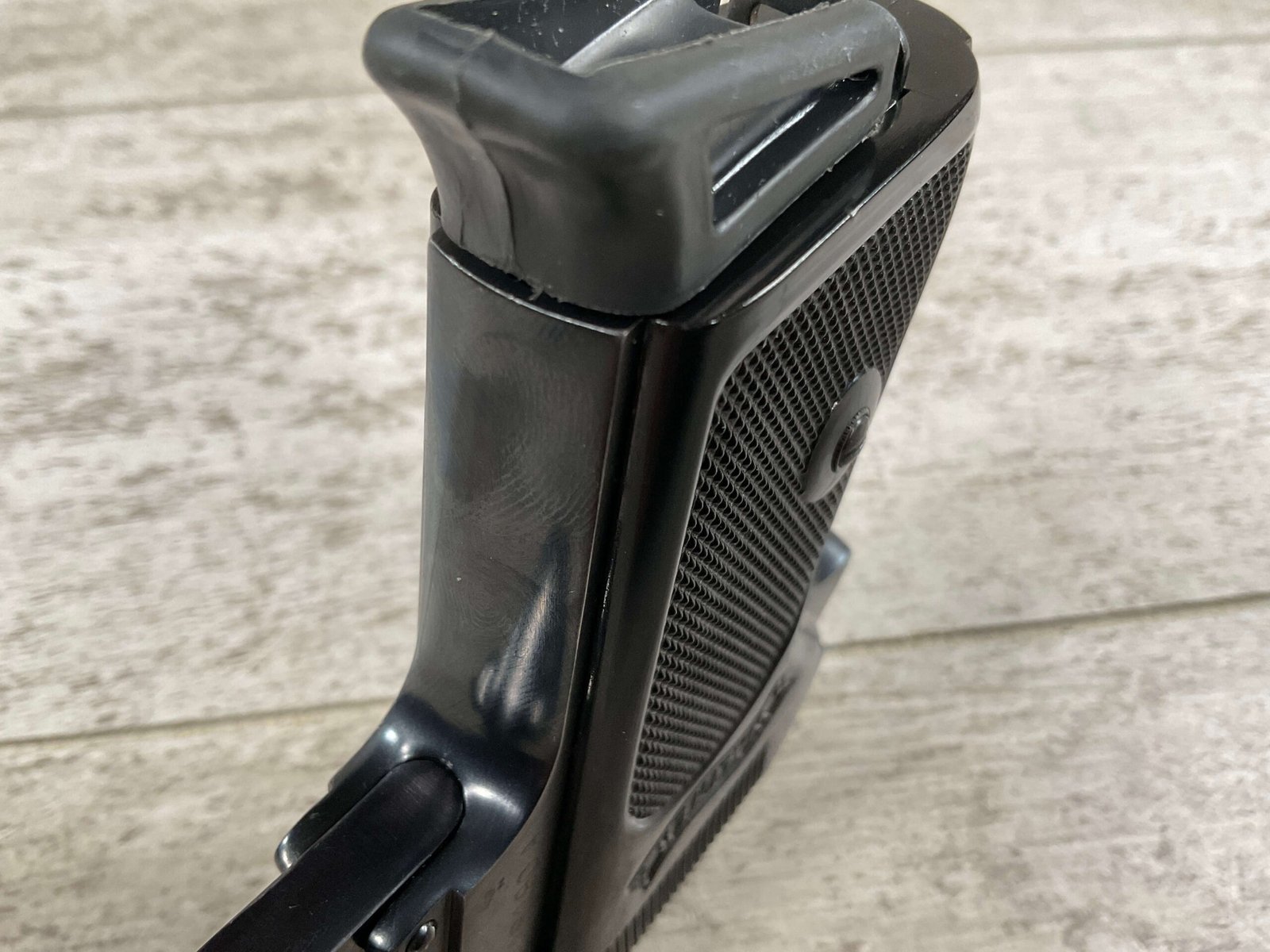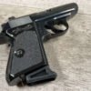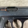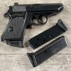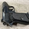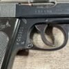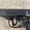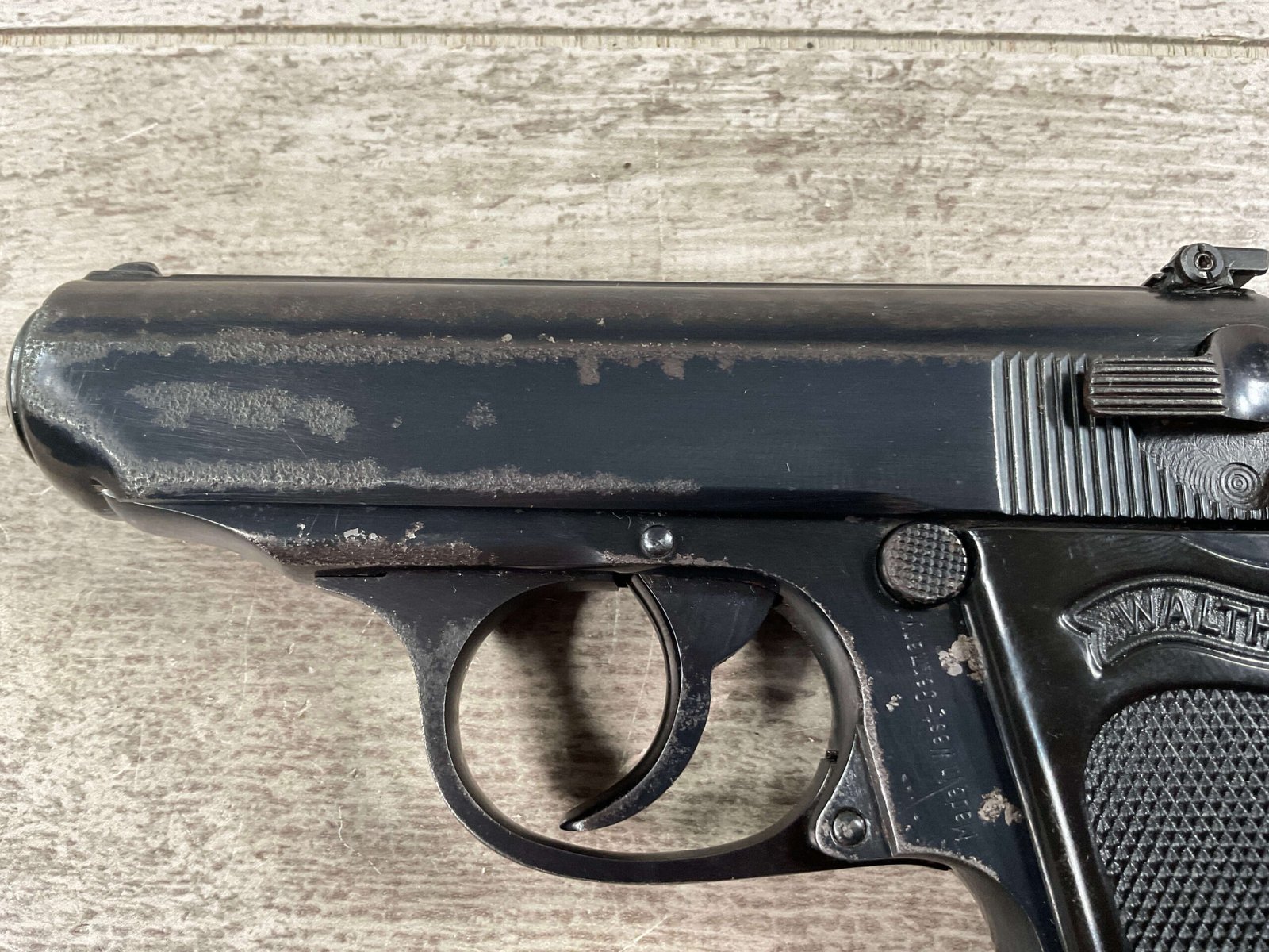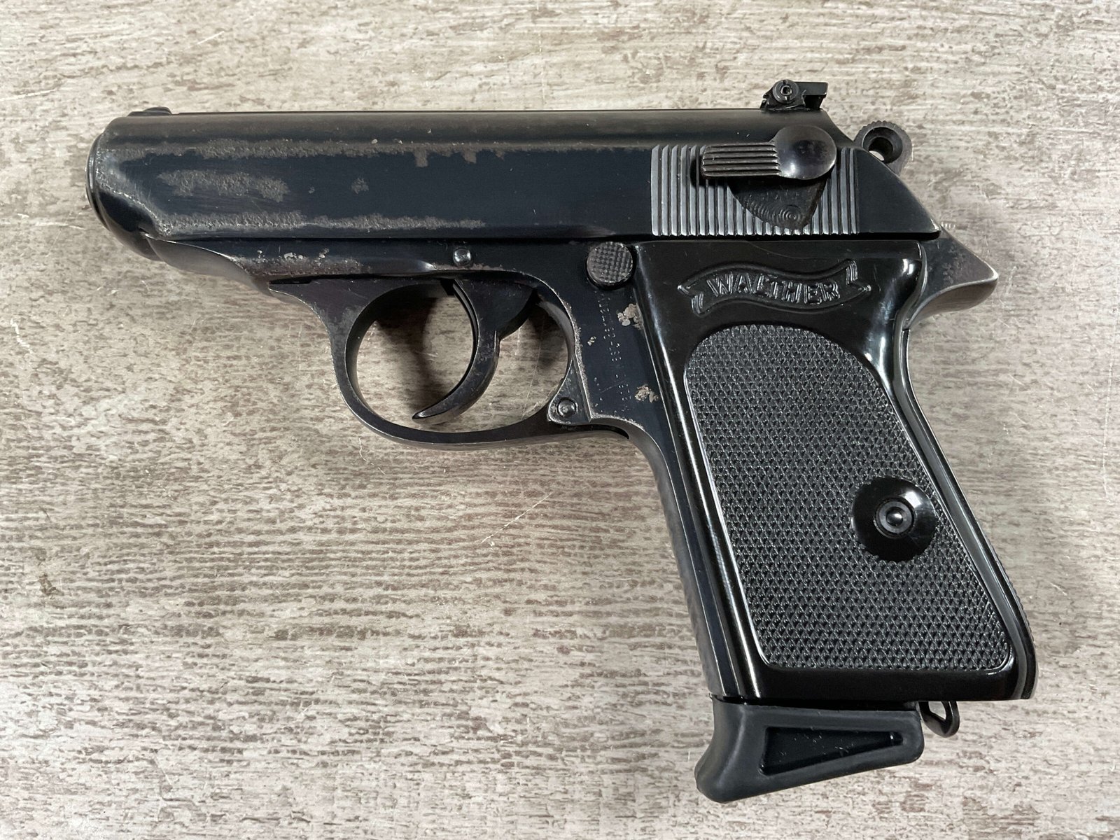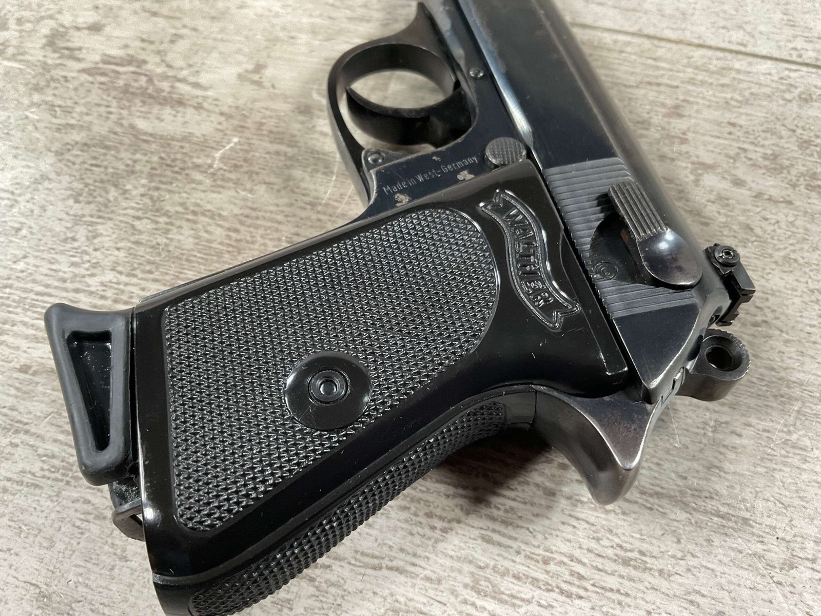 WALTHER PPK BLANK SLIDE MADE IN WEST GERMANY MARKED .380ACP (9mm KURZ) PISTOL #118190A, 3 3/8″ BBL, EXC MINTY BORE & RIFLING (10/10), VG BLACK PLASTIC WALTHER GRIPS, LEFT SIDE OF SLIDE IS BLANK, RIGH SIDE OF SLIDE HAS SERIAL NUMBER, MATCHING, HORNS 66 ON BARREL (1966), LEFT SIDE OF SLIDE HAS AREAS OF PITTING, TWO SMALL AREAS OF FINISH LOSS BETWEEN TRIGGER AND GRIPS, 3 PLASTIC FINGER EXTENSION MAGAZINES INCLUDE (NO MARKINGS) AND EXCELLENT CONDITION, NO IMPORT MARKS, FIXED FRONT SIGHT, MMC ADJUSTABLE REAR SIGHT, ORIGINAL BLUE, RARE BLANK SLIDE, EALGE/N PROOF MARKED BARREL AND FRAME NEAR SERIAL #, 90% OVERALL