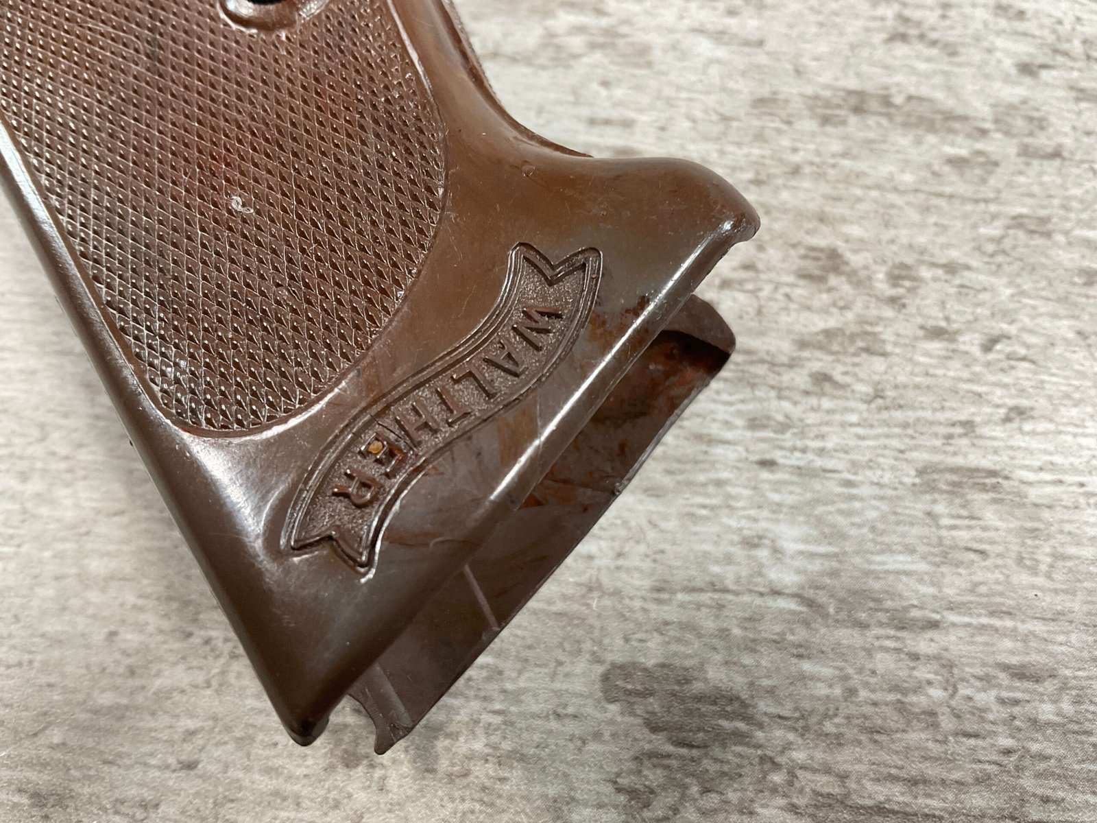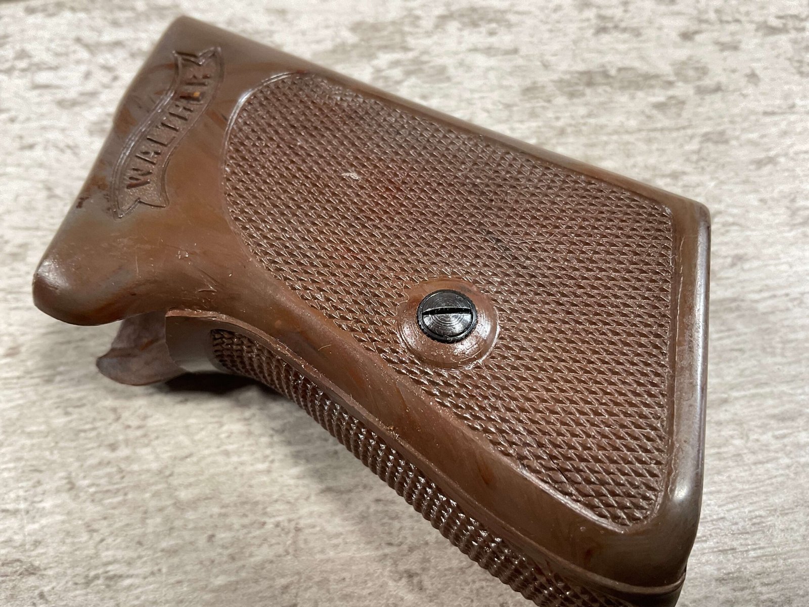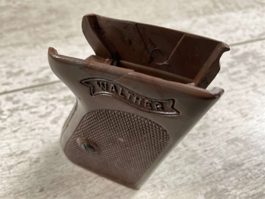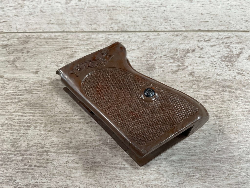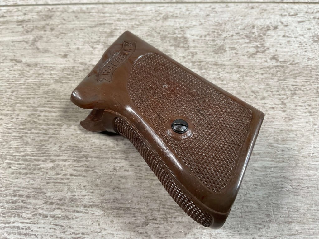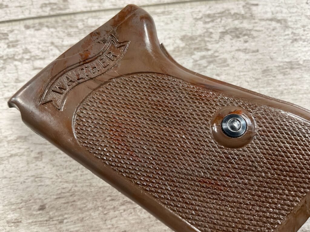 WALTHER PPK .32 AUTO WWII EXC. BROWN 1-PIECE GRIP, A 1/2″ CRACK ABOVE WALTHER BANNER ON RIGHT SIDE, SCREW INCLUDED