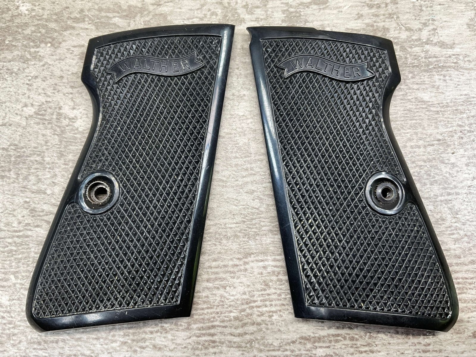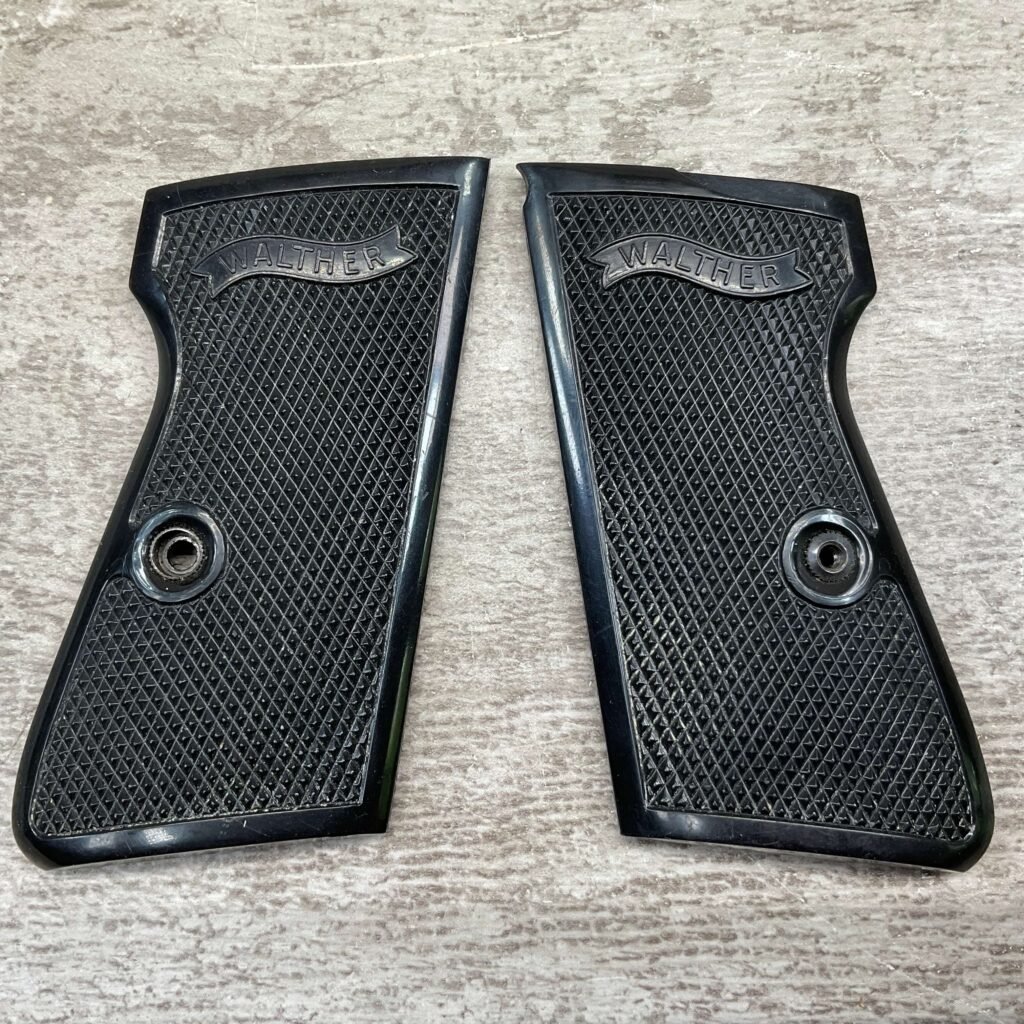 WALTHER REPRODUCTION GRIPS, BLACK PLASTIC GRIPS, IN GREAT CONDITION.