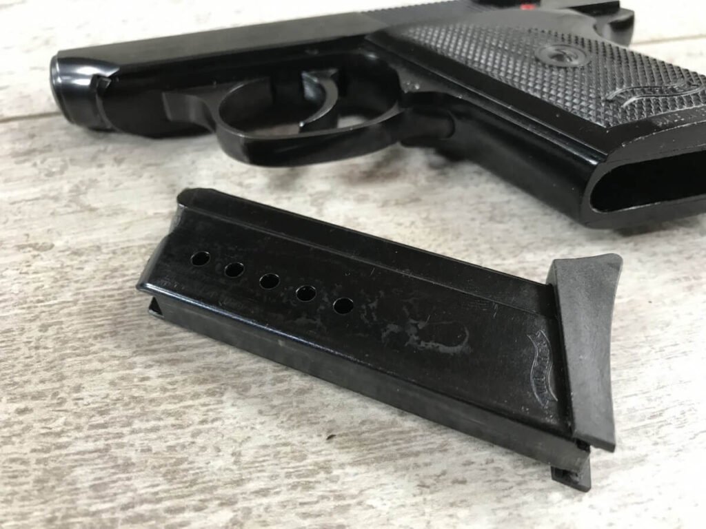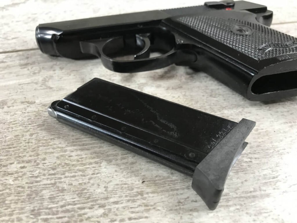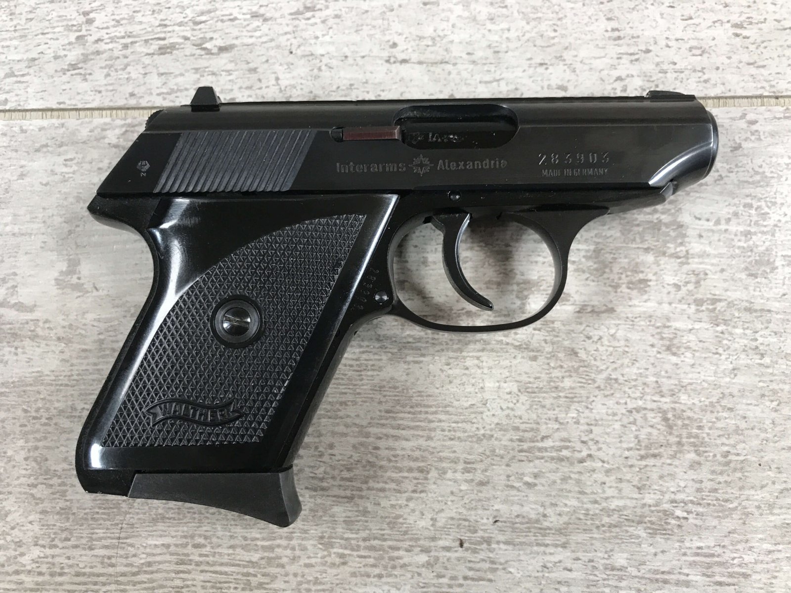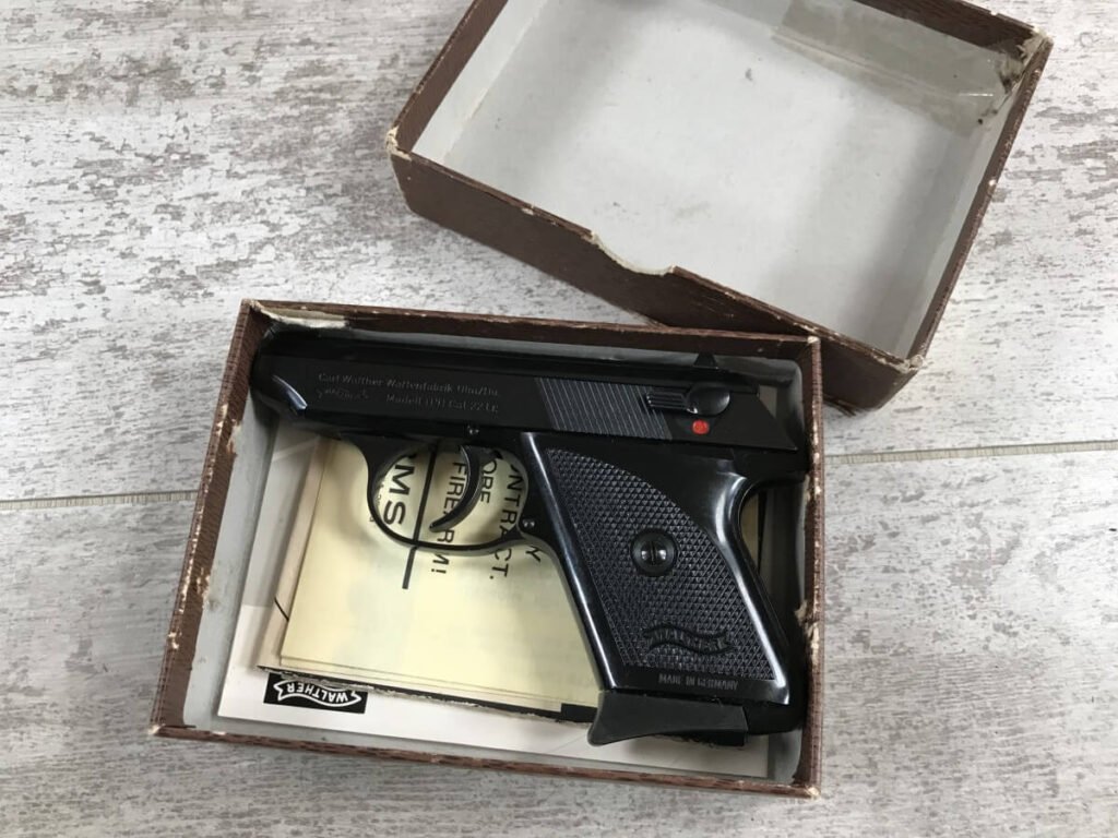 SKU#138 WALTHER TPH .22LR POCKET PISTOL IN BOX W/PAPERWORK #283903, MADE IN GERMANY, INTRA ARMS IMPORT MARKED, 6+1 ROUNDS, 1 MAG, 2″ BARREL, DECOCK/SAFETY, EXC BORE, EXC PLASTIC GRIPS, EXC BLUE FINISH, 98+%