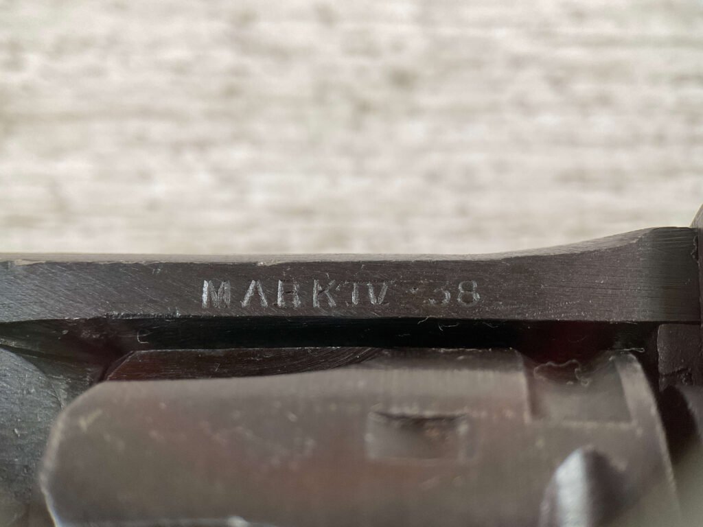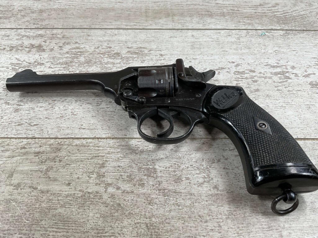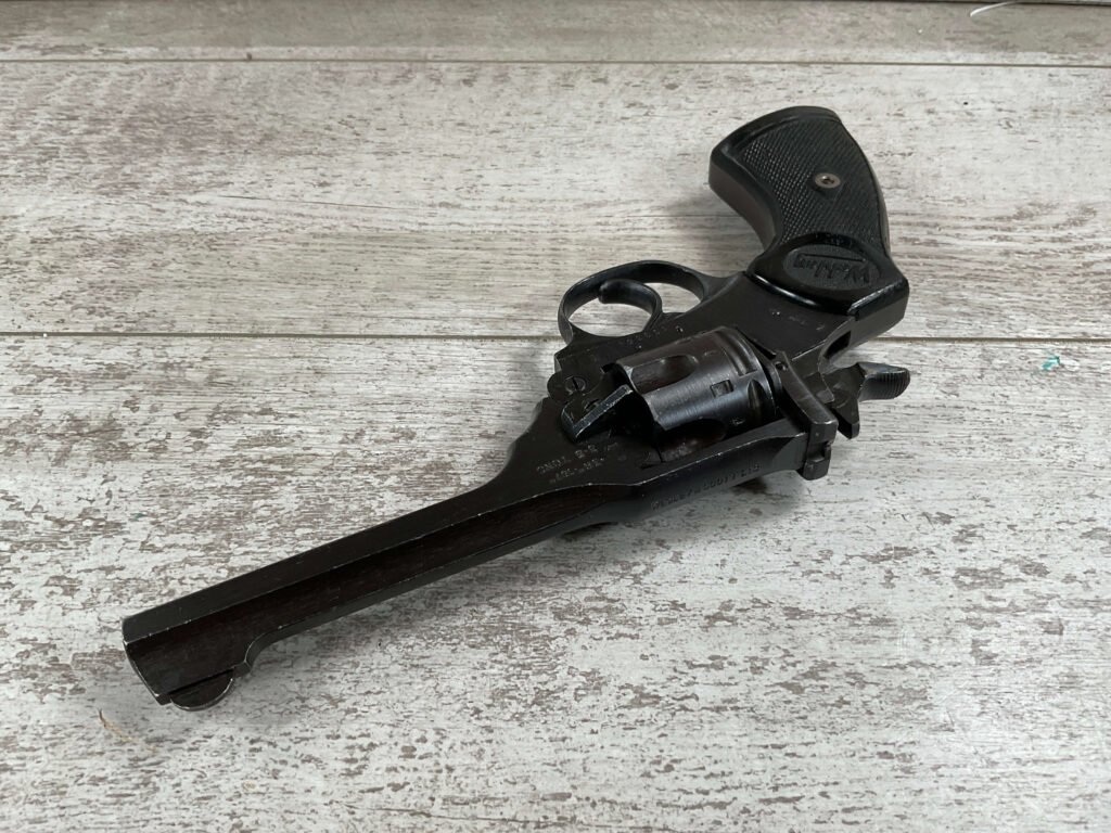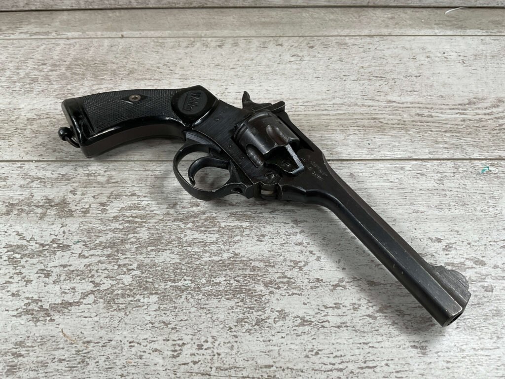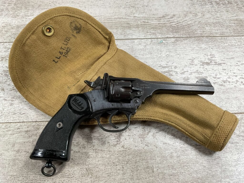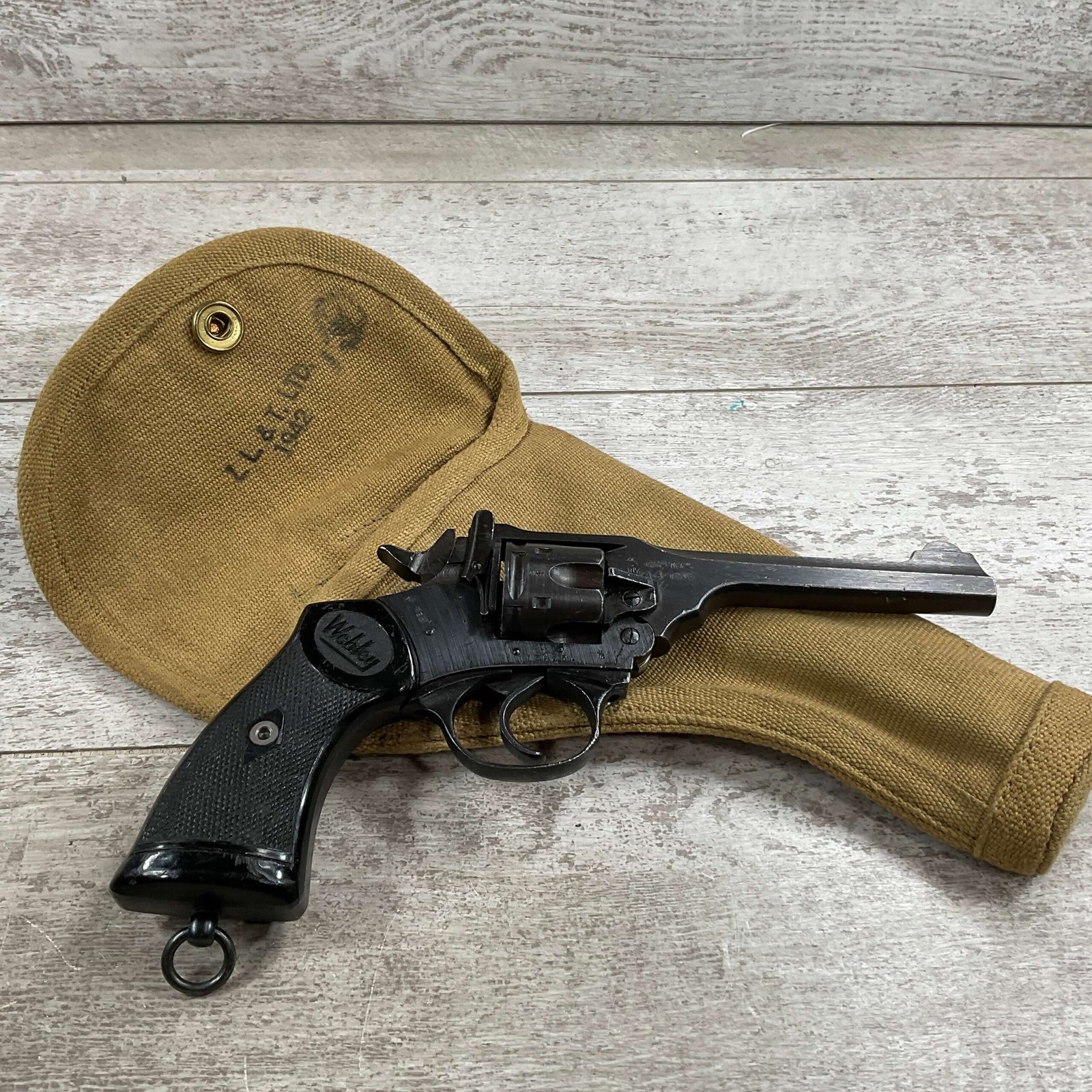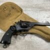 WEBLEY MKIV MARK IV .38-200 REVOLVER W/CANVAS HOLSTER, WAR FINISH #139354, DA, ALL MATCHING, 5″ BBL, EXC BRIGHT BORE & EXC STRONG RIFLING (10/10), EXC BLACK PLASTIC GRIPS MARKED “WEBLEY”, 97+% BLUE, VERY LIGHT HIGH EDGE WEAR, LANYARD RING PRESENT, NO IMPORT MARKS, EXC CANVAS HOLSTER MARKED “LL&T.LTD./1942” INSIDE FLAP, 98%
