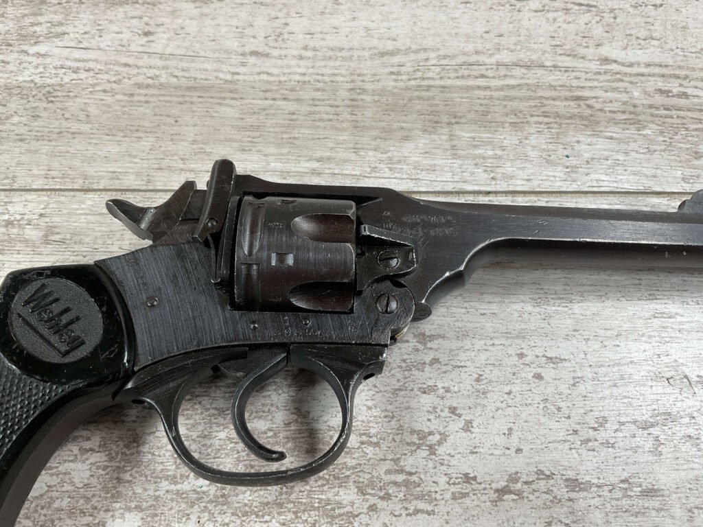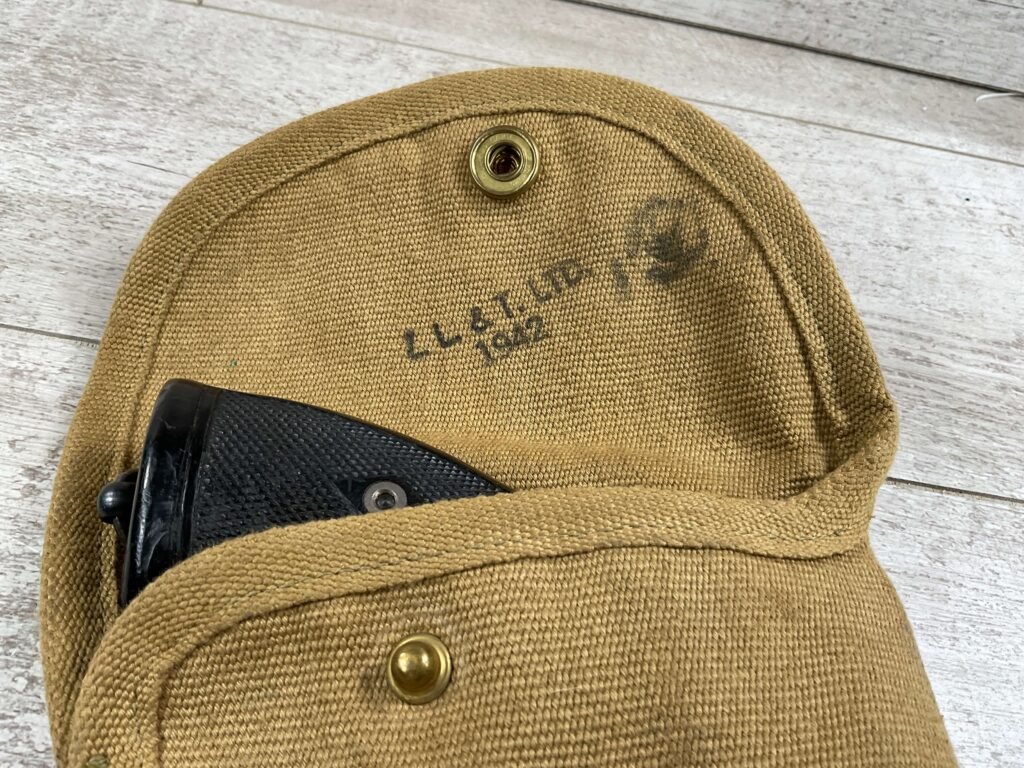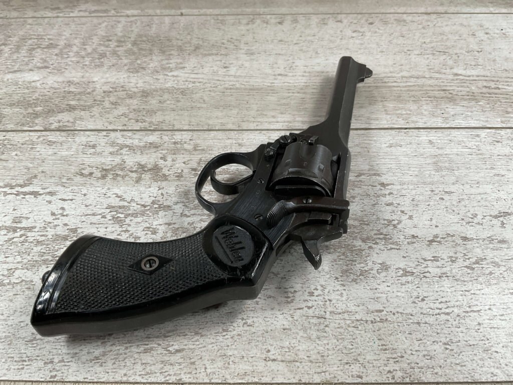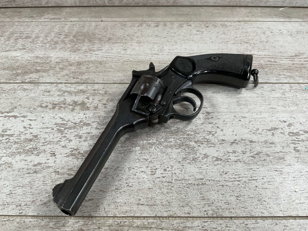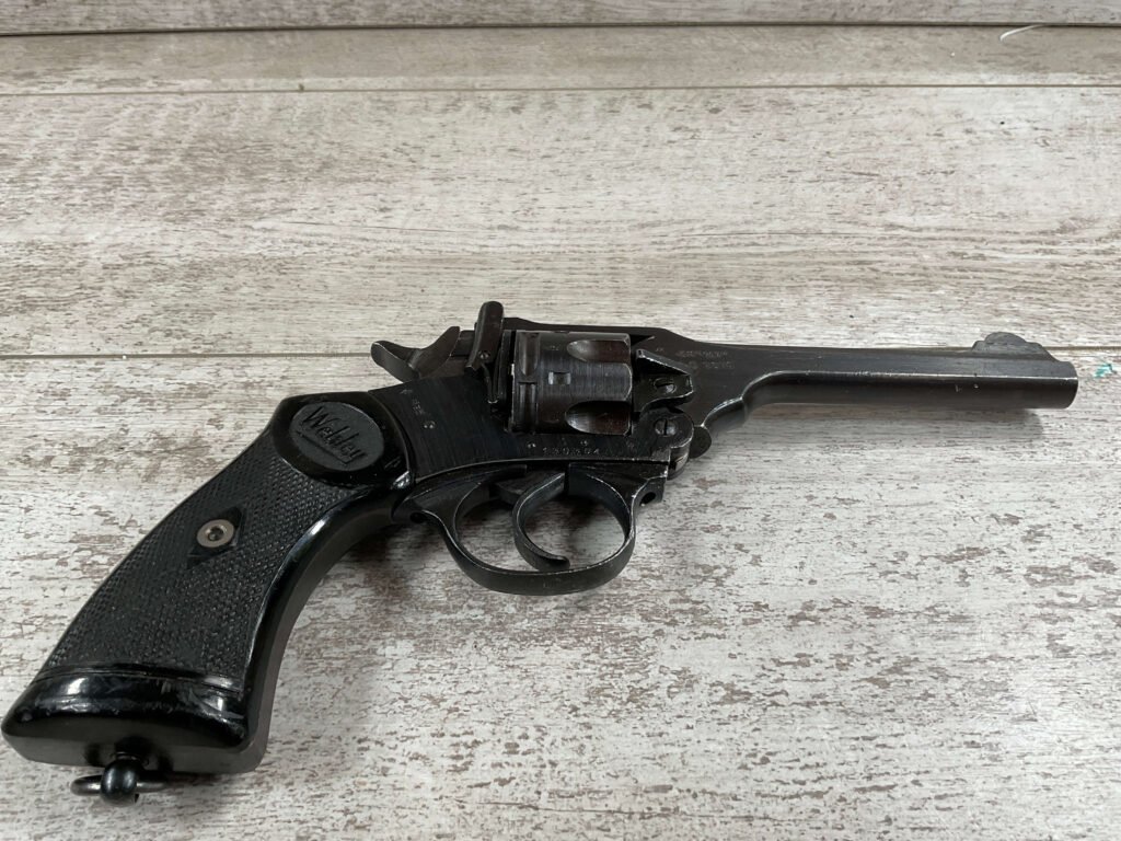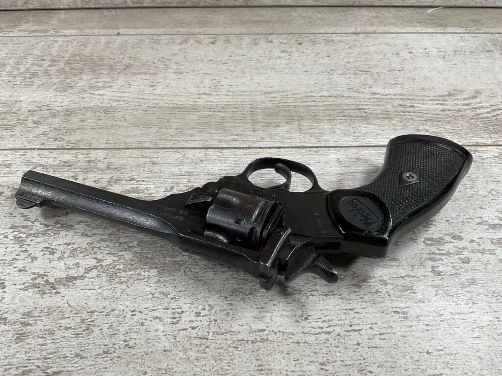 WEBLEY MKIV MARK IV .38-200 REVOLVER W/CANVAS HOLSTER, WAR FINISH #139354, DA, ALL MATCHING, 5″ BBL, EXC BRIGHT BORE & EXC STRONG RIFLING (10/10), EXC BLACK PLASTIC GRIPS MARKED “WEBLEY”, 97+% BLUE, VERY LIGHT HIGH EDGE WEAR, LANYARD RING PRESENT, NO IMPORT MARKS, EXC CANVAS HOLSTER MARKED “LL&T.LTD./1942” INSIDE FLAP, 98%