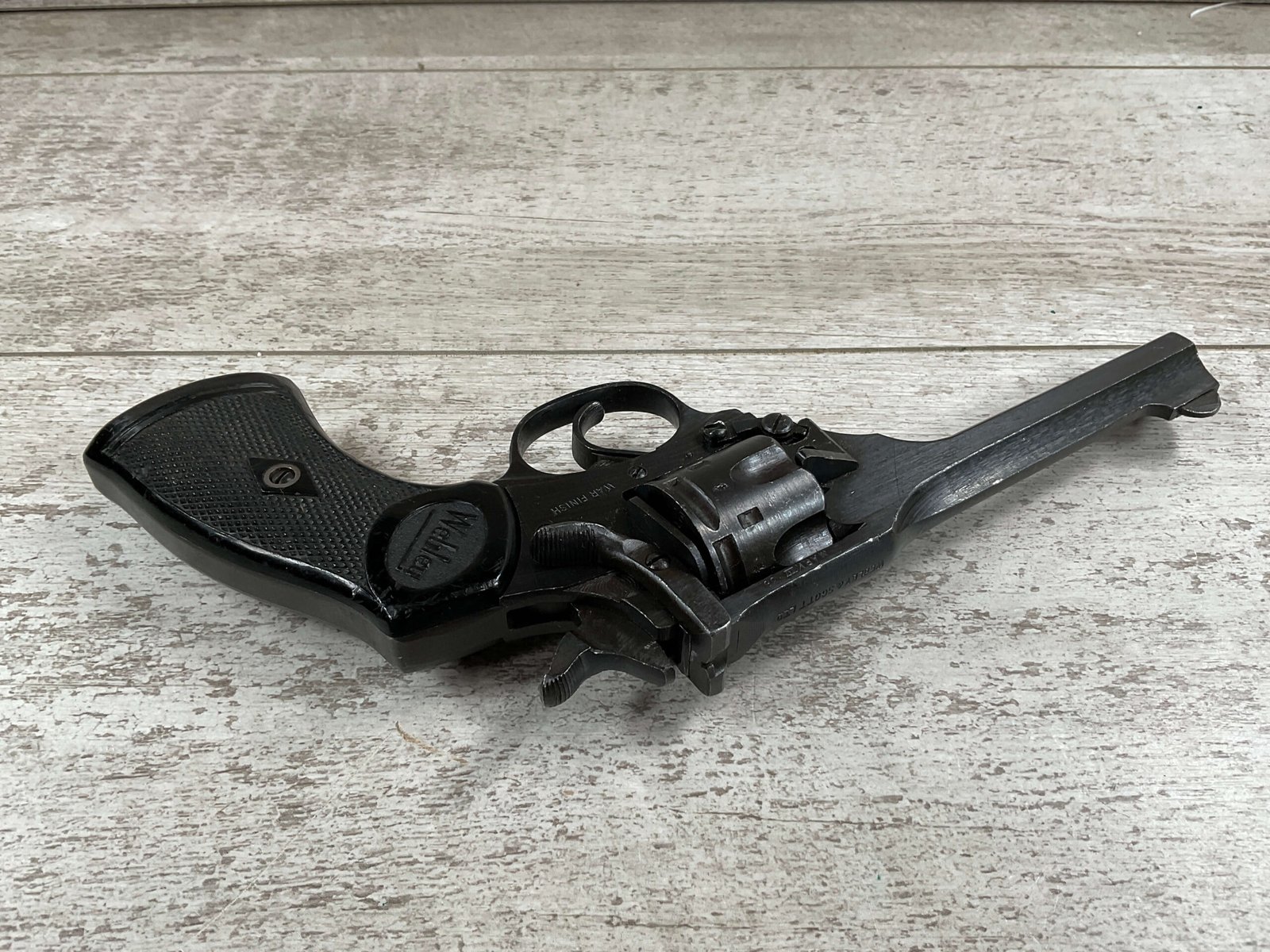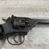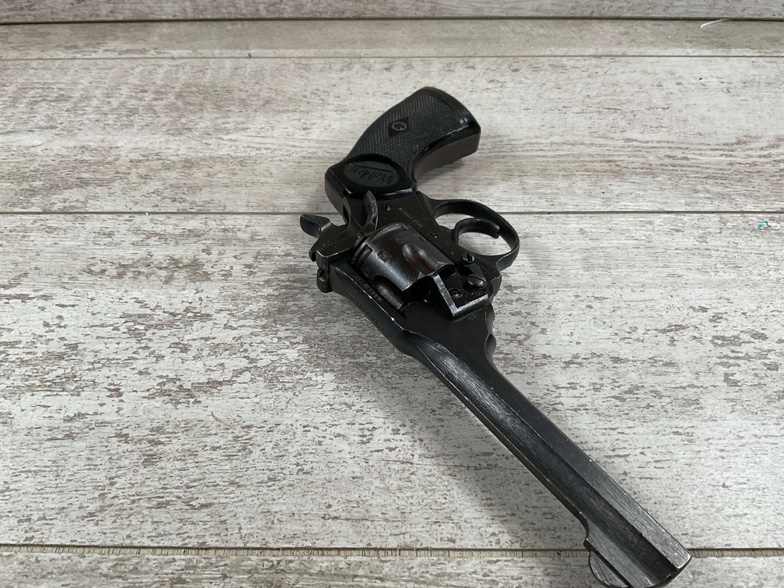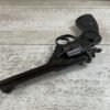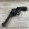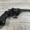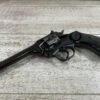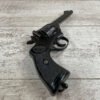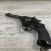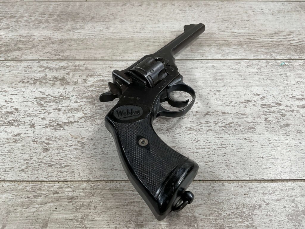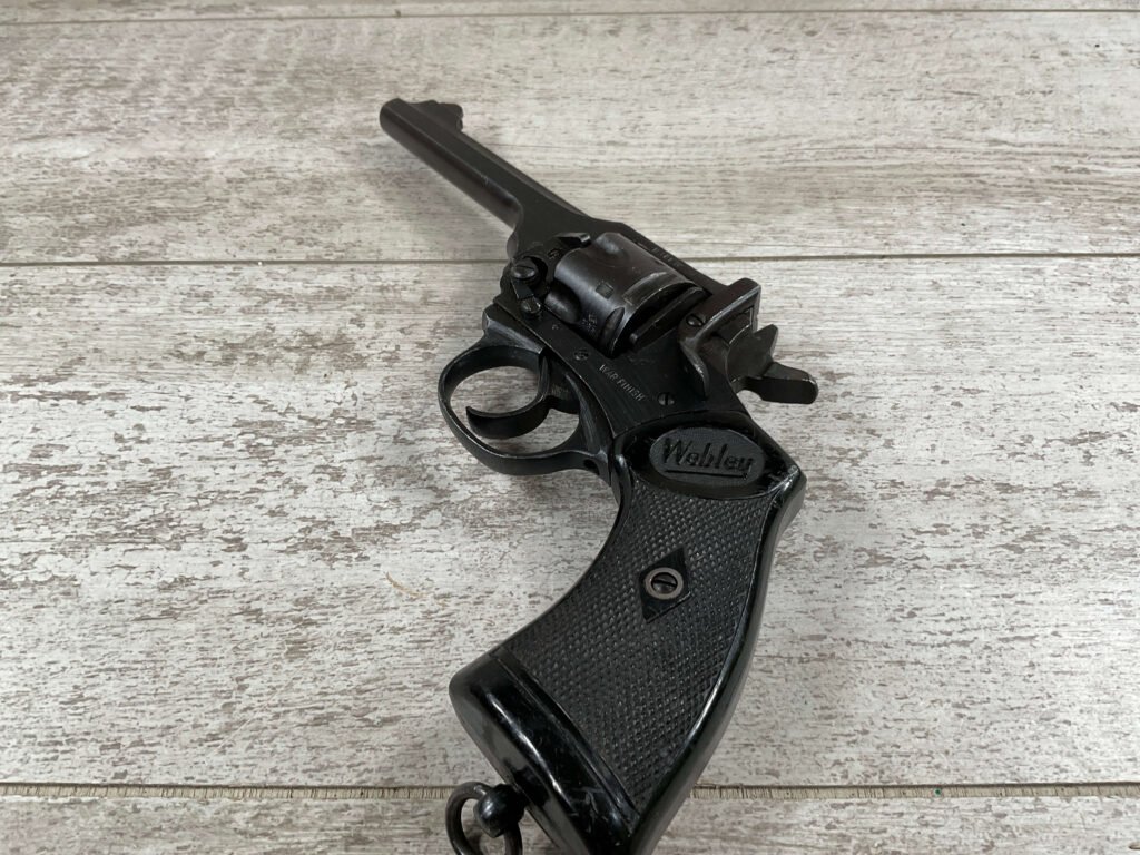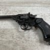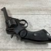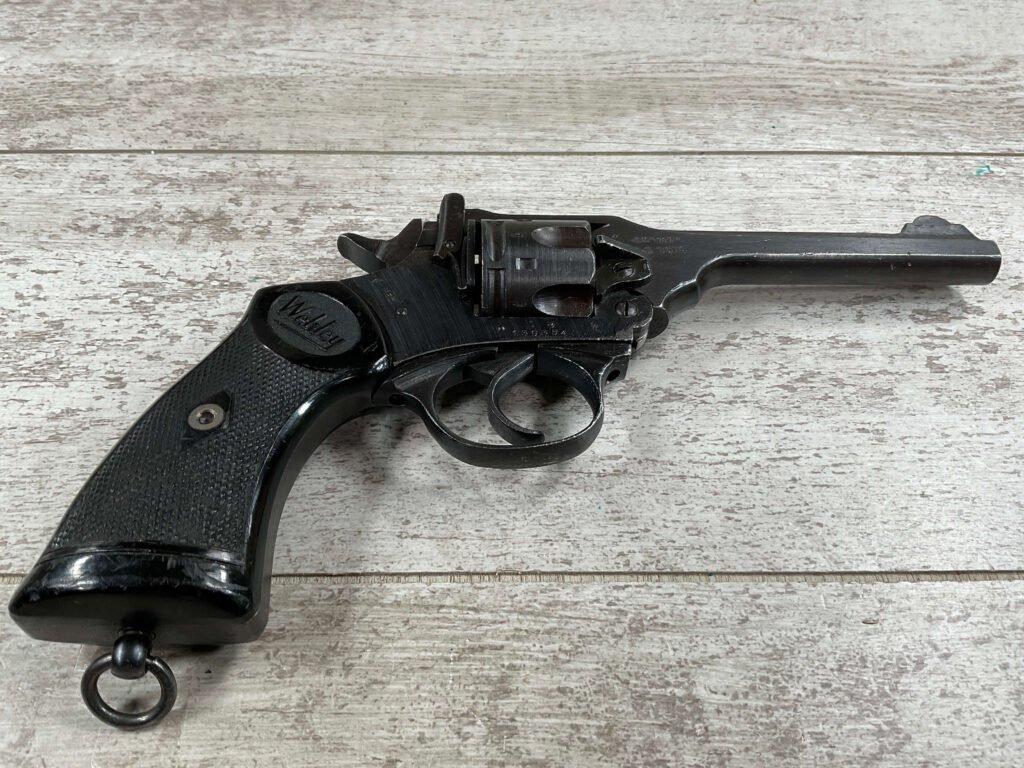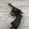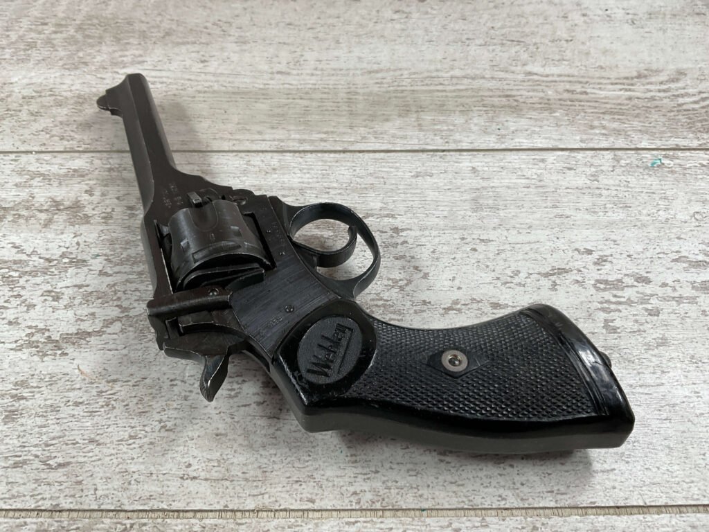 WEBLEY MKIV MARK IV .38-200 REVOLVER W/CANVAS HOLSTER, WAR FINISH #139354, DA, ALL MATCHING, 5″ BBL, EXC BRIGHT BORE & EXC STRONG RIFLING (10/10), EXC BLACK PLASTIC GRIPS MARKED “WEBLEY”, 97+% BLUE, VERY LIGHT HIGH EDGE WEAR, LANYARD RING PRESENT, NO IMPORT MARKS, EXC CANVAS HOLSTER MARKED “LL&T.LTD./1942” INSIDE FLAP, 98%